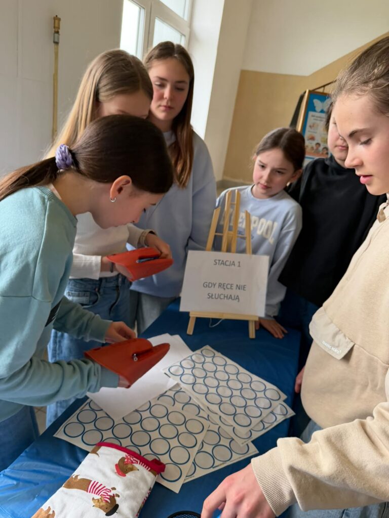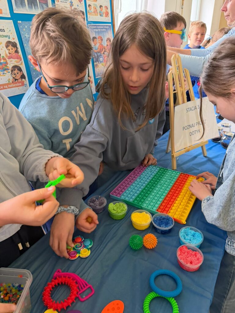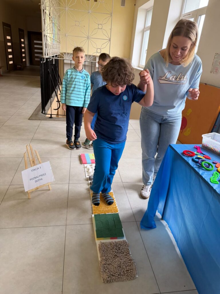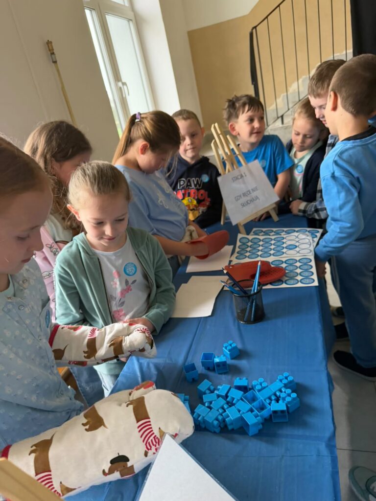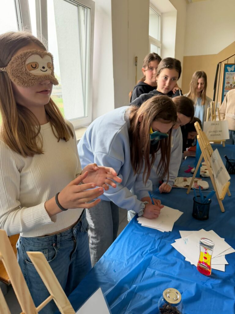 Kolejnym etapem były zajęcia praktyczne w formie stacji zadaniowych. Uczniowie mieli możliwość doświadczenia różnych bodźców i lepszego zrozumienia, jak osoby w spektrum mogą odbierać świat. Przygotowane zostały m.in. stacja dotyku, wzroku, stacja sensoryczna oraz ścieżka sensoryczna, które cieszyły się dużym zainteresowaniem i zaangażowaniem uczniów.