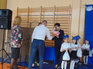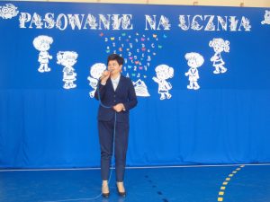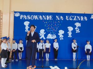 i nauczycielom. Po złożeniu ślubowania pani dyrektor Beata Chrustowicz dokonała uroczystego pasowania na ucznia, przyjmując tym samym w szeregi społeczności szkolnej kolejnych 18 uczniów. Wszystkie dzieci otrzymały dyplomy
