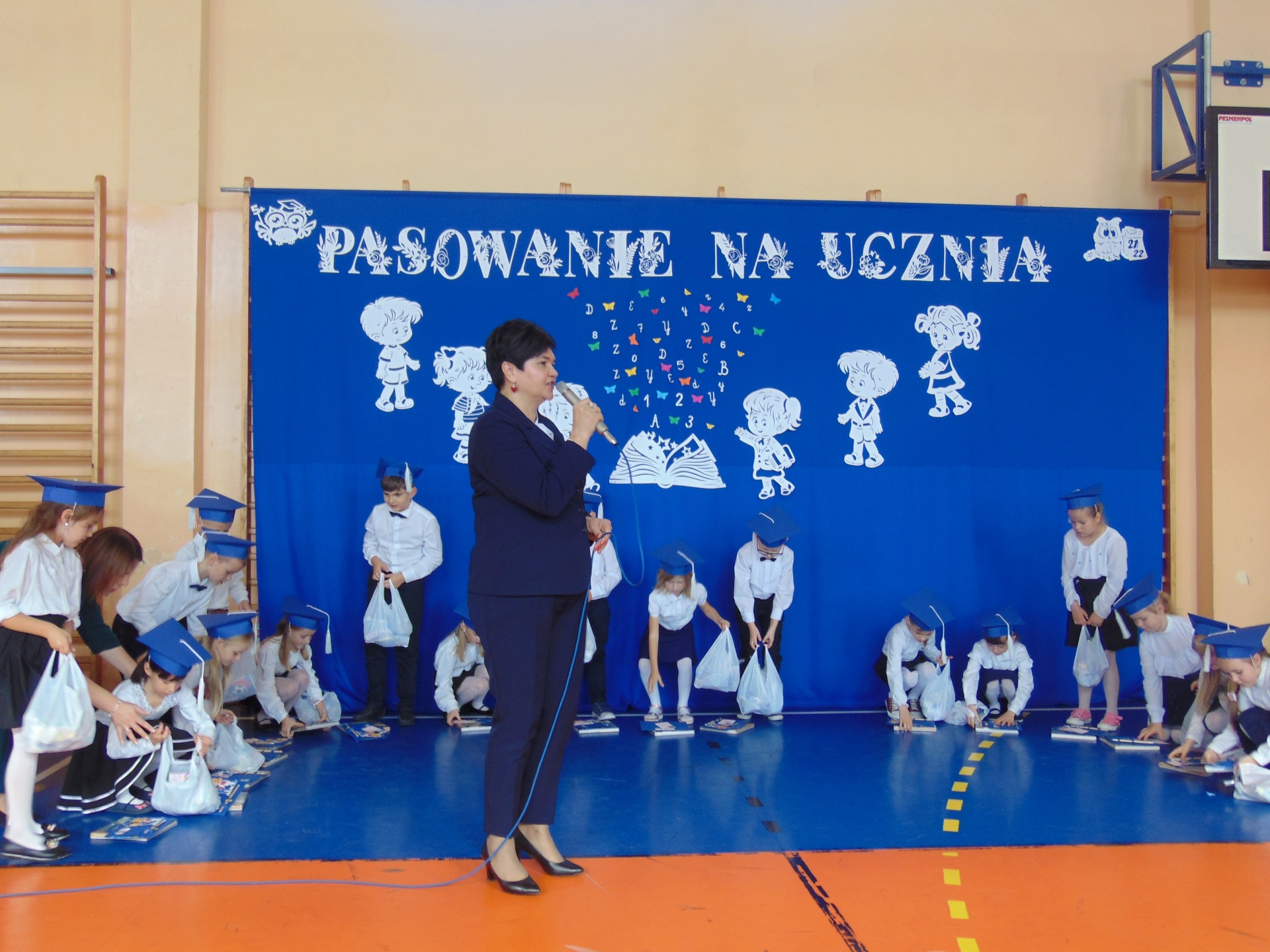 i nauczycielom. Po złożeniu ślubowania pani dyrektor Beata Chrustowicz dokonała uroczystego pasowania na ucznia, przyjmując tym samym w szeregi społeczności szkolnej kolejnych 18 uczniów. Wszystkie dzieci otrzymały dyplomy