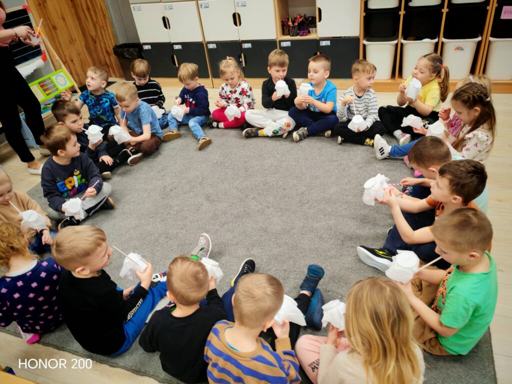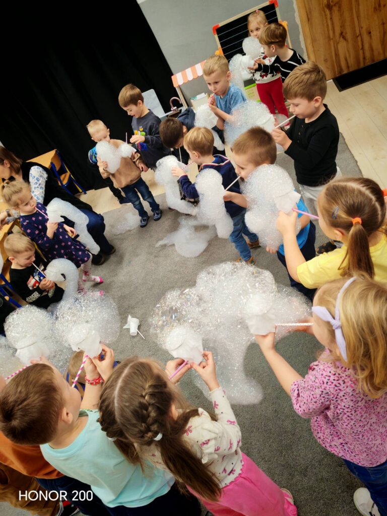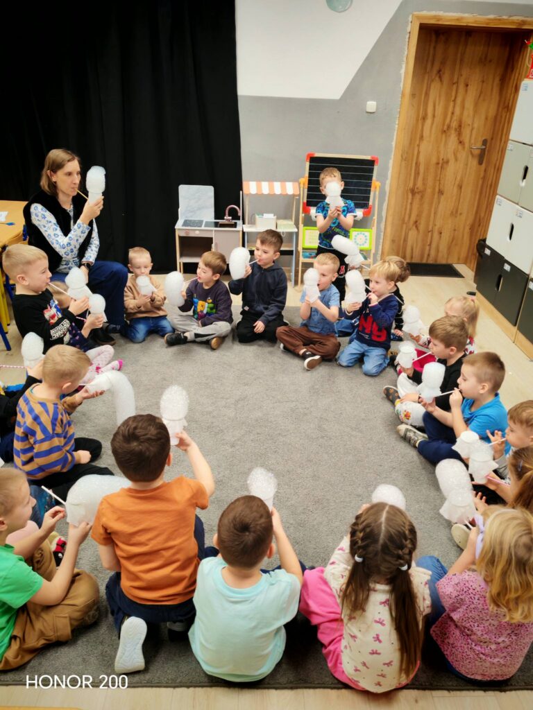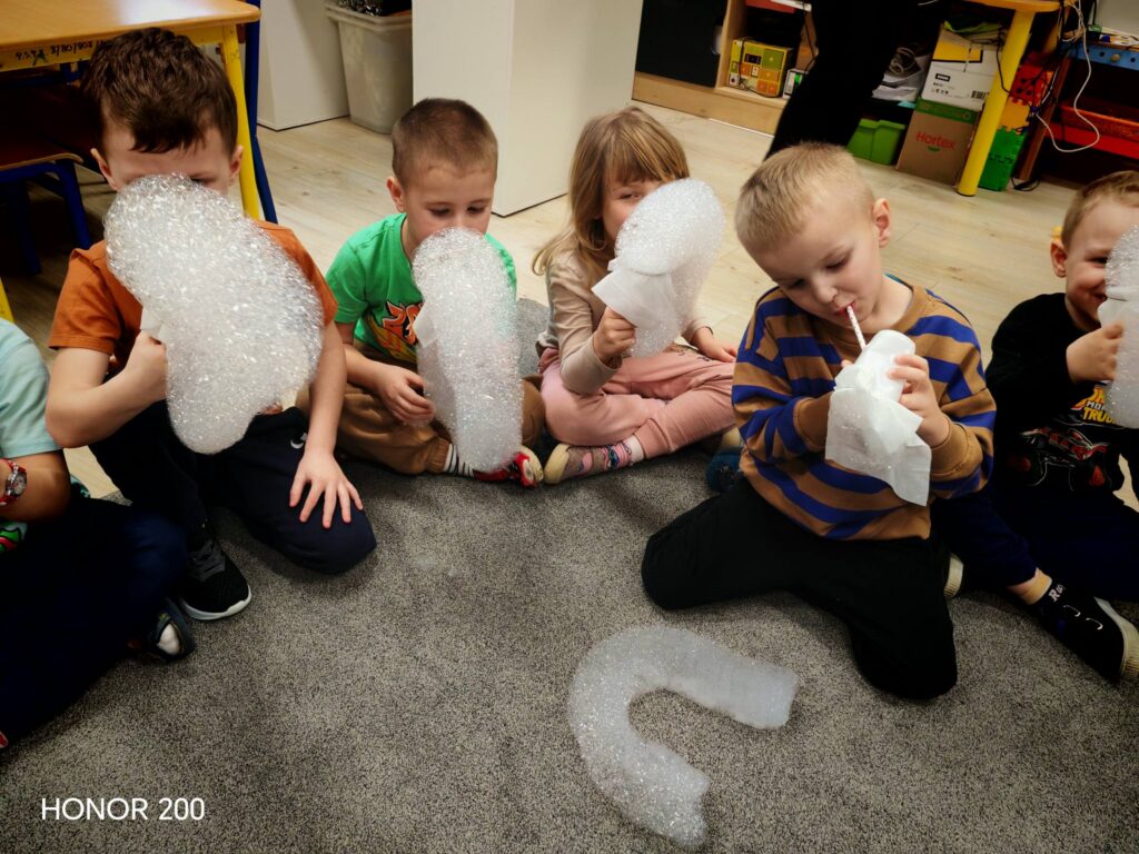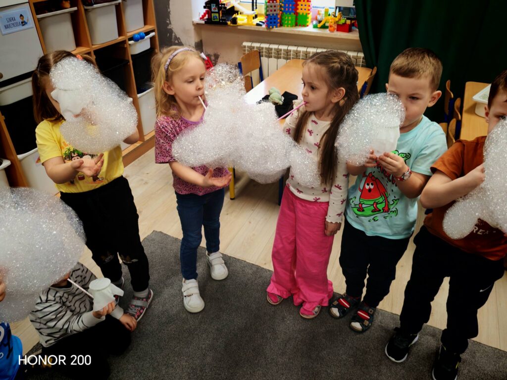 Podczas zajęć ćwiczyliśmy prawidłowy oddech, dmuchając przez słomkę stworzyliśmy ogromną pianę. Z niej powstały wyjątkowe Pianostwory!