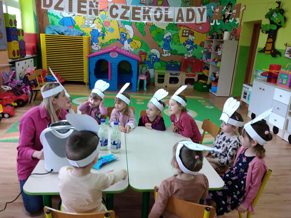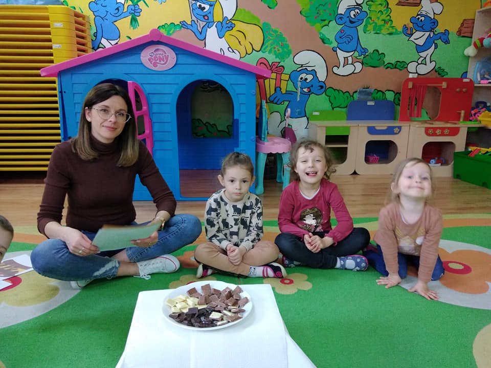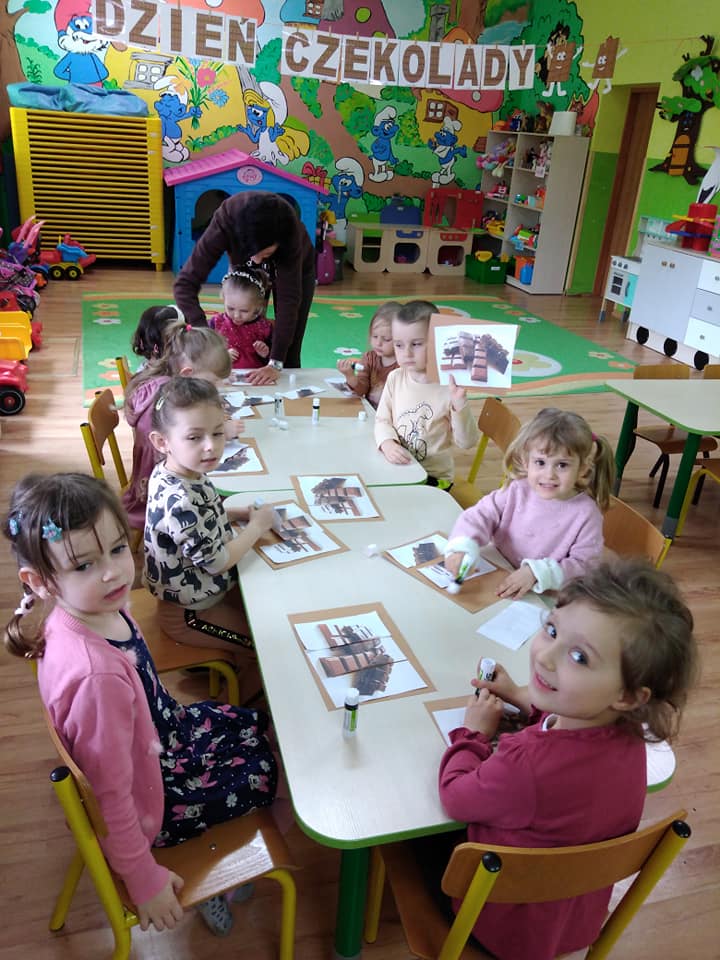 W naszym przedszkolu obchodziliśmy ostatnio ŚWIATOWY DZIEŃ CZEKOLADY. Dzieci w znakomitym humorze, od rana pełne chęci i zapału do zgłębiania wiedzy na temat czekolady ułożyły czekoladowe puzzle i zatańczyły szalony taniec ,, Chocolate”. Następnie obejrzały film edukacyjny ,, W fabryce czekolady ” i dowiedziały się jak powstaje ich ulubiony przysmak. W końcu Smerfiki miały okazję do degustacji różnych rodzajów czekolad : mlecznej, deserowej, białej, nadziewanej i z orzechami.