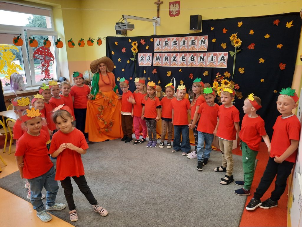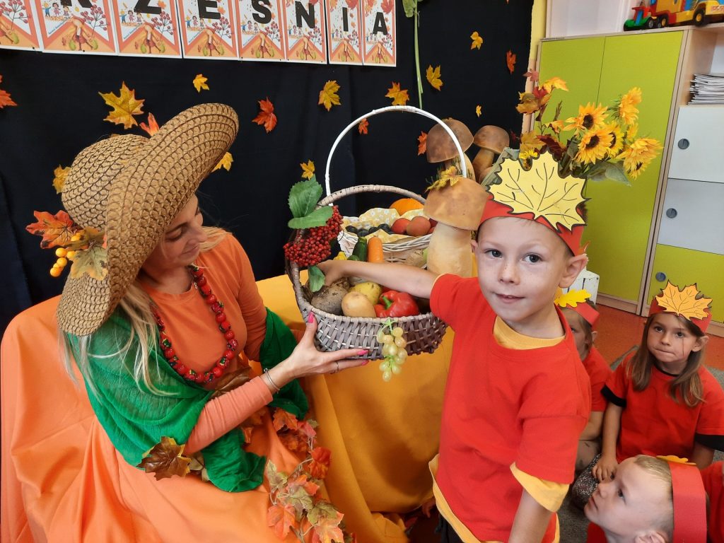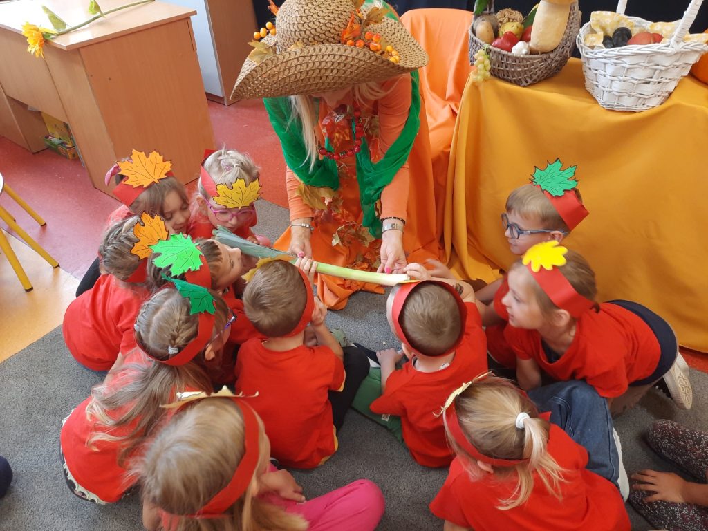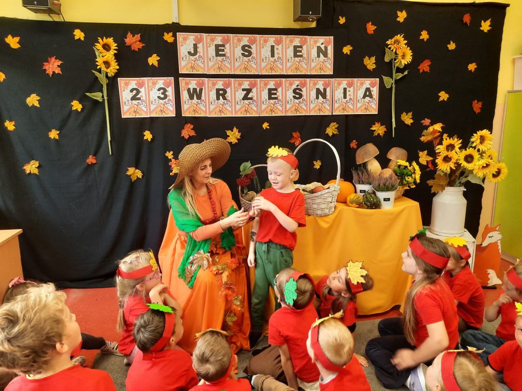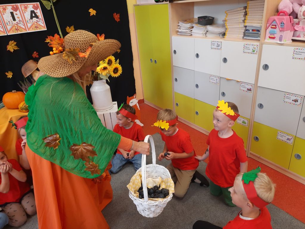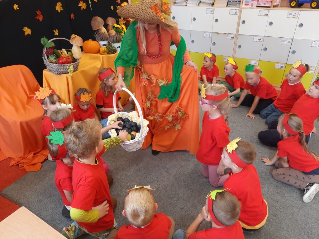 Dnia 23 września w grupie Starszaków można było spotkać Panią Jesień, która zawitała również do naszej sali i przyniosła koszyk pełen jesiennych darów. Dzieci zastanawiały się, co jest w koszyku. Odgadywały jesienne zagadki, rozpoznawały dary jesieni poprzez dotyk, segregowały je według rodzaju. Pani Jesień przedstawiając się opowiedziała dzieciom o sobie wymieniając charakterystyczne cechy jesieni. Wspólnie z dziećmi bawiła się, a na zakończenie zabrzmiała wesoła piosenka. Żegnając się z dziećmi Pani Jesień obiecała, że wróci w przyszłym roku.