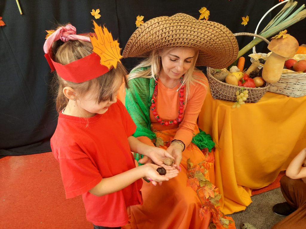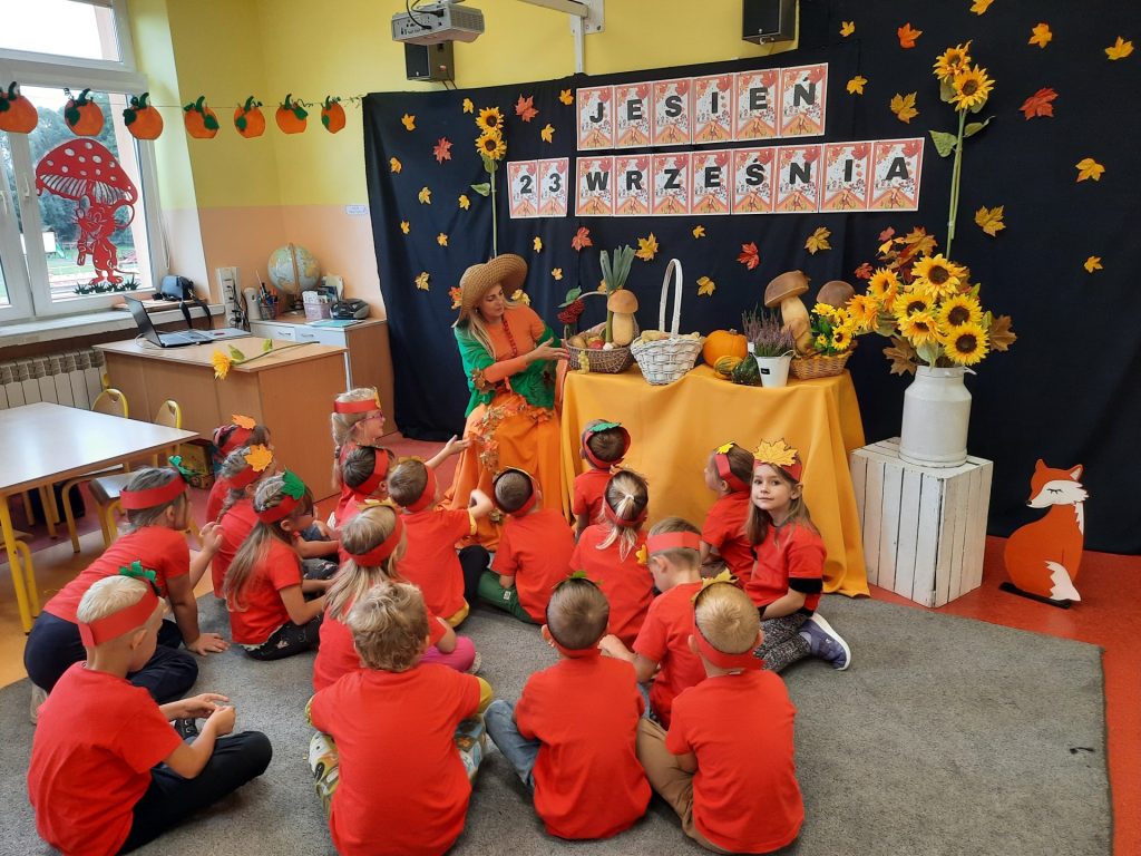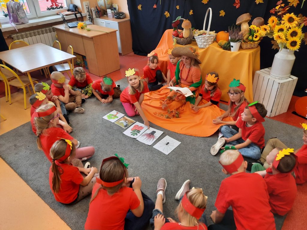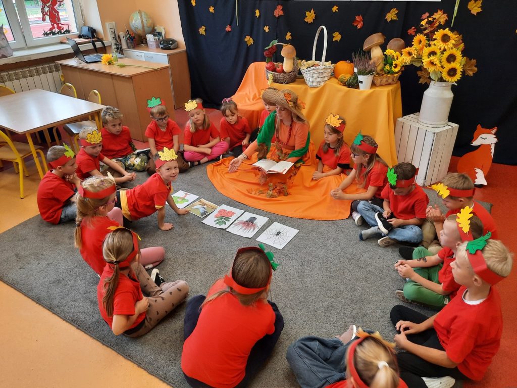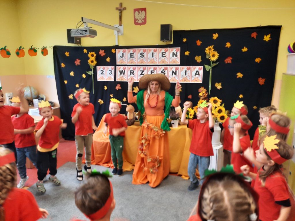 Dnia 23 września w grupie Starszaków można było spotkać Panią Jesień, która zawitała również do naszej sali i przyniosła koszyk pełen jesiennych darów. Dzieci zastanawiały się, co jest w koszyku. Odgadywały jesienne zagadki, rozpoznawały dary jesieni poprzez dotyk, segregowały je według rodzaju. Pani Jesień przedstawiając się opowiedziała dzieciom o sobie wymieniając charakterystyczne cechy jesieni. Wspólnie z dziećmi bawiła się, a na zakończenie zabrzmiała wesoła piosenka. Żegnając się z dziećmi Pani Jesień obiecała, że wróci w przyszłym roku.