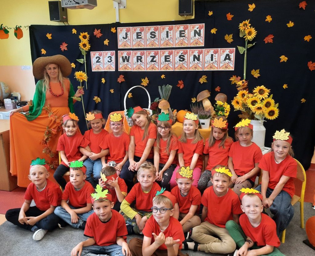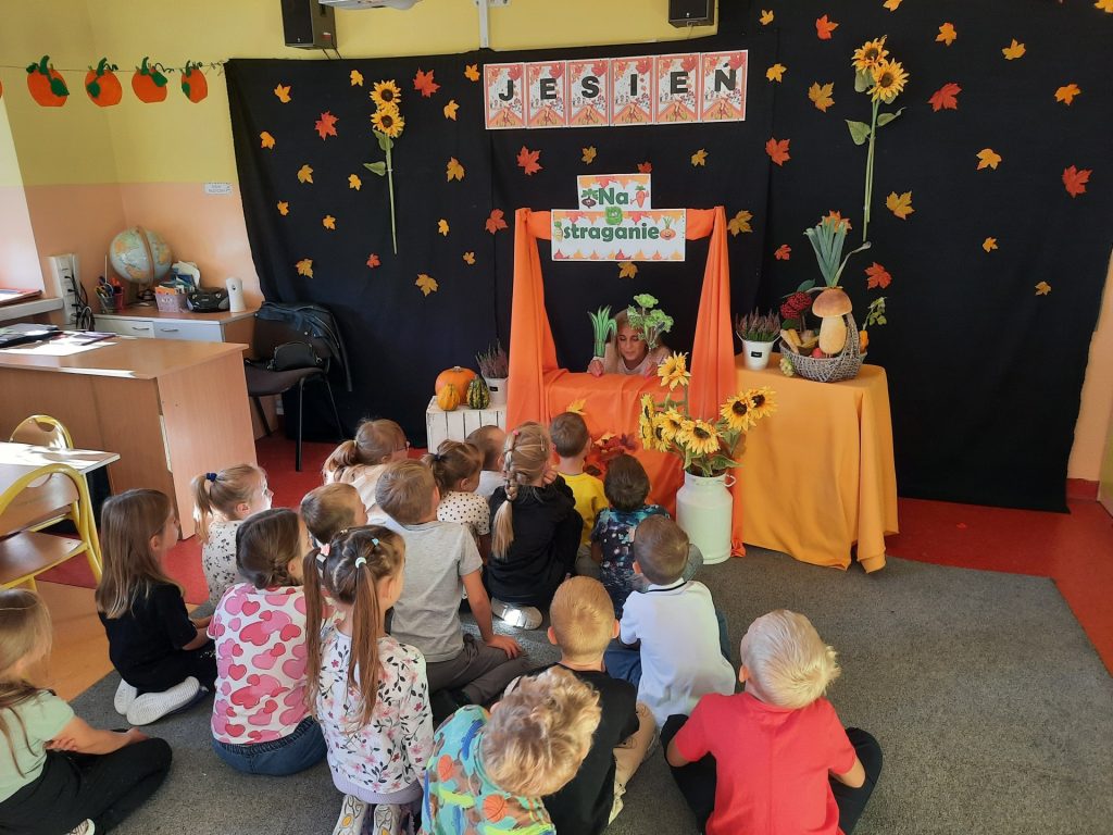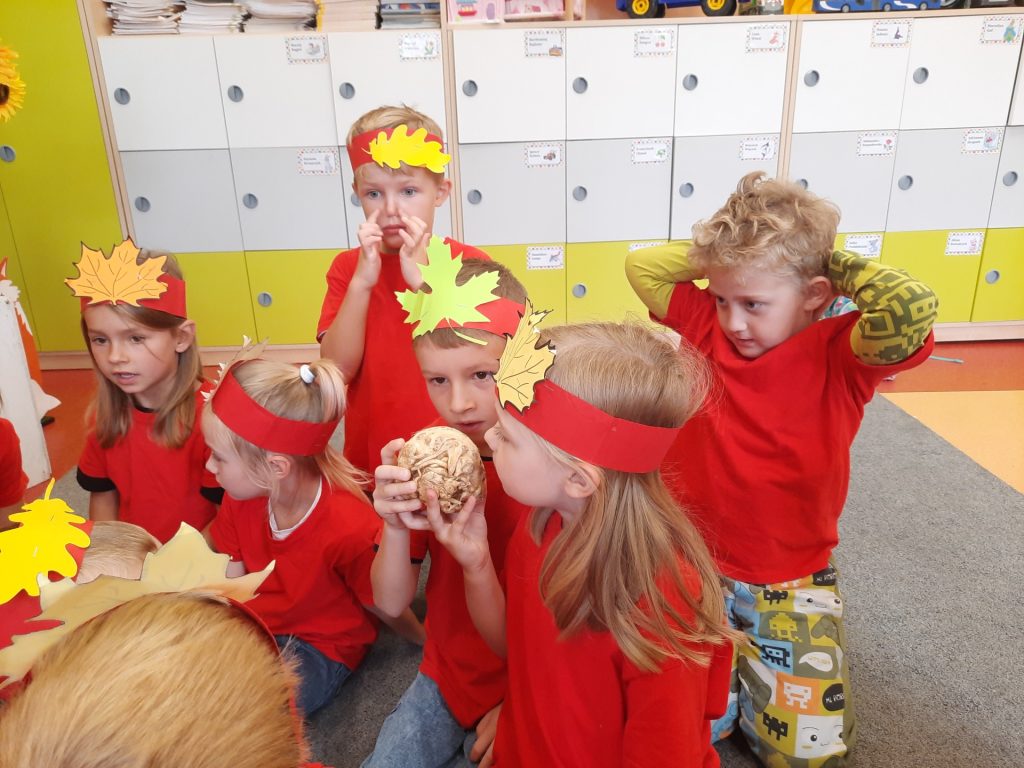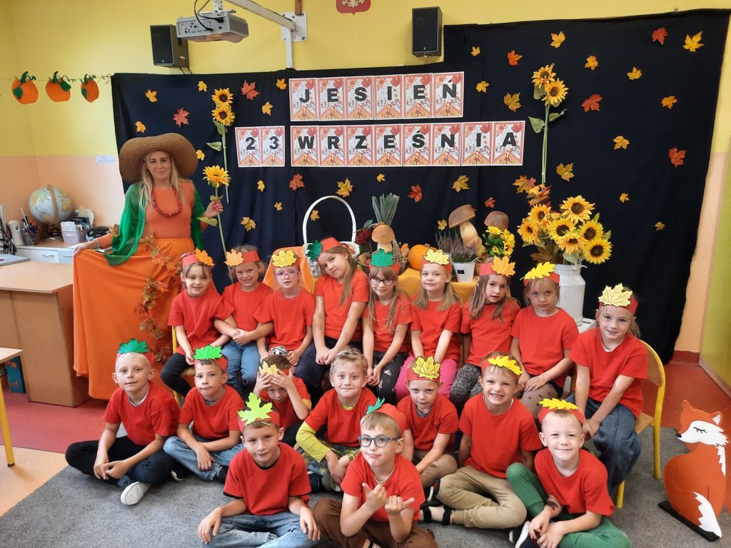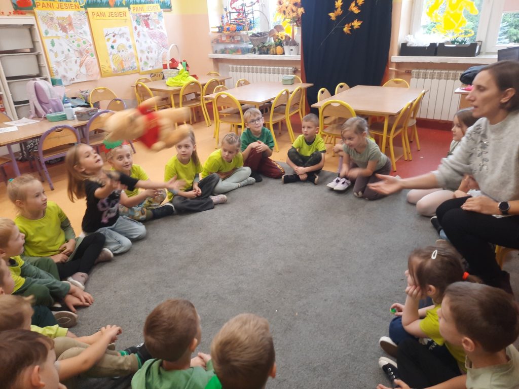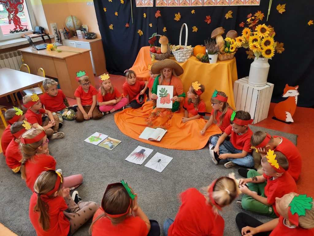 Dnia 23 września w grupie Starszaków można było spotkać Panią Jesień, która zawitała również do naszej sali i przyniosła koszyk pełen jesiennych darów. Dzieci zastanawiały się, co jest w koszyku. Odgadywały jesienne zagadki, rozpoznawały dary jesieni poprzez dotyk, segregowały je według rodzaju. Pani Jesień przedstawiając się opowiedziała dzieciom o sobie wymieniając charakterystyczne cechy jesieni. Wspólnie z dziećmi bawiła się, a na zakończenie zabrzmiała wesoła piosenka. Żegnając się z dziećmi Pani Jesień obiecała, że wróci w przyszłym roku.