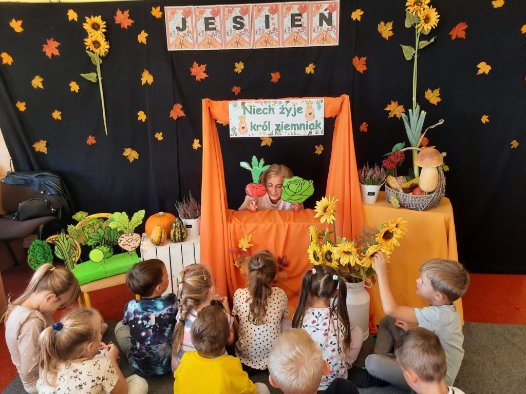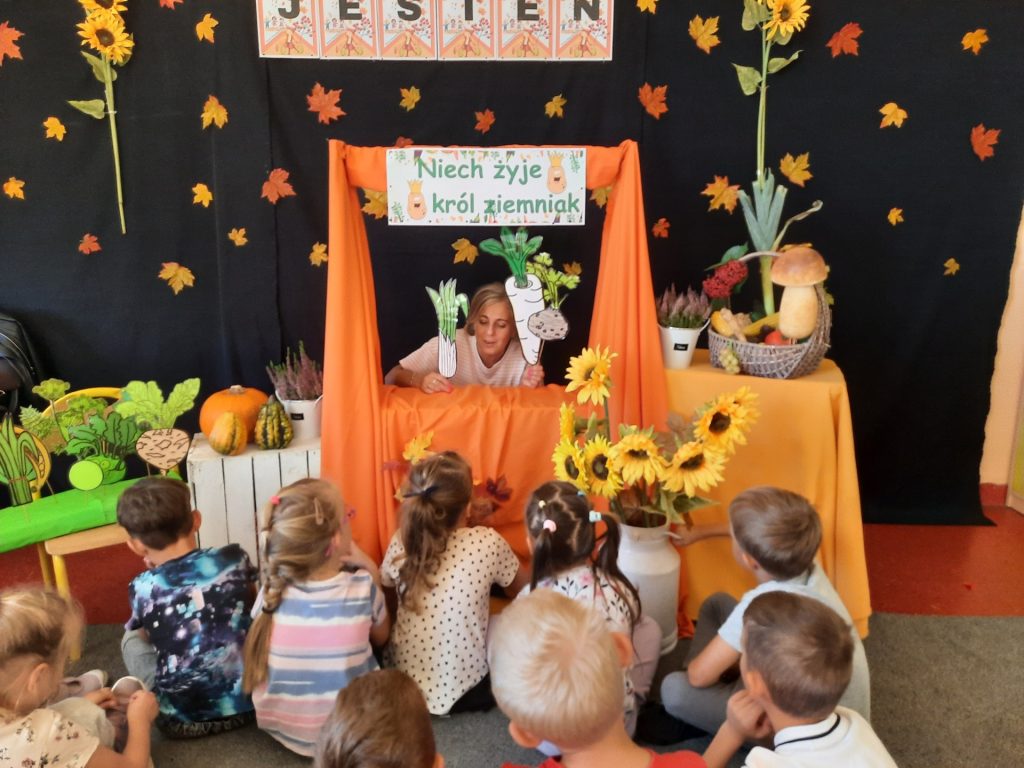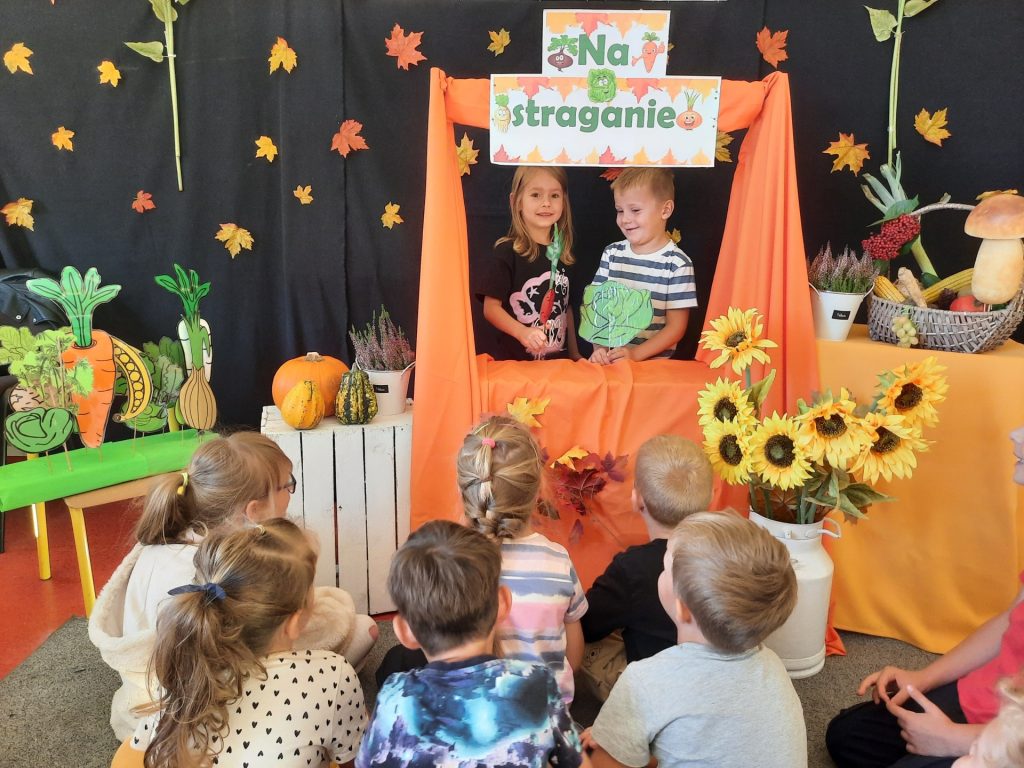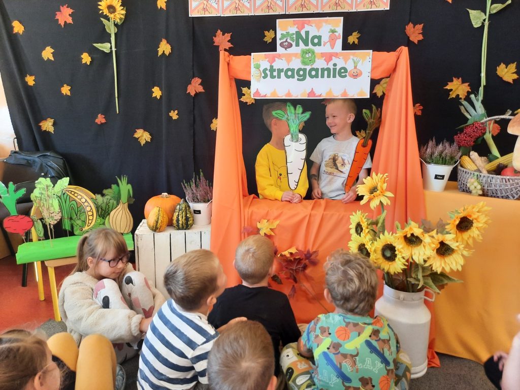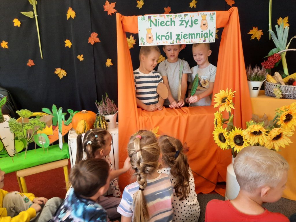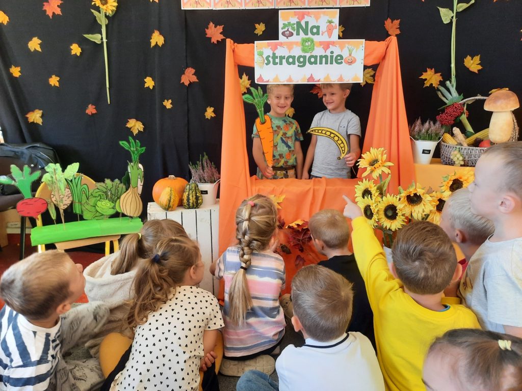 Kontakt dzieci z teatrem to nie tylko oglądanie spektakli, ale przede wszystkim zabawa poprzez , którą nabywają one nowe wiadomości… tym razem z zakresu warzyw ich przetwarzania oraz związanych z nim właściwymi nawykami żywieniowymi. Dlatego też na początku października Starszaki oglądały inscenizację takich wierszy jak „Na straganie”- J. Brzechwy , „Niech żyje król ziemniak!” – E. Stadtmuller przedstawionych przez panią Annę Kupis. Przez kilka kolejnych dni dzieci miały możliwość spróbowania swoich sił i samodzielnie odgrywały wybrane sceny z wierszy z wykorzystaniem papierowych sylwet warzyw. Starszaki prowadziły dialog według własnego pomysłu odpowiednio modelując swój głos.