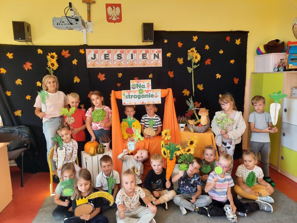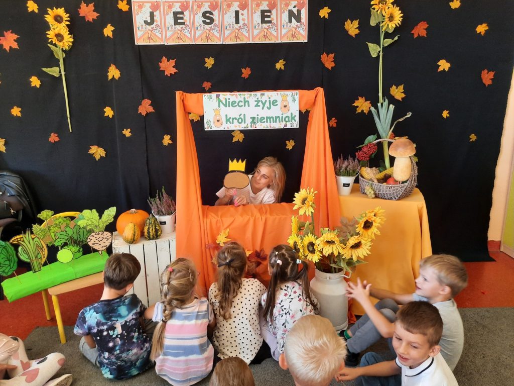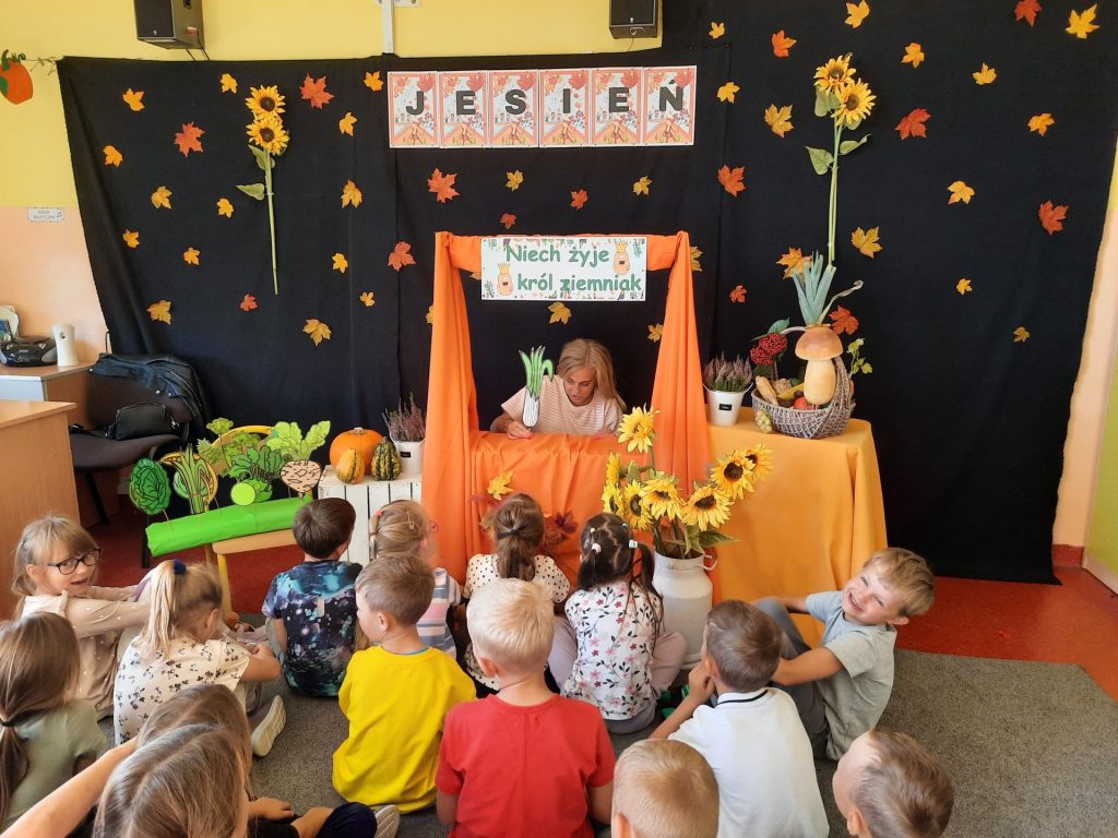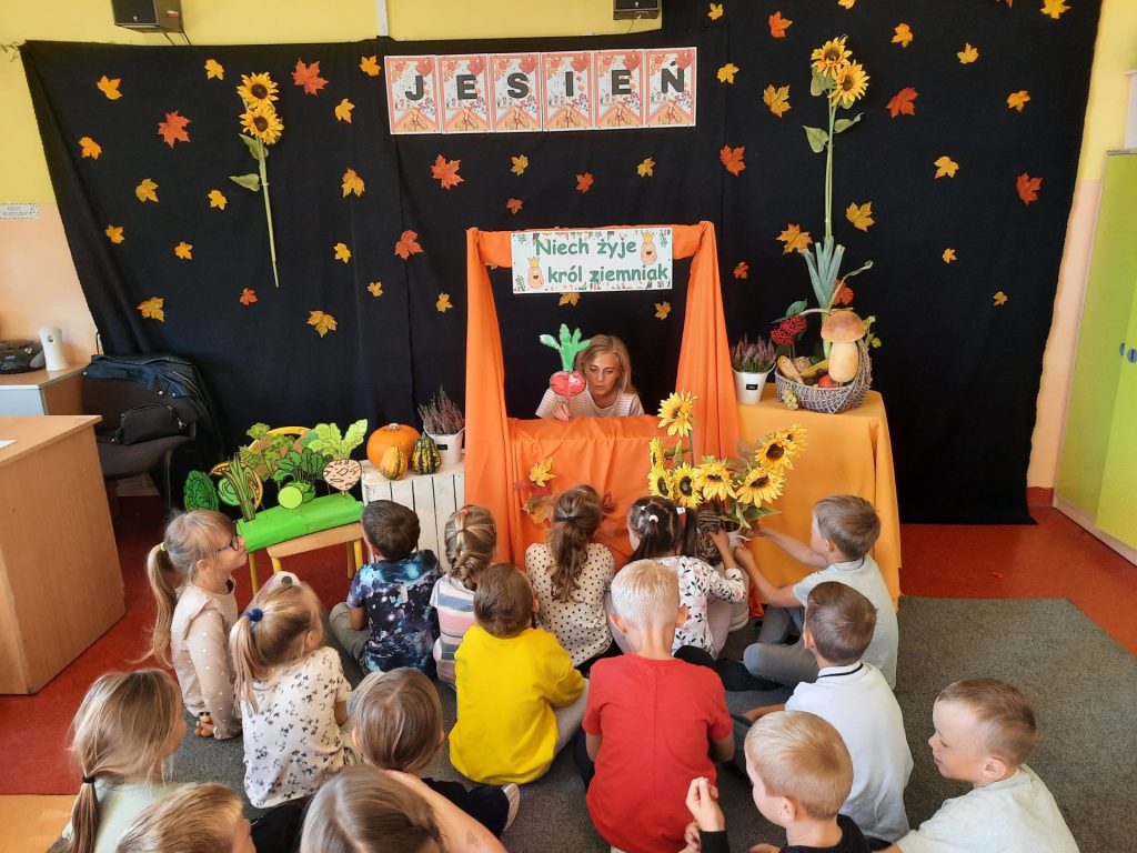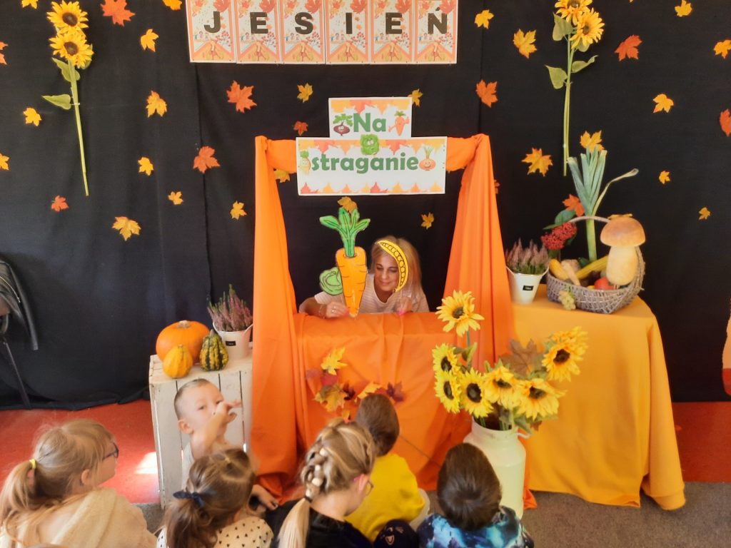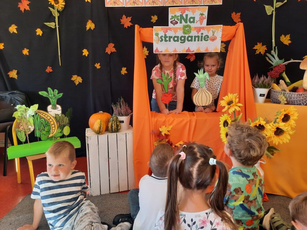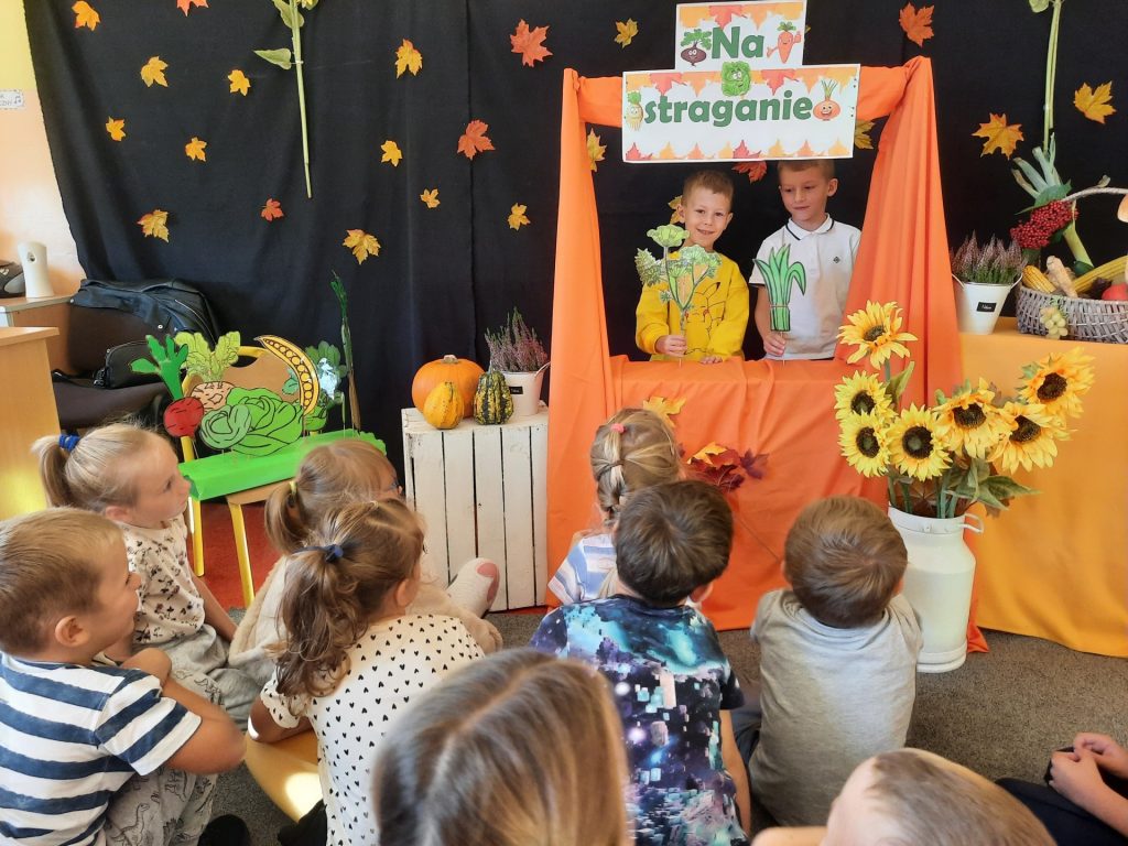 Kontakt dzieci z teatrem to nie tylko oglądanie spektakli, ale przede wszystkim zabawa poprzez , którą nabywają one nowe wiadomości… tym razem z zakresu warzyw ich przetwarzania oraz związanych z nim właściwymi nawykami żywieniowymi. Dlatego też na początku października Starszaki oglądały inscenizację takich wierszy jak „Na straganie”- J. Brzechwy , „Niech żyje król ziemniak!” – E. Stadtmuller przedstawionych przez panią Annę Kupis. Przez kilka kolejnych dni dzieci miały możliwość spróbowania swoich sił i samodzielnie odgrywały wybrane sceny z wierszy z wykorzystaniem papierowych sylwet warzyw. Starszaki prowadziły dialog według własnego pomysłu odpowiednio modelując swój głos.