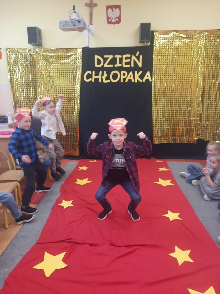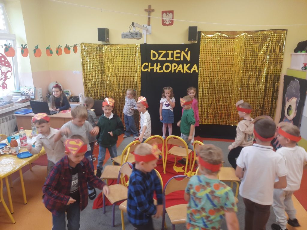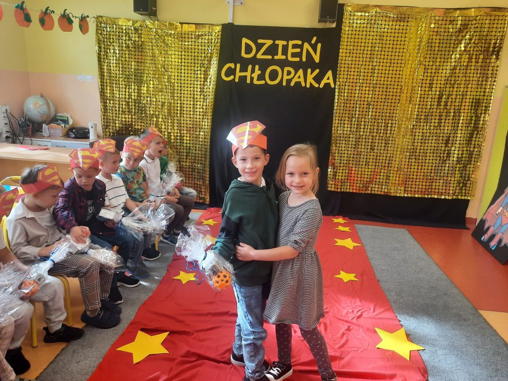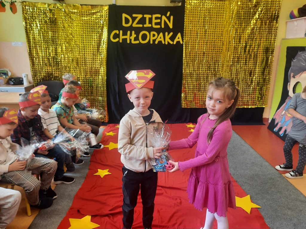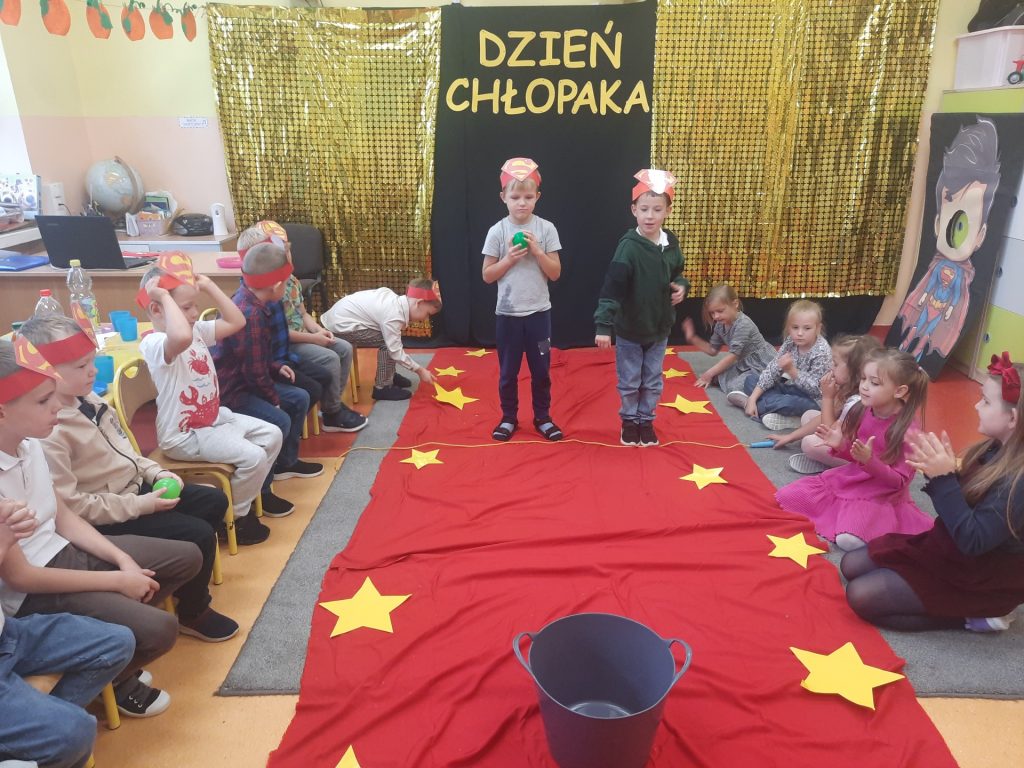 Jak co roku w przedszkoly pod koniec września obchodzimy Dzień Chłopaka. Jest to wyjątkowy dzień dla naszych dzieci. W tym roku na chłopaków czekało wiele niespodzianek i atrakcji. Były różne gry, zabawy i konkursy. Tego wyjątkowego dnia dziewczynki zamieniły się w jurorów, a chłopcy brali udział w przeróżnych konkurencjach na MISTERA PRZEDSZKOLAKÓW m.in. odgadywanie po znaczku marki samochodów, rzucali do celu, wykonywali pompki, tańczyli, prezentowali się na czerwonym dywanie. Nie zabrakło również samodzielnie wykonanych przez dziewczynki upominków i opasek Supermena dla naszych małych chłopaków. Uwieńczeniem imprezy był przepyszny poczęstunek przygotowany przez rodziców uczniów, za co serdecznie dziękujemy.