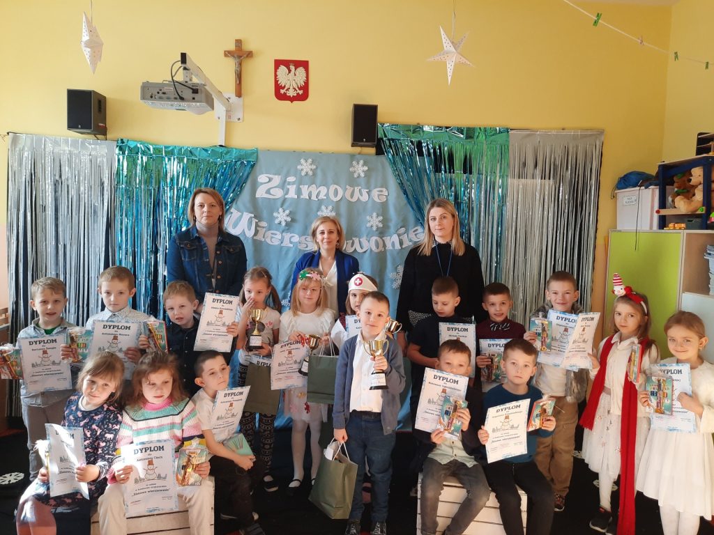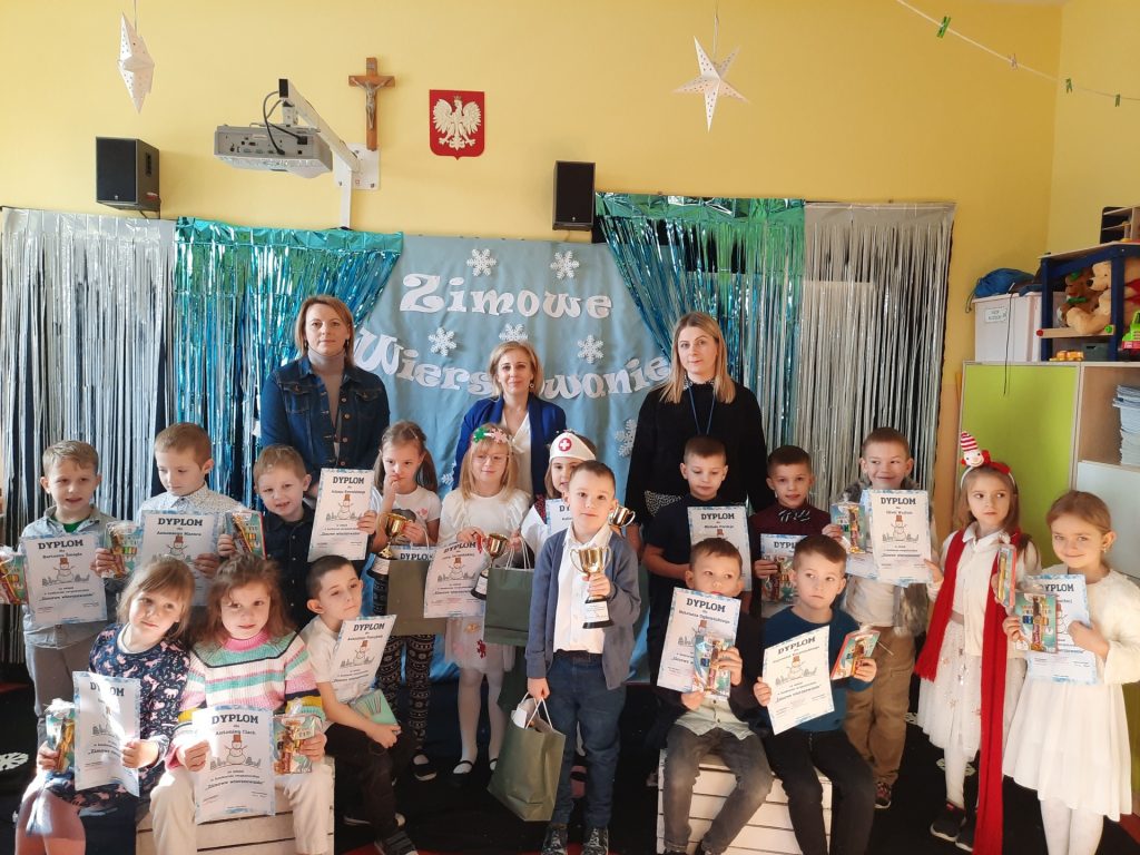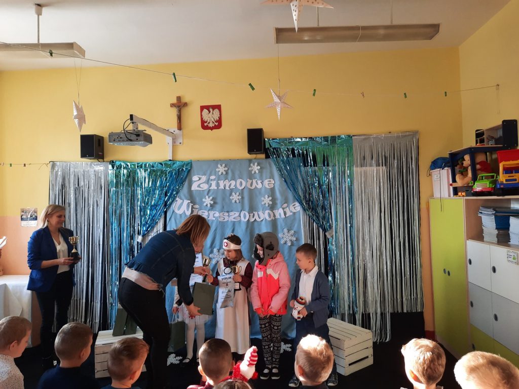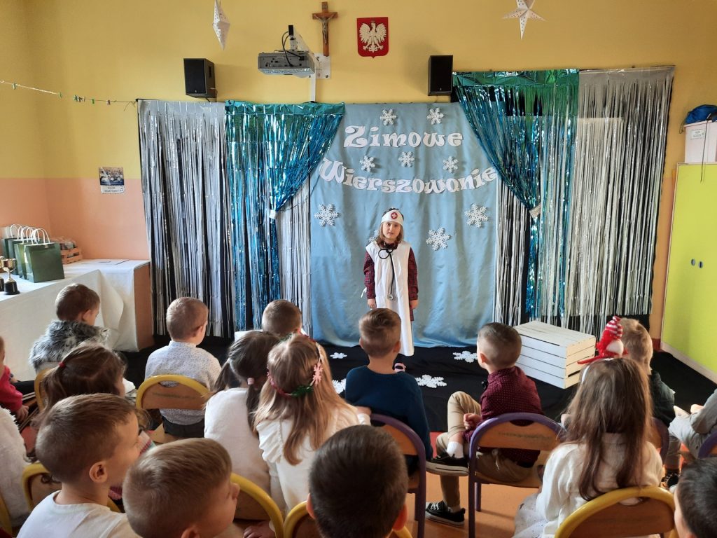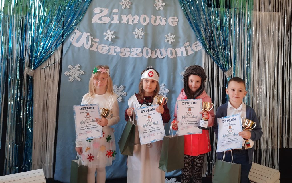 Dnia 9 lutego w klasie 0 odbył się zimowy konkurs recytatorski. Przystąpiło do niego 17 dzieci. W komisji konkursowej zasiadły p. Ewelina Pawlak, p. Martyna Piwowarczyk, p. Anna Kupis.Wszyscy uczestnicy konkursu wspaniale recytowali. Trudno było wyłonić zwycięzców. Jury po burzliwych obradach przyznało I miejsce Lence Jarosińskiej, II miejsce zajęła Kalinka Chachuła, III miejsce egzekwo zajęły: Kaja Leśniak i Antoś Przybyła . Gratulujemy zwycięzcom Pozostali uczestnicy konkursu otrzymali wyróżnienie byli to: Mateusz Ogłoziński, Szymon Karpiński, Daria i Oliwia Wojton,Tosia Ciach, Julka Popecka, Michał i Mateusz Pardej, Szymon Lasota, Adam Kowalski, Antoś Pomykała, Bartosz Śmigiel, Antoś Mazur. Jeszcze raz gratulujemy wszystkim uczestnikom konkursu. Rodzicom dziękuję za przygotowanie strojów i rekwizytów.