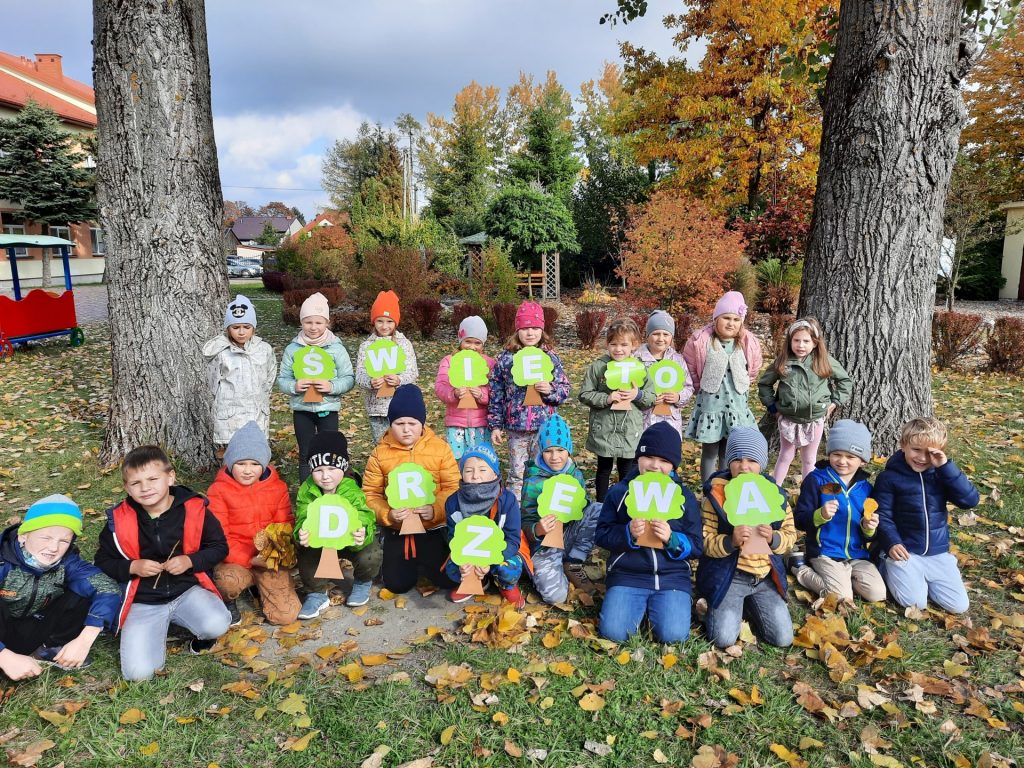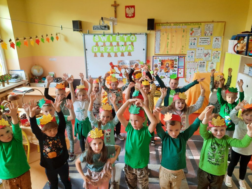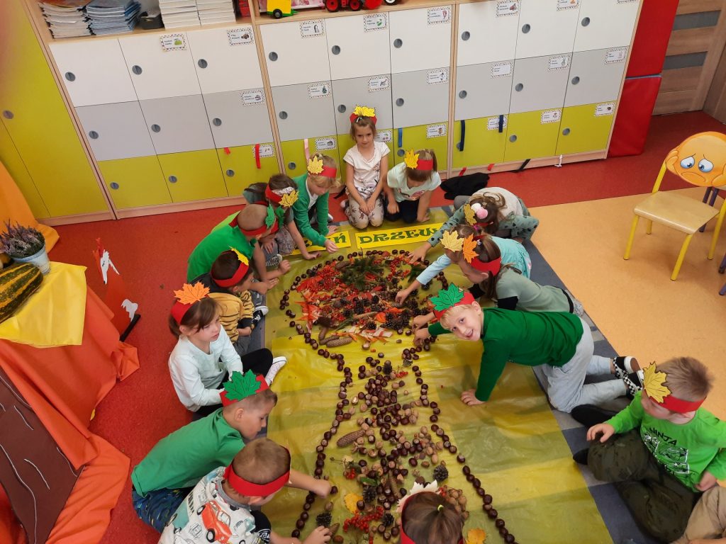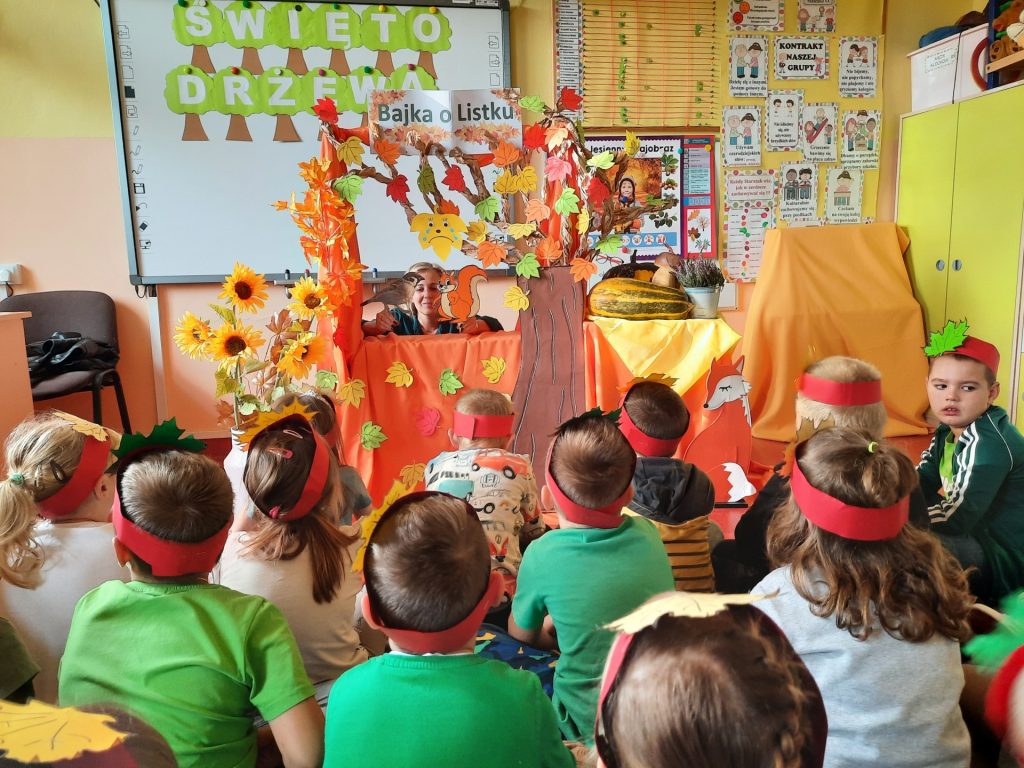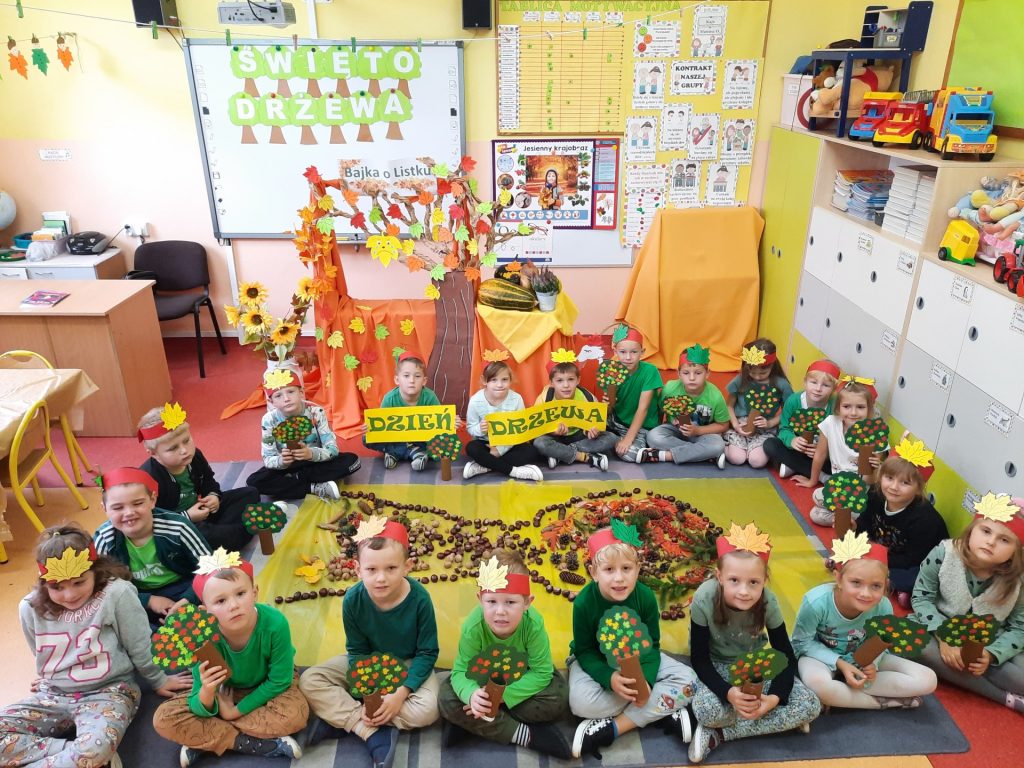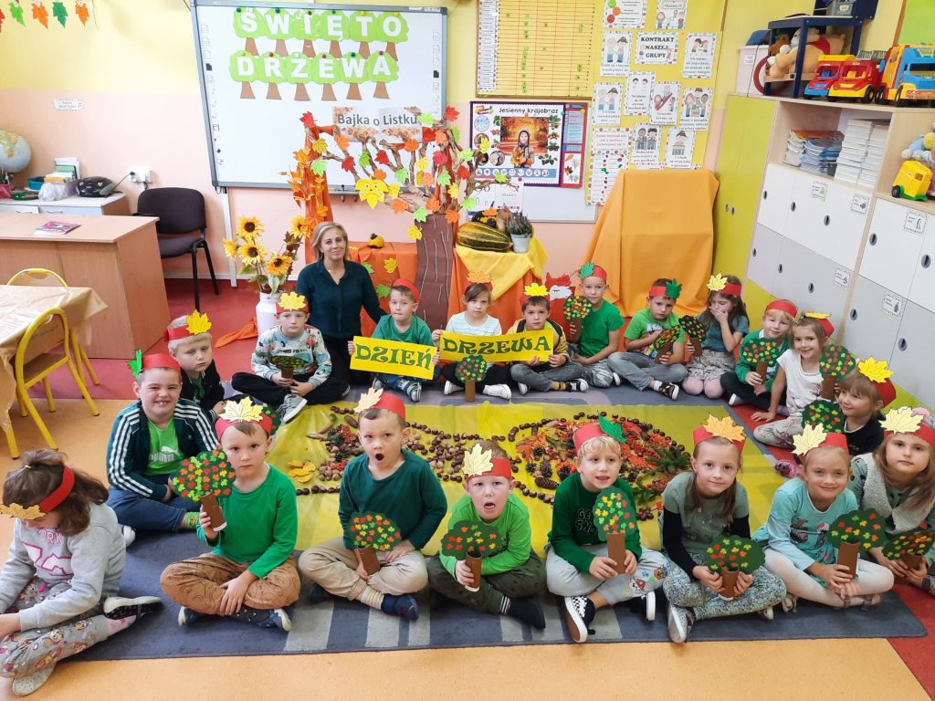 Dnia 10 października obchodziliśmy w naszej grupie Dzień Drzewa, który jest elementem edukacji ekologicznej. Tego dnia odbyły się zajęcia związane z tematyką drzew, dzieci poznały budowę drzewa, jego znaczenie dla człowieka, zwierząt i przyrody. Poznały także etapy wzrastania drzewa i ich rodzaje. Na zajęciach dzieci obejrzały teatrzyk kukiełkowy pt. „Bajka o listku, który chciał latać” i wspólnie ułożyły drzewo z jesiennych darów natury. Ponadto Starszaki wybrały się do ogrodu dydaktycznego, aby zobaczyć najbardziej okazałe drzewa. Dzień wcześniej przedszkolaki wykonały z papieru własne drzewka .