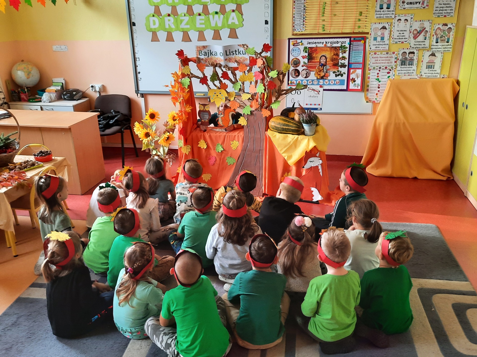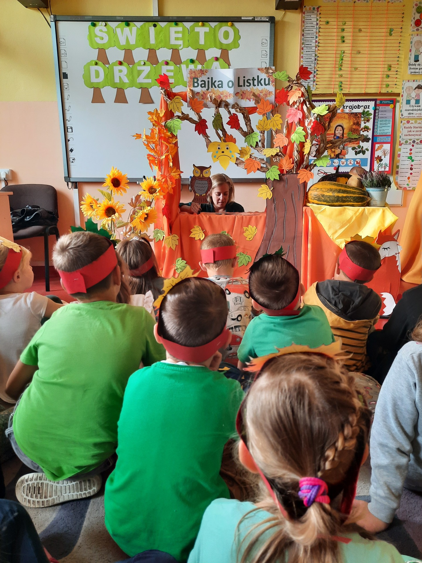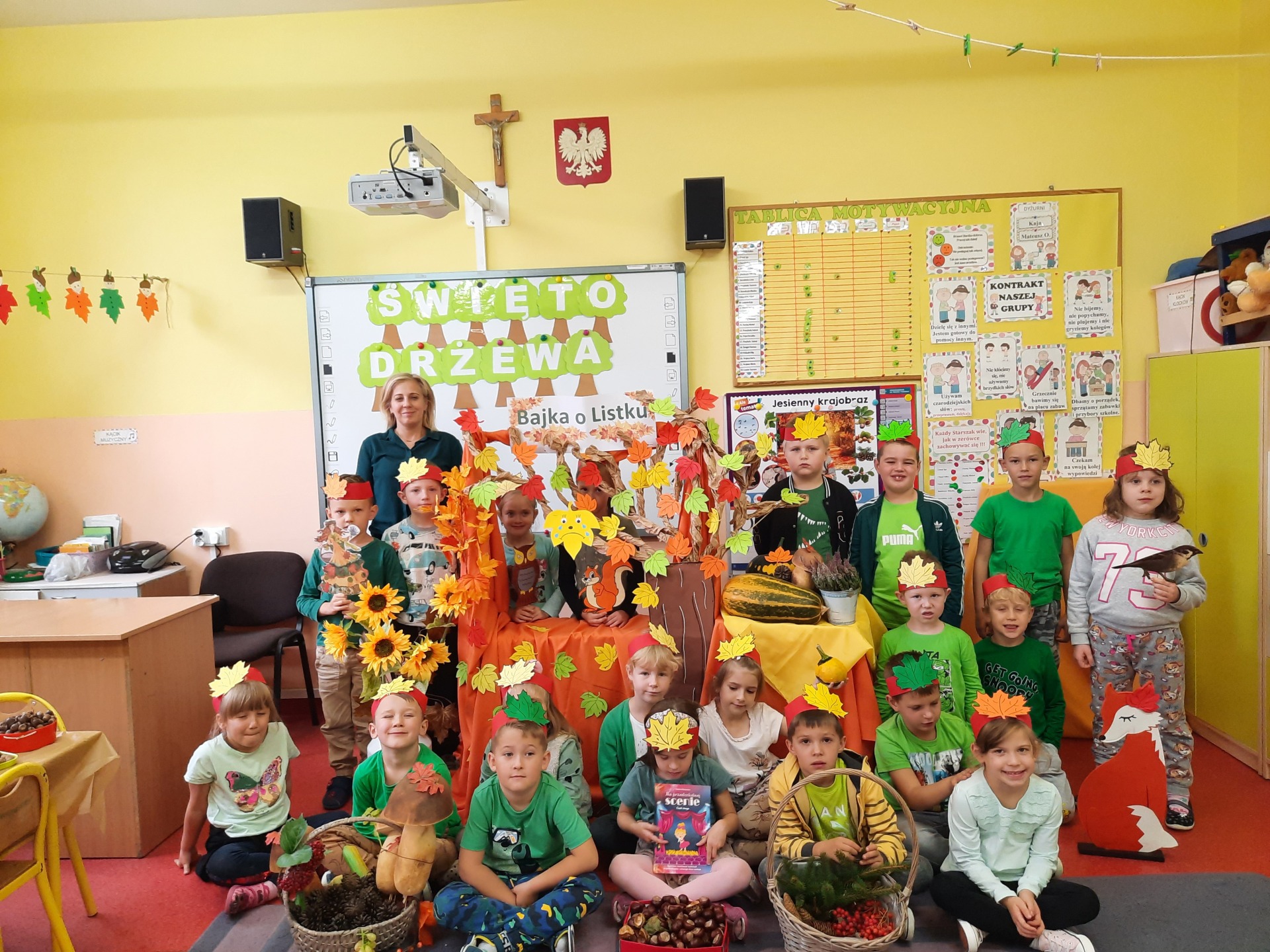 Dnia 10 października obchodziliśmy w naszej grupie Dzień Drzewa, który jest elementem edukacji ekologicznej. Tego dnia odbyły się zajęcia związane z tematyką drzew, dzieci poznały budowę drzewa, jego znaczenie dla człowieka, zwierząt i przyrody. Poznały także etapy wzrastania drzewa i ich rodzaje. Na zajęciach dzieci obejrzały teatrzyk kukiełkowy pt. „Bajka o listku, który chciał latać” i wspólnie ułożyły drzewo z jesiennych darów natury. Ponadto Starszaki wybrały się do ogrodu dydaktycznego, aby zobaczyć najbardziej okazałe drzewa. Dzień wcześniej przedszkolaki wykonały z papieru własne drzewka .