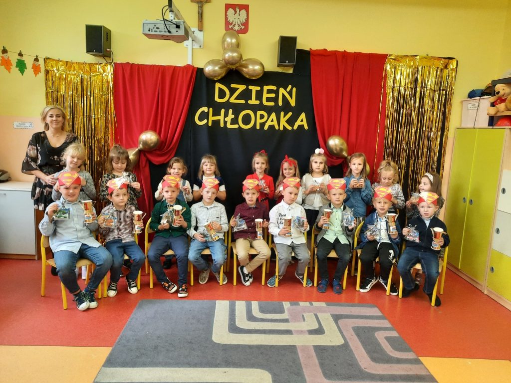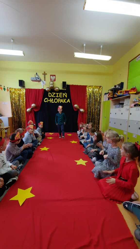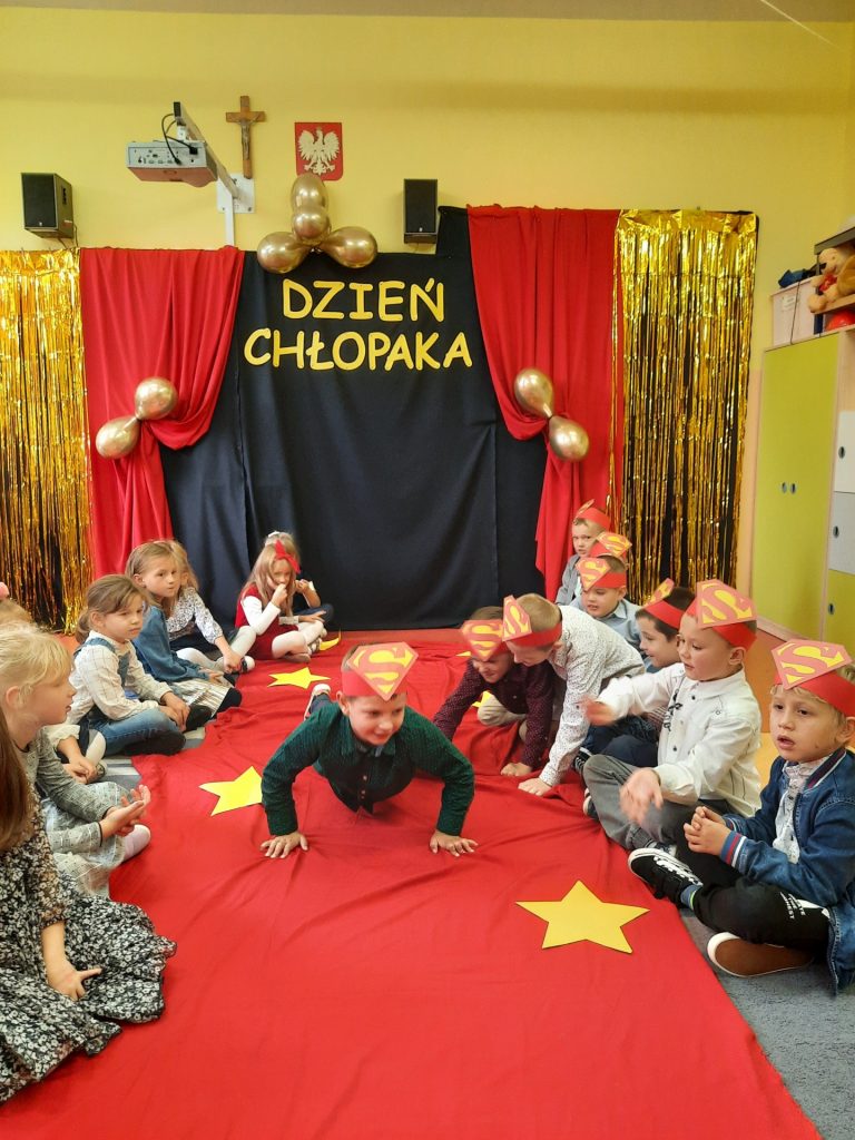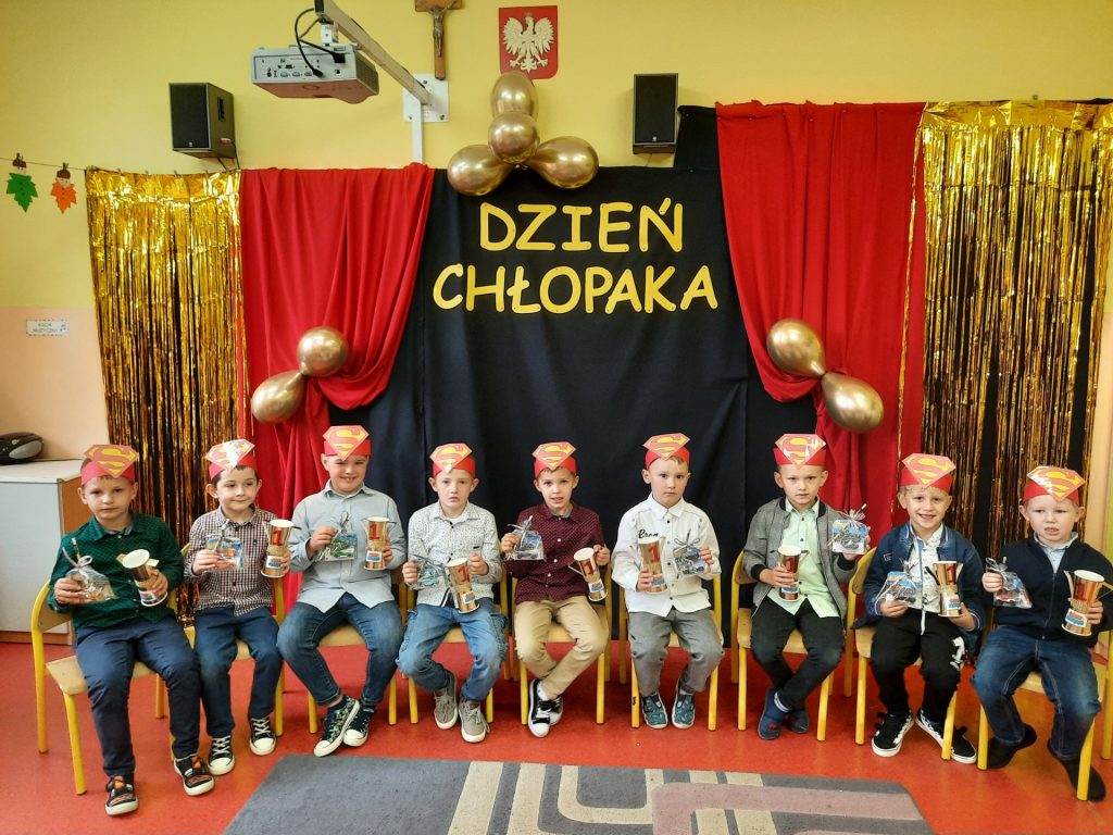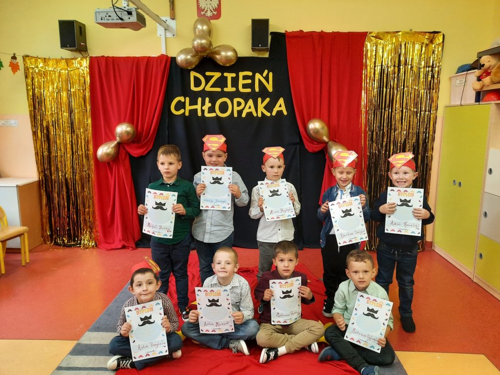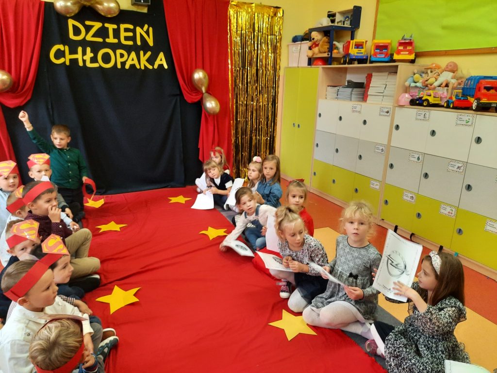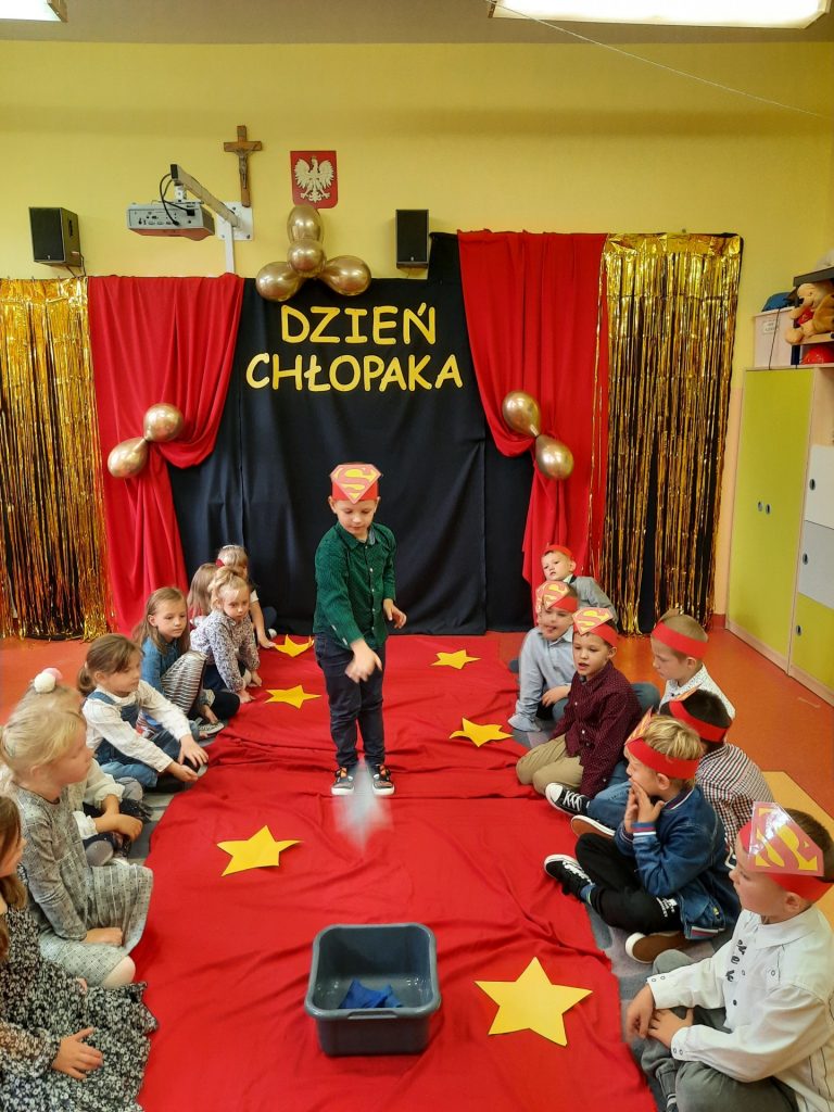 Jak co roku 30 września w przedszkolu obchodzimy Dzień Chłopaka. Jest to wyjątkowy dzień dla naszych dzieci. W tym roku na chłopaków czekało wiele niespodzianek i atrakcji. Były różne gry, zabawy i konkursy. Tego wyjątkowego dnia dziewczynki zamieniły się w jurorów, a chłopcy brali udział w przeróżnych konkurencjach na MISTERA PRZEDSZKOLAKÓW m.in. odgadywanie po znaczku marki samochodów, rzucali do celu, wykonywali pompki, tańczyli, prezentowali się na czerwonym dywanie. Nie zabrakło również upominków, opasek Supermena dla naszych małych chłopaków. Uwieńczeniem imprezy był przepyszny poczęstunek przygotowany przez mamę jednego z uczniów, za co serdecznie dziękujemy.