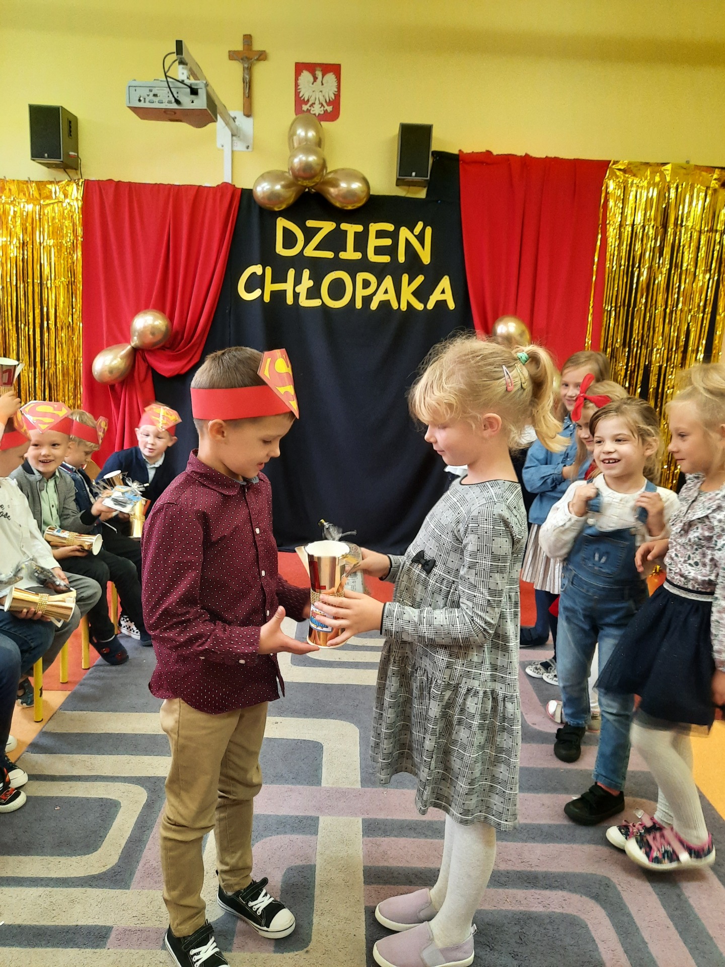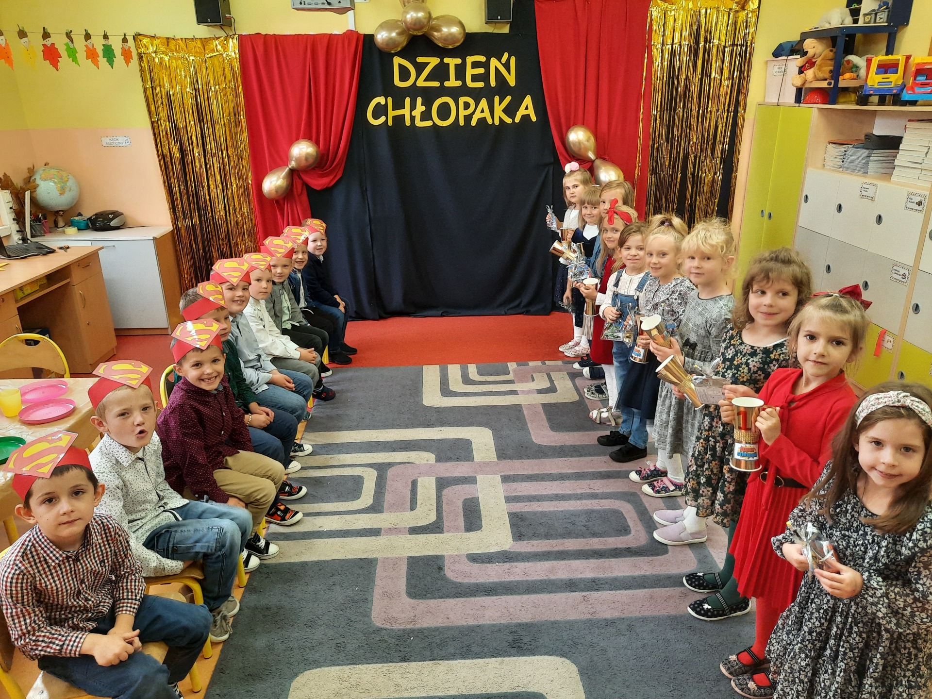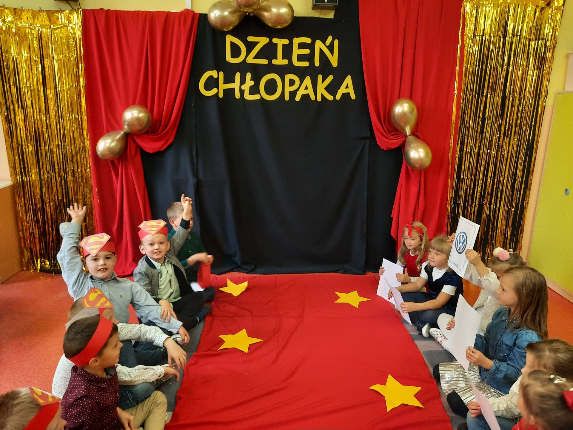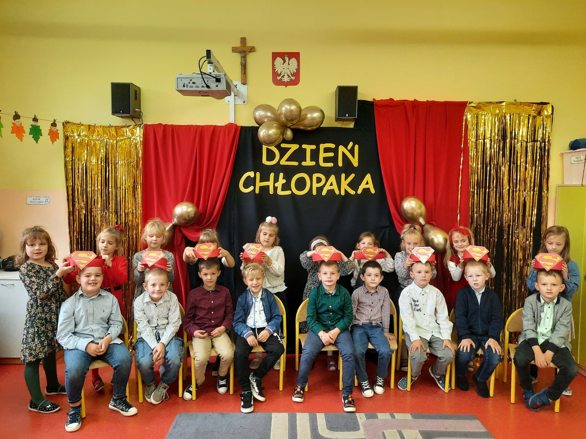 Jak co roku 30 września w przedszkolu obchodzimy Dzień Chłopaka. Jest to wyjątkowy dzień dla naszych dzieci. W tym roku na chłopaków czekało wiele niespodzianek i atrakcji. Były różne gry, zabawy i konkursy. Tego wyjątkowego dnia dziewczynki zamieniły się w jurorów, a chłopcy brali udział w przeróżnych konkurencjach na MISTERA PRZEDSZKOLAKÓW m.in. odgadywanie po znaczku marki samochodów, rzucali do celu, wykonywali pompki, tańczyli, prezentowali się na czerwonym dywanie. Nie zabrakło również upominków, opasek Supermena dla naszych małych chłopaków. Uwieńczeniem imprezy był przepyszny poczęstunek przygotowany przez mamę jednego z uczniów, za co serdecznie dziękujemy.
