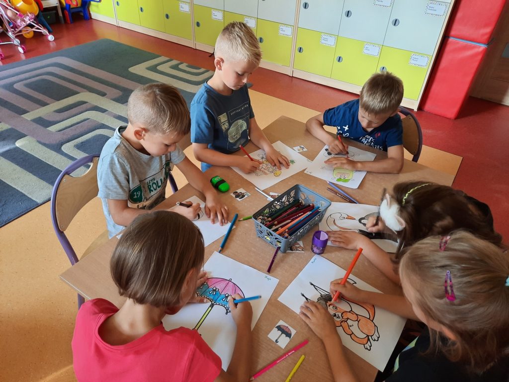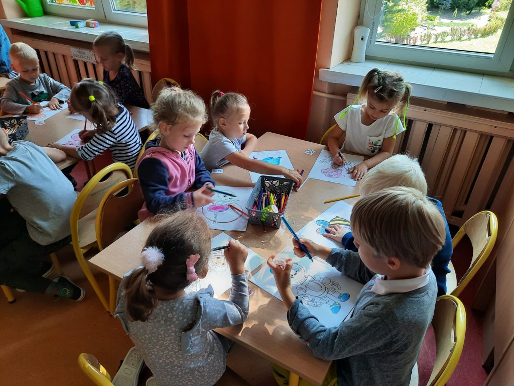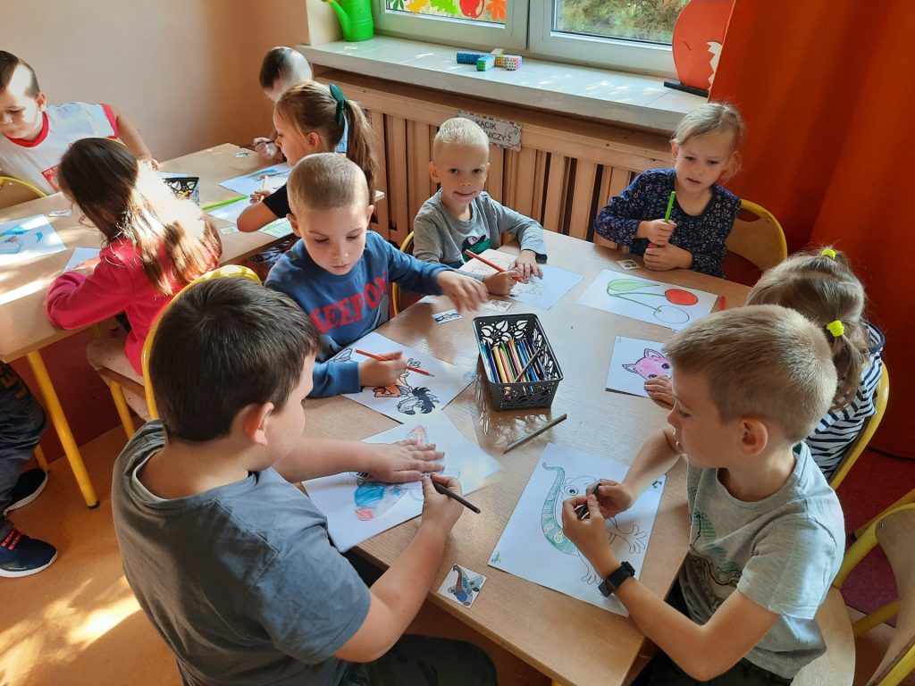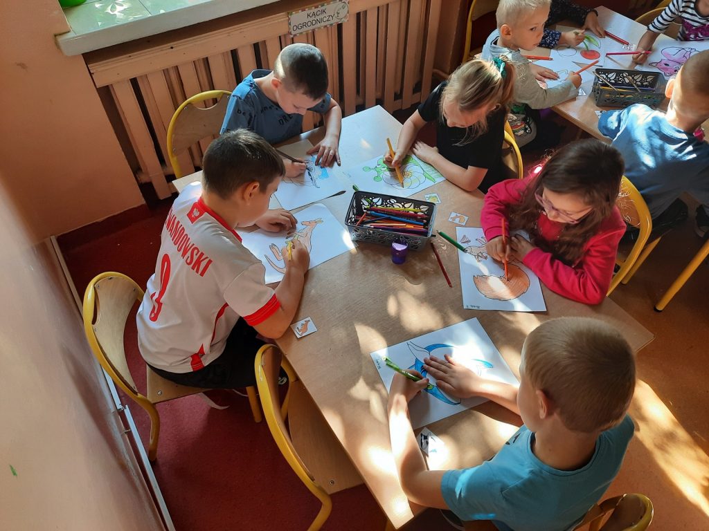 dzieci kolorują rysunek swojego znaczka