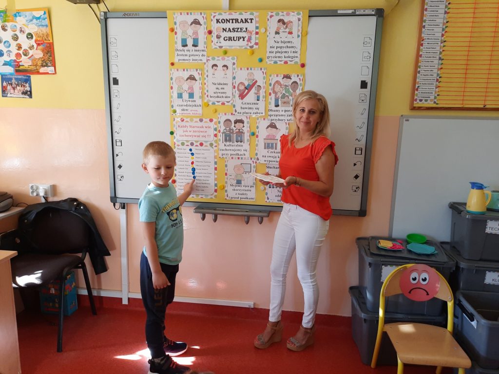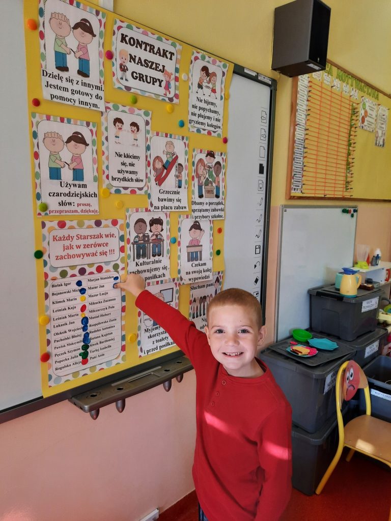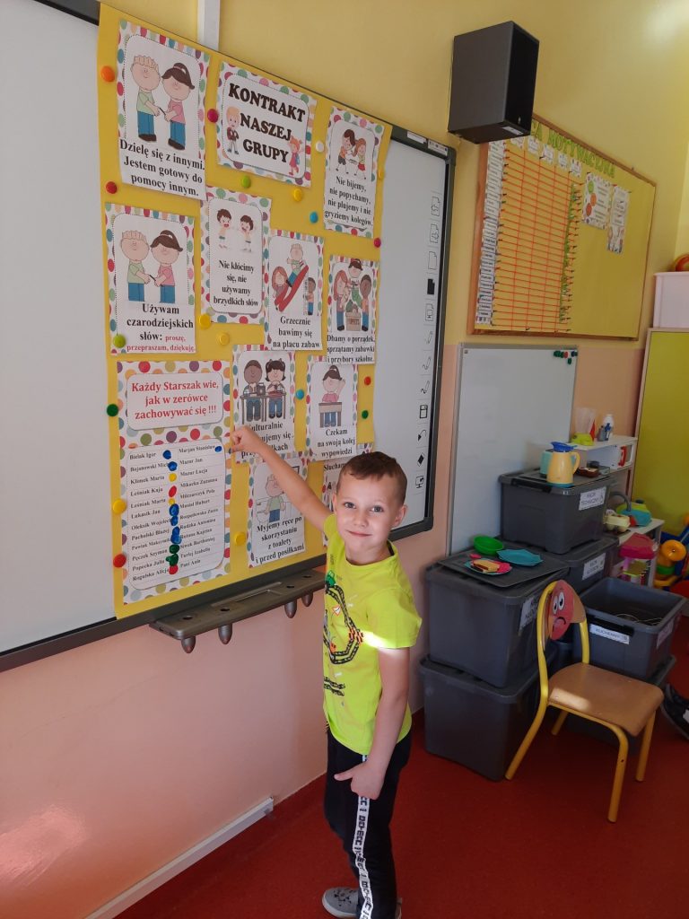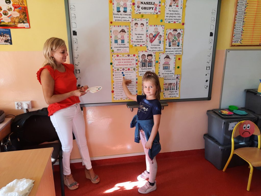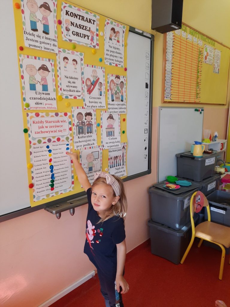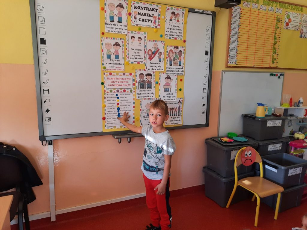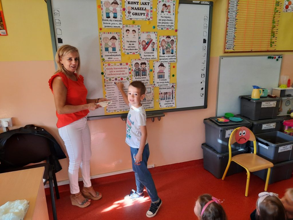 W pierwszych dniach września dzieci z grupy Starszaków same wybrały i zadecydowały jaki chcą mieć znaczki rozpoznawcze, Następnie odbyły się bardzo poważne zajęcia na temat Kodeksu Przedszkolaka. Nasze dzieci, choć mają dopiero pięć i sześć lat, świetnie pojmują i oceniają, jakie zachowania są dobre, a jakie złe. Wszystkie bardzo uroczyście obiecały przestrzegać naszego Kodeksu, bo nie chcą, aby ktoś przez nie był smutny lub płakał. Sytuacje konfliktowe są natychmiast rozwiązywane. Najpierw wspólnie ustaliliśmy zasady obowiązujące w naszej grupie, następnie dzieci podpisały się odciskiem palca pod zasadami zawartymi w kodeksie.
