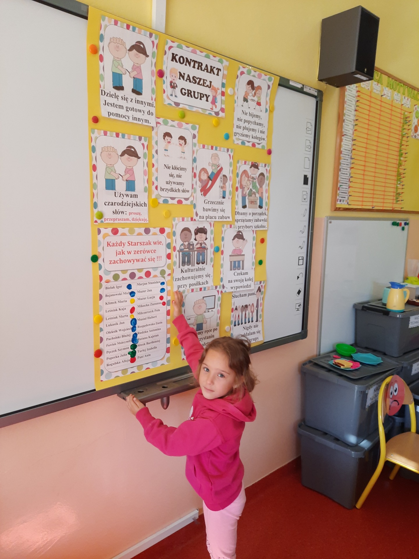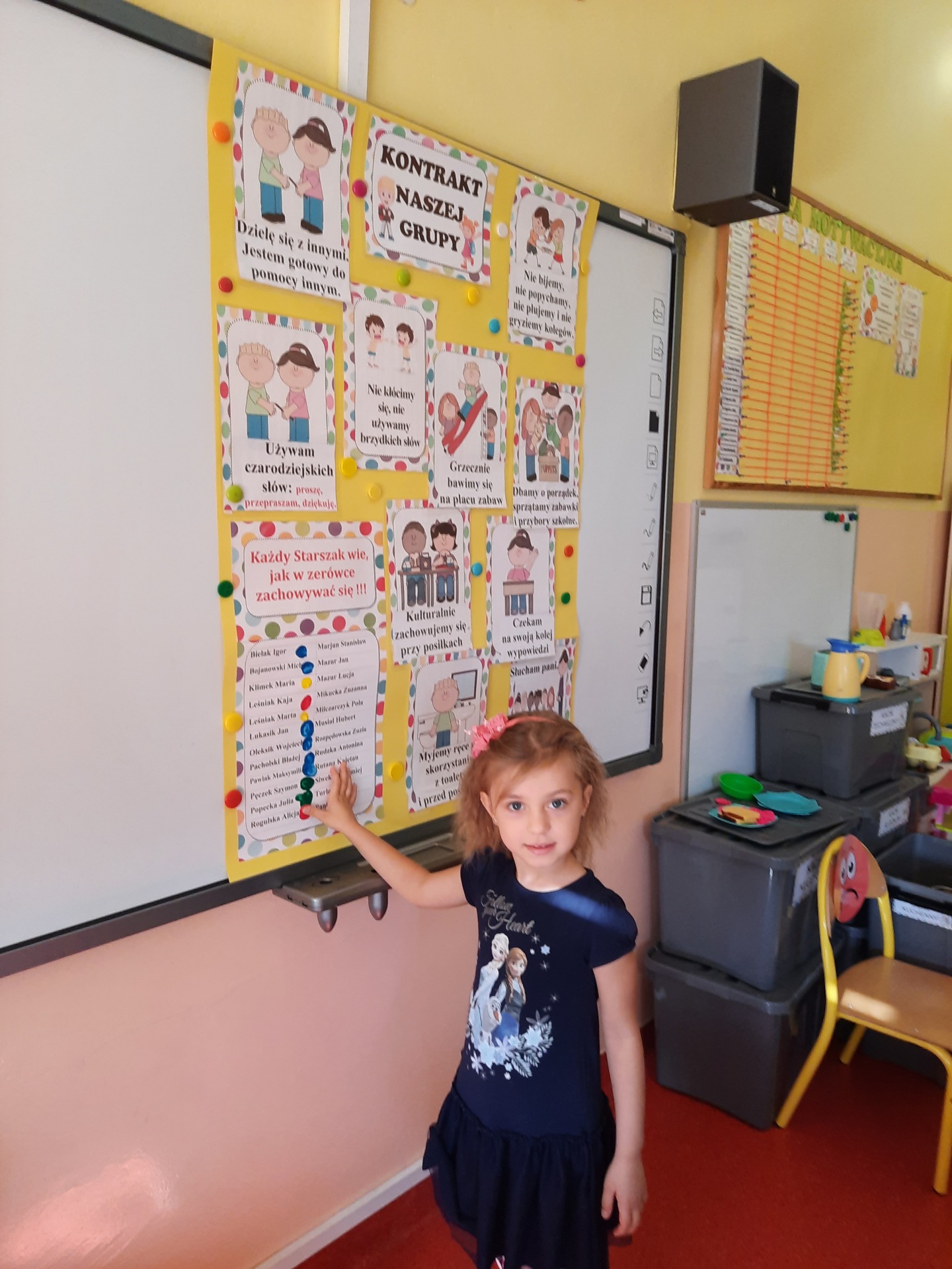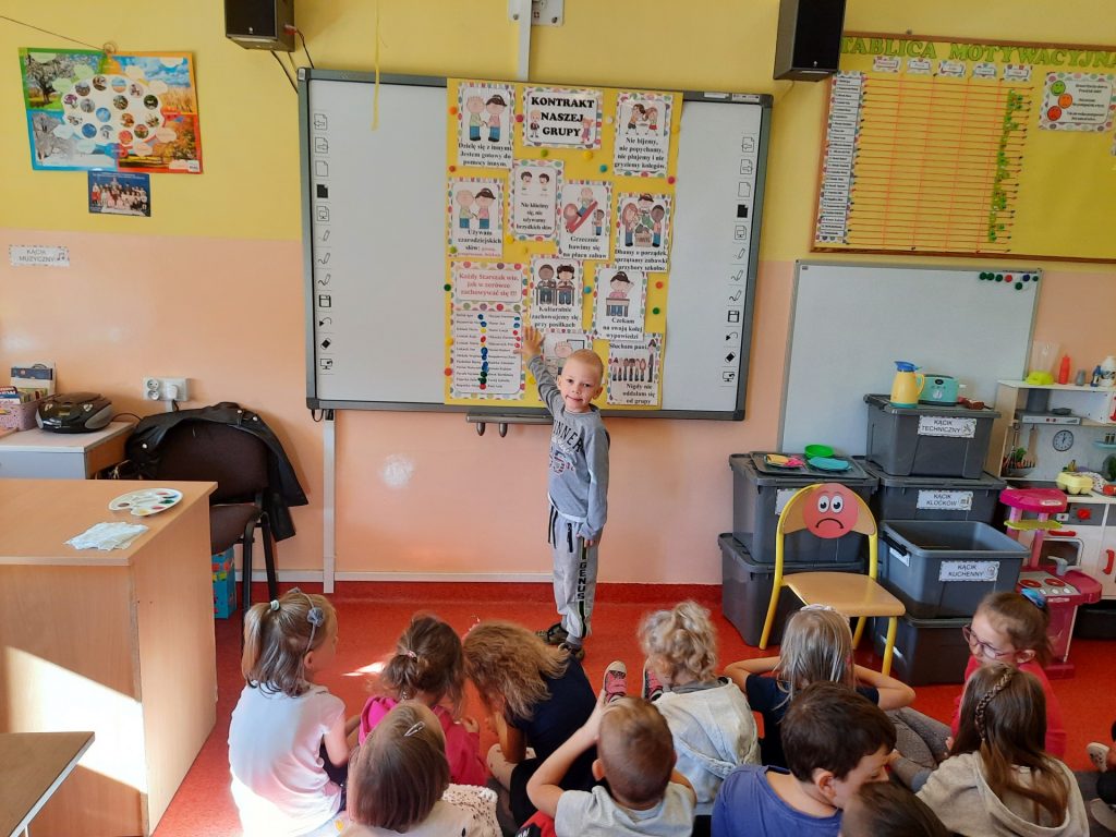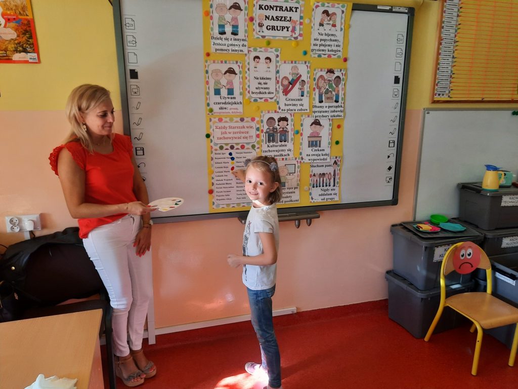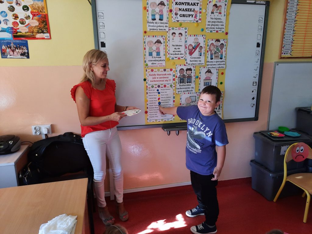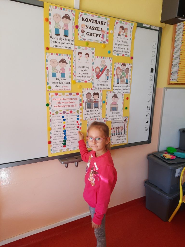 W pierwszych dniach września dzieci z grupy Starszaków same wybrały i zadecydowały jaki chcą mieć znaczki rozpoznawcze, Następnie odbyły się bardzo poważne zajęcia na temat Kodeksu Przedszkolaka. Nasze dzieci, choć mają dopiero pięć i sześć lat, świetnie pojmują i oceniają, jakie zachowania są dobre, a jakie złe. Wszystkie bardzo uroczyście obiecały przestrzegać naszego Kodeksu, bo nie chcą, aby ktoś przez nie był smutny lub płakał. Sytuacje konfliktowe są natychmiast rozwiązywane. Najpierw wspólnie ustaliliśmy zasady obowiązujące w naszej grupie, następnie dzieci podpisały się odciskiem palca pod zasadami zawartymi w kodeksie.