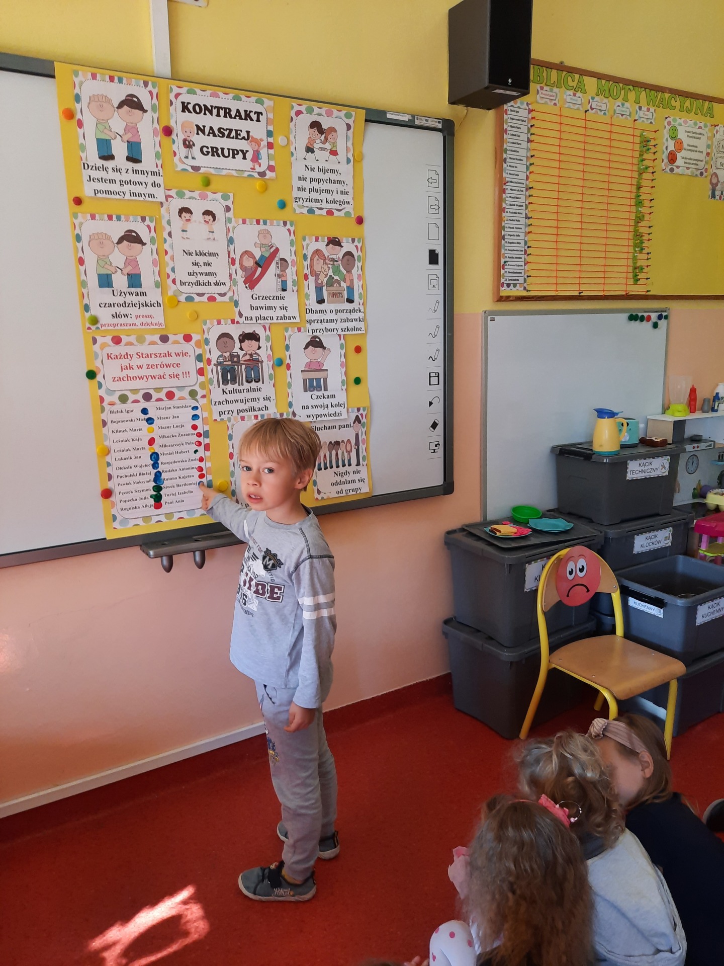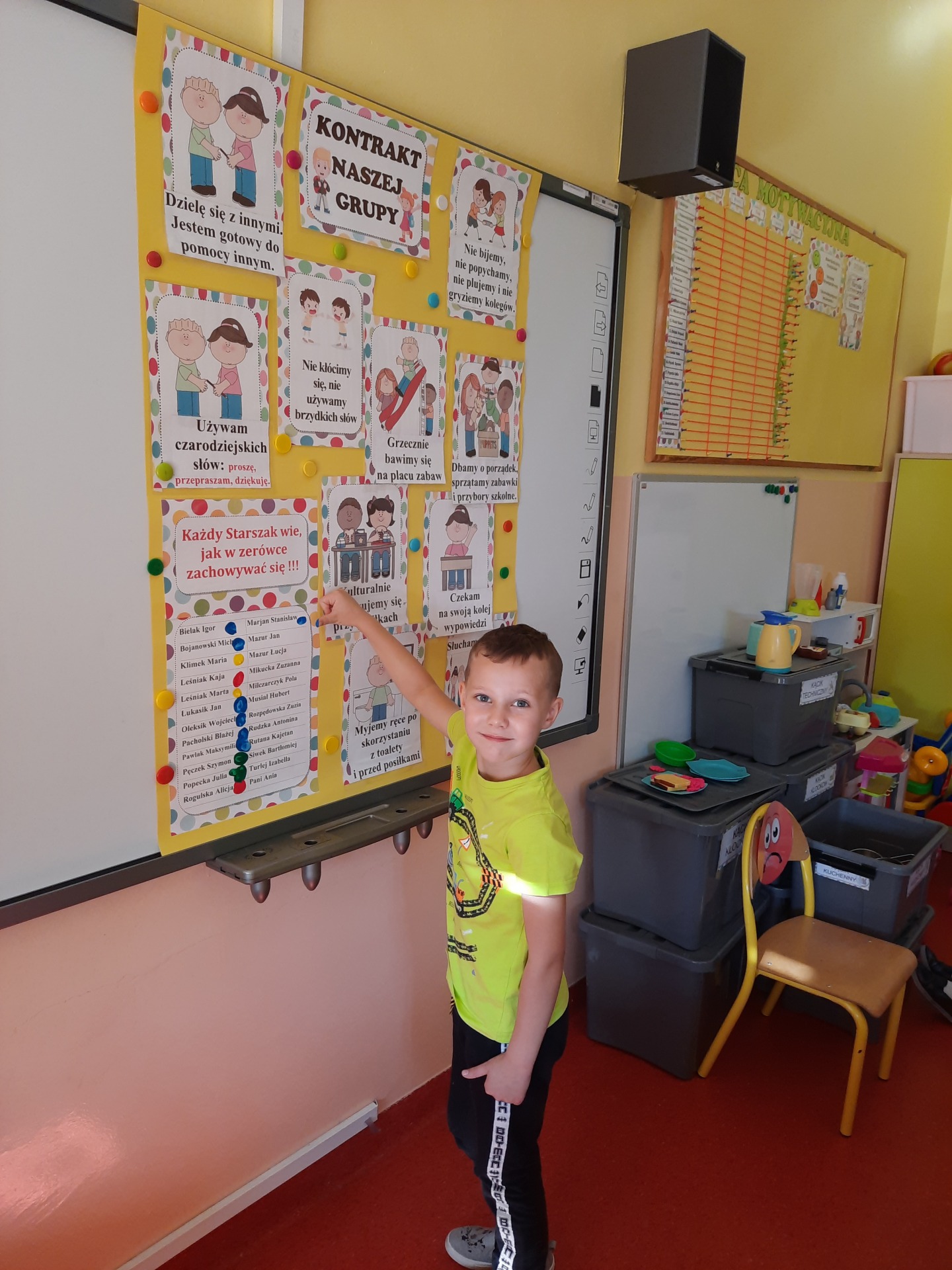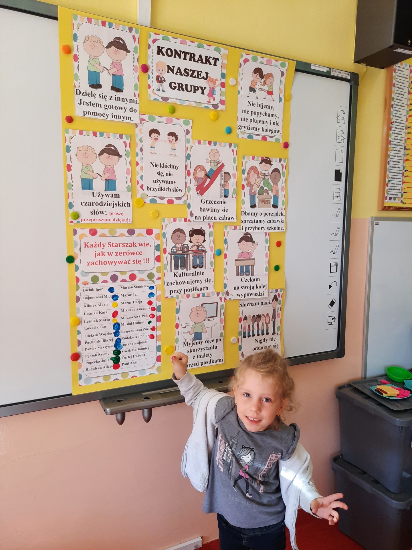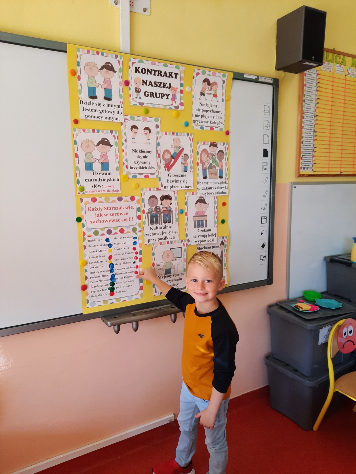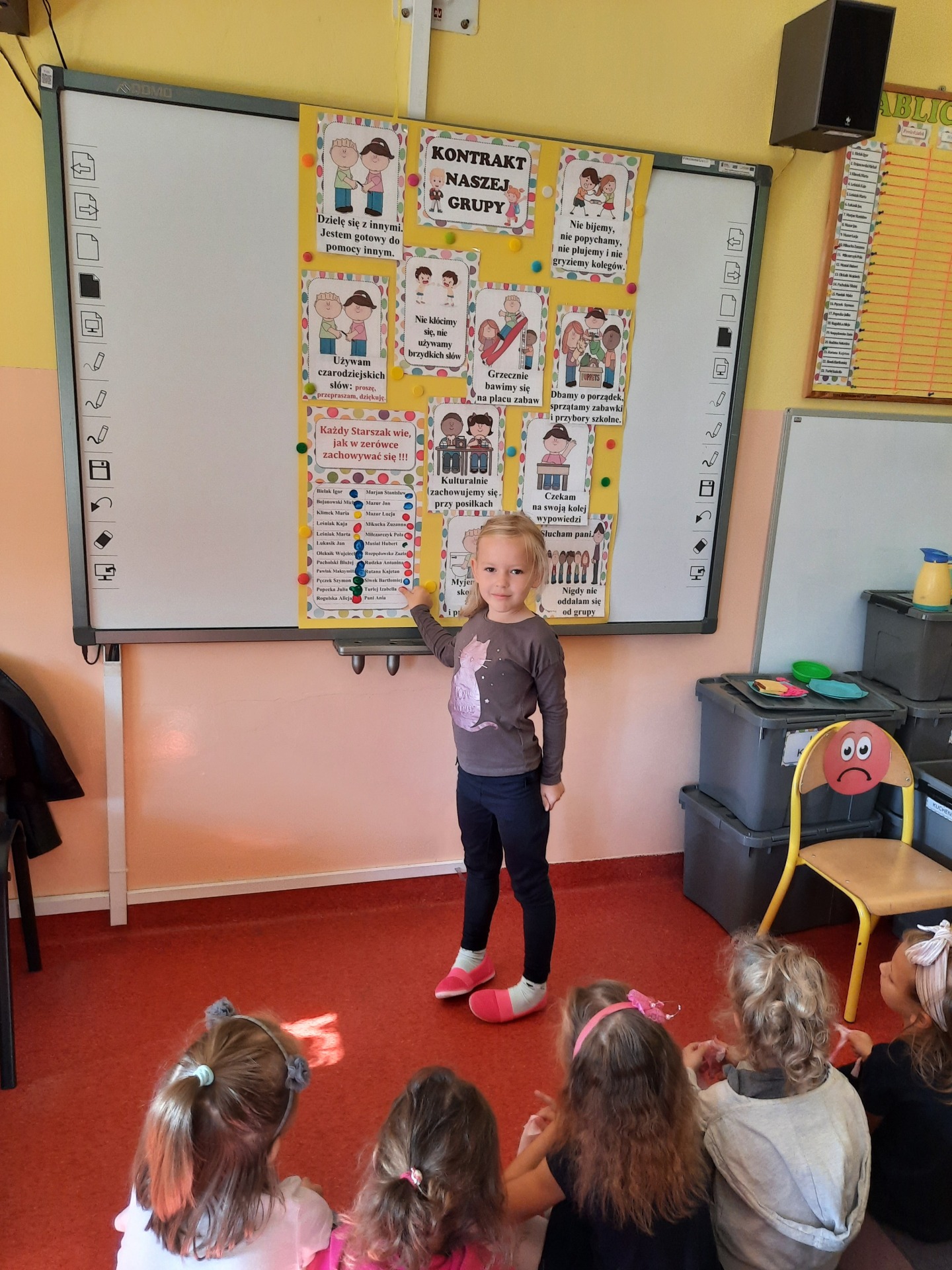 W pierwszych dniach września dzieci z grupy Starszaków same wybrały i zadecydowały jaki chcą mieć znaczki rozpoznawcze, Następnie odbyły się bardzo poważne zajęcia na temat Kodeksu Przedszkolaka. Nasze dzieci, choć mają dopiero pięć i sześć lat, świetnie pojmują i oceniają, jakie zachowania są dobre, a jakie złe. Wszystkie bardzo uroczyście obiecały przestrzegać naszego Kodeksu, bo nie chcą, aby ktoś przez nie był smutny lub płakał. Sytuacje konfliktowe są natychmiast rozwiązywane. Najpierw wspólnie ustaliliśmy zasady obowiązujące w naszej grupie, następnie dzieci podpisały się odciskiem palca pod zasadami zawartymi w kodeksie.