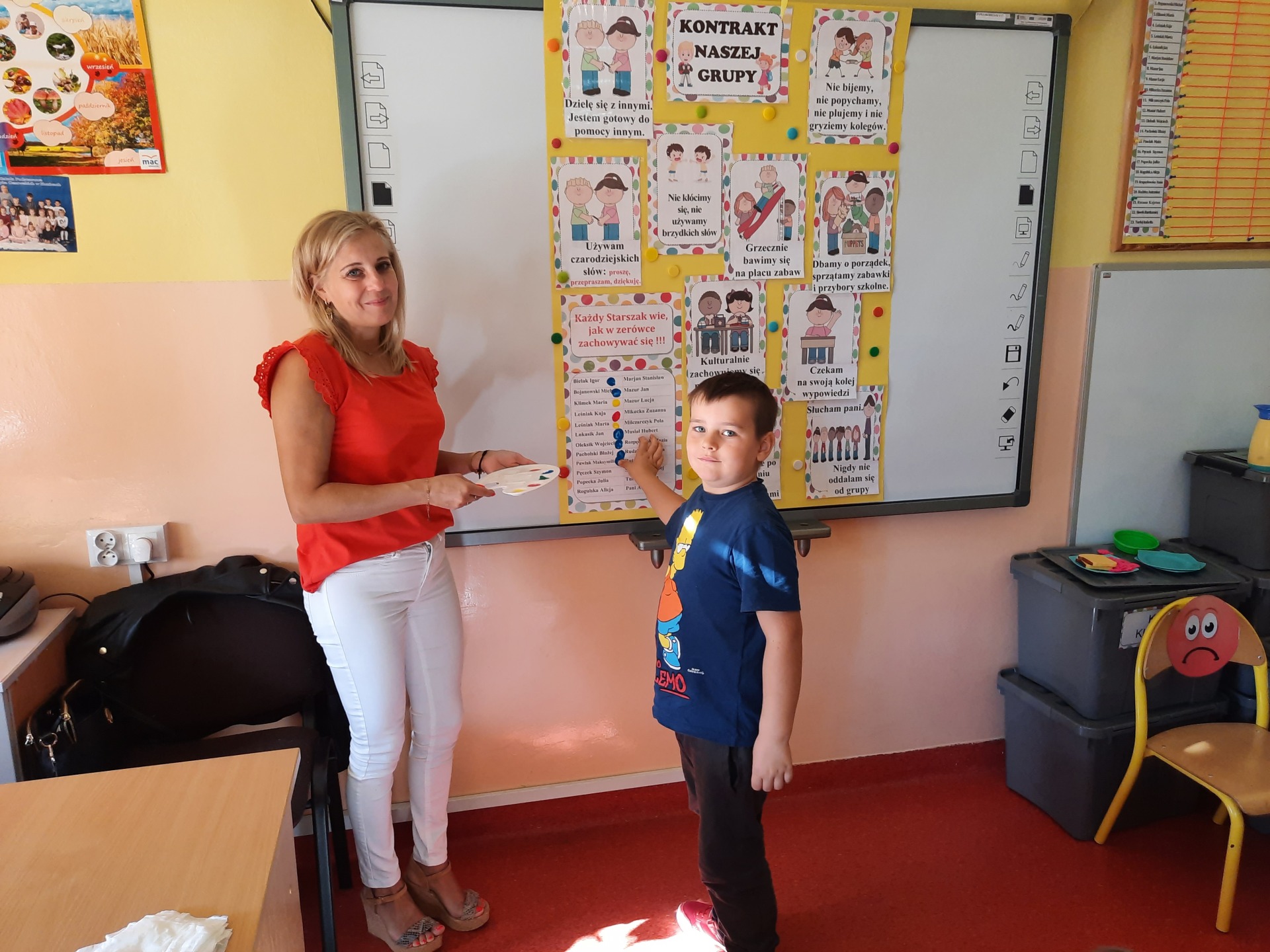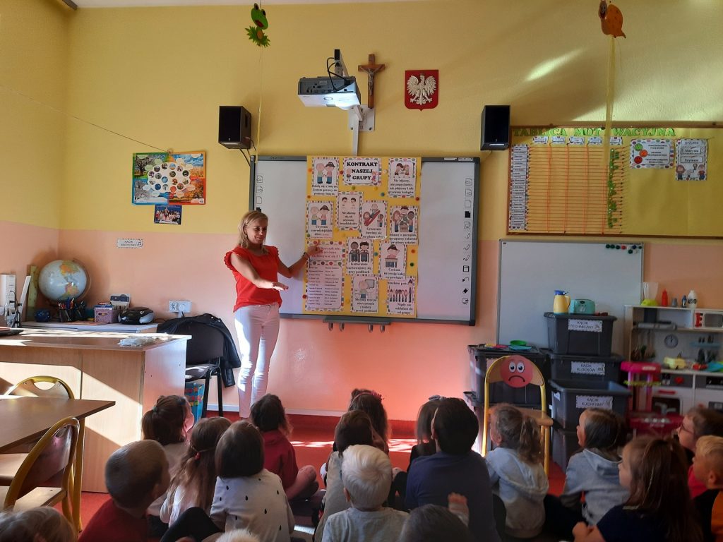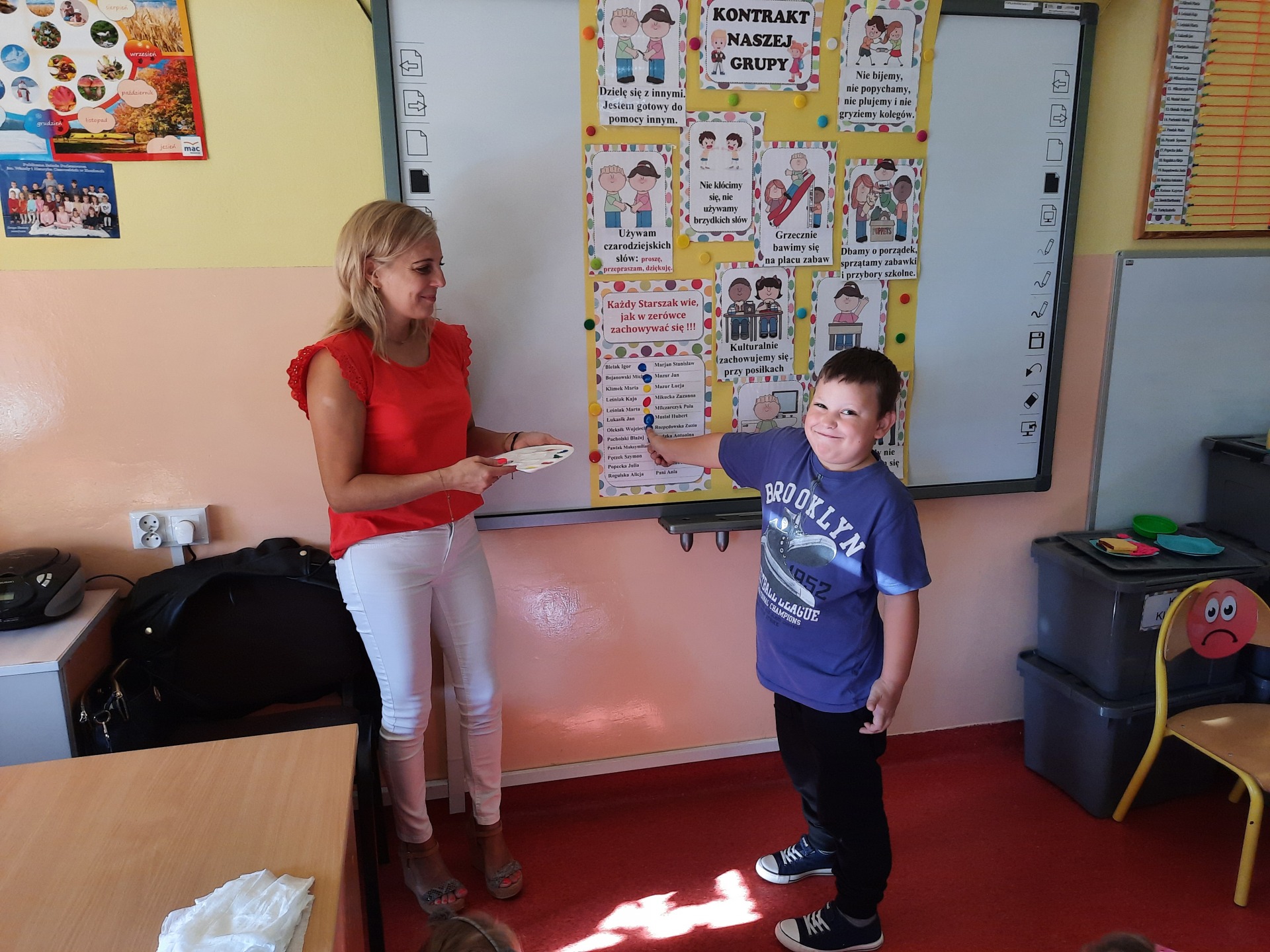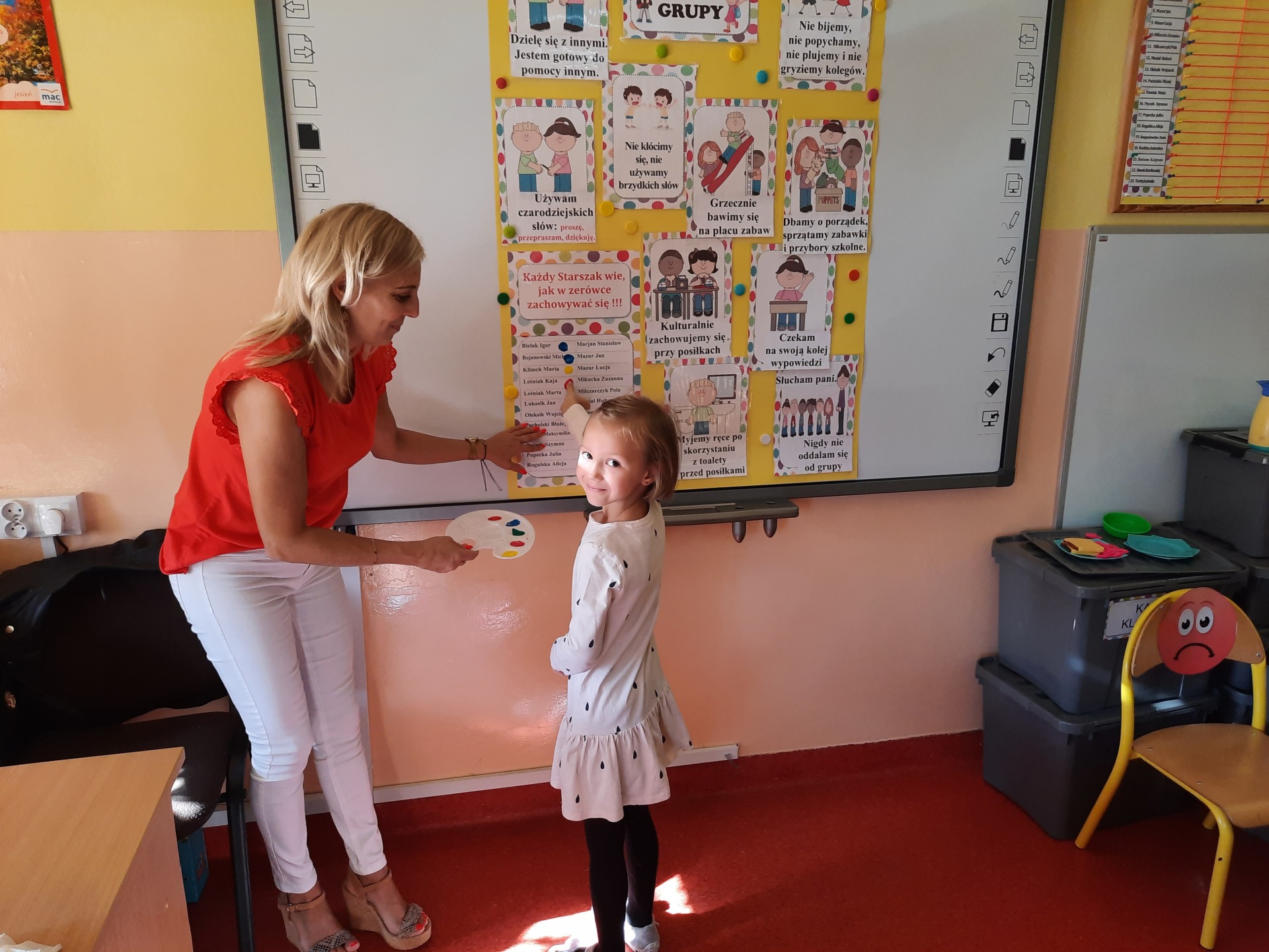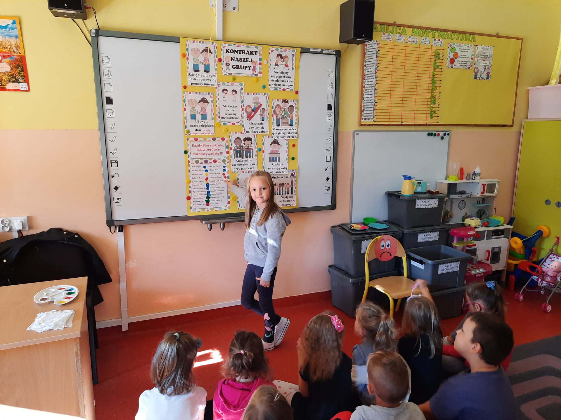 W pierwszych dniach września dzieci z grupy Starszaków same wybrały i zadecydowały jaki chcą mieć znaczki rozpoznawcze, Następnie odbyły się bardzo poważne zajęcia na temat Kodeksu Przedszkolaka. Nasze dzieci, choć mają dopiero pięć i sześć lat, świetnie pojmują i oceniają, jakie zachowania są dobre, a jakie złe. Wszystkie bardzo uroczyście obiecały przestrzegać naszego Kodeksu, bo nie chcą, aby ktoś przez nie był smutny lub płakał. Sytuacje konfliktowe są natychmiast rozwiązywane. Najpierw wspólnie ustaliliśmy zasady obowiązujące w naszej grupie, następnie dzieci podpisały się odciskiem palca pod zasadami zawartymi w kodeksie.