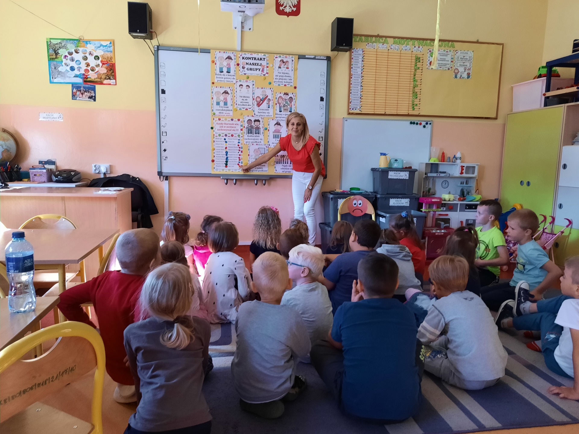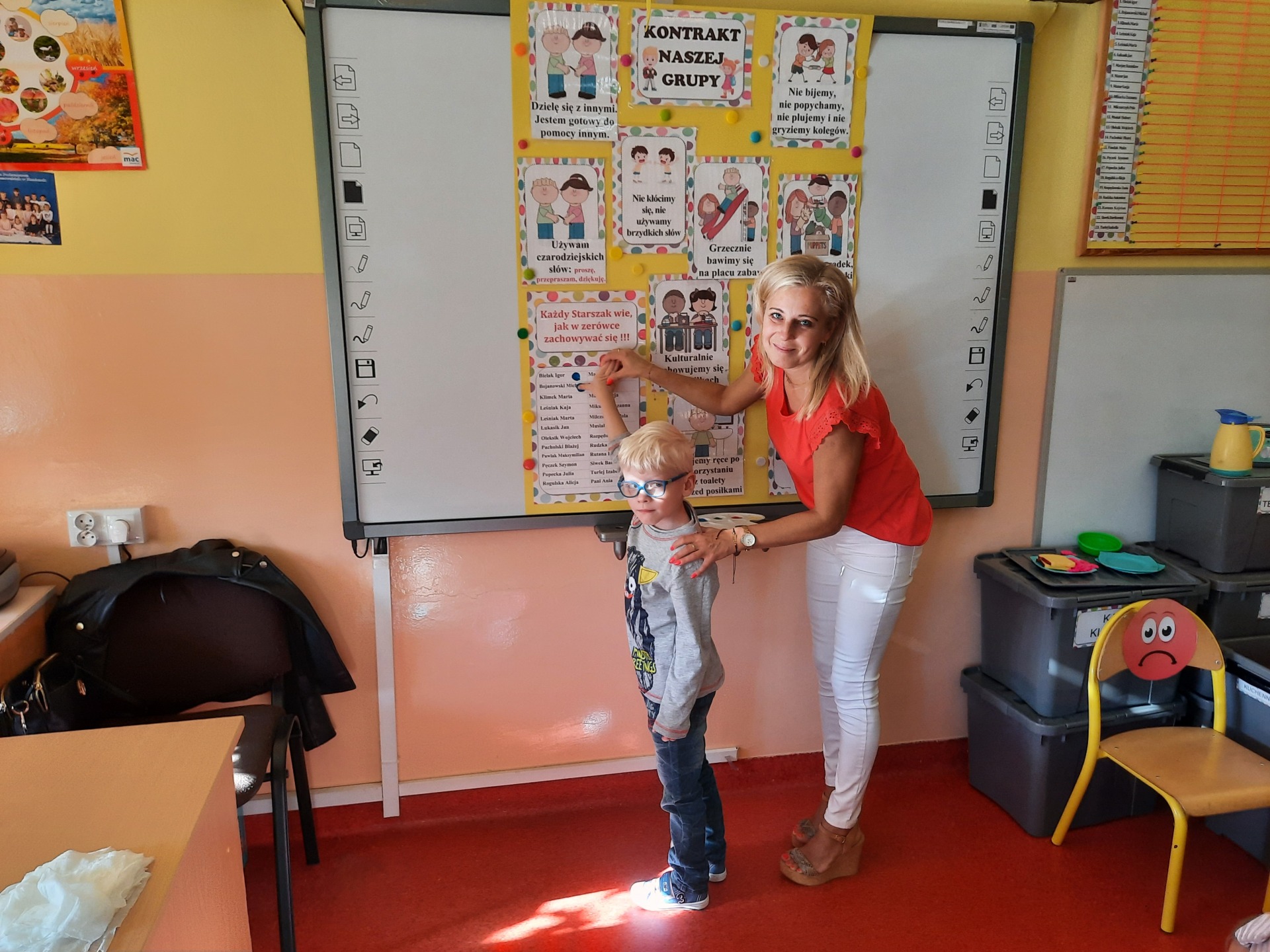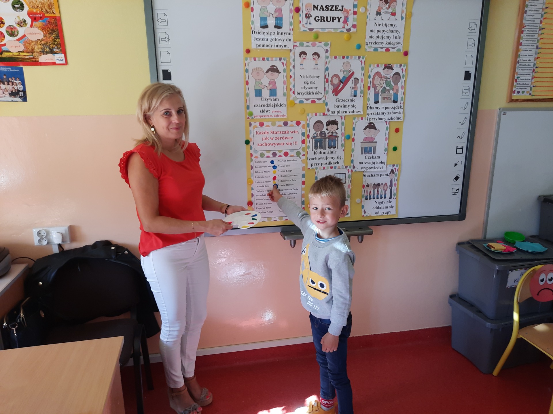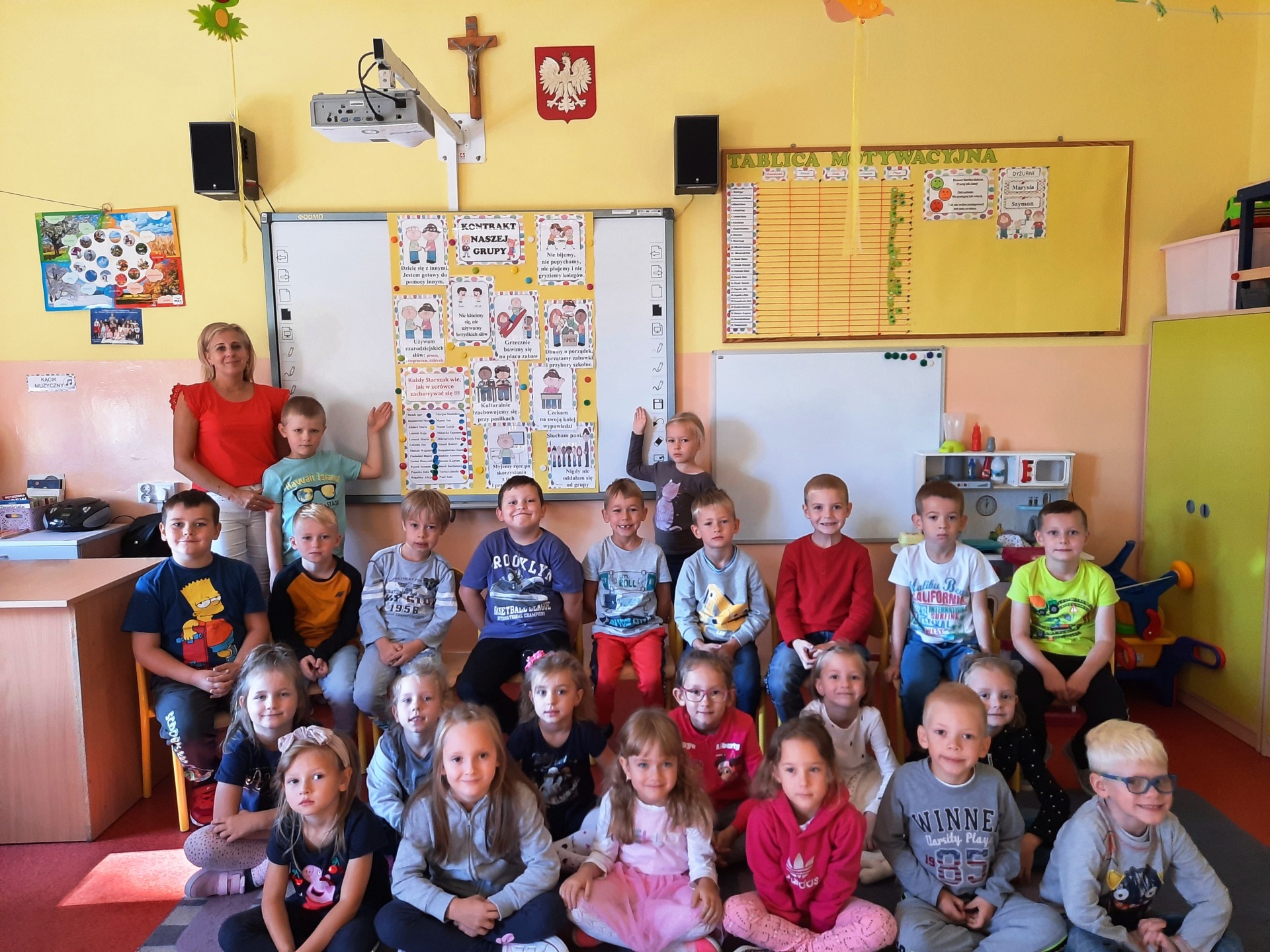 W pierwszych dniach września dzieci z grupy Starszaków same wybrały i zadecydowały jaki chcą mieć znaczki rozpoznawcze, Następnie odbyły się bardzo poważne zajęcia na temat Kodeksu Przedszkolaka. Nasze dzieci, choć mają dopiero pięć i sześć lat, świetnie pojmują i oceniają, jakie zachowania są dobre, a jakie złe. Wszystkie bardzo uroczyście obiecały przestrzegać naszego Kodeksu, bo nie chcą, aby ktoś przez nie był smutny lub płakał. Sytuacje konfliktowe są natychmiast rozwiązywane. Najpierw wspólnie ustaliliśmy zasady obowiązujące w naszej grupie, następnie dzieci podpisały się odciskiem palca pod zasadami zawartymi w kodeksie.