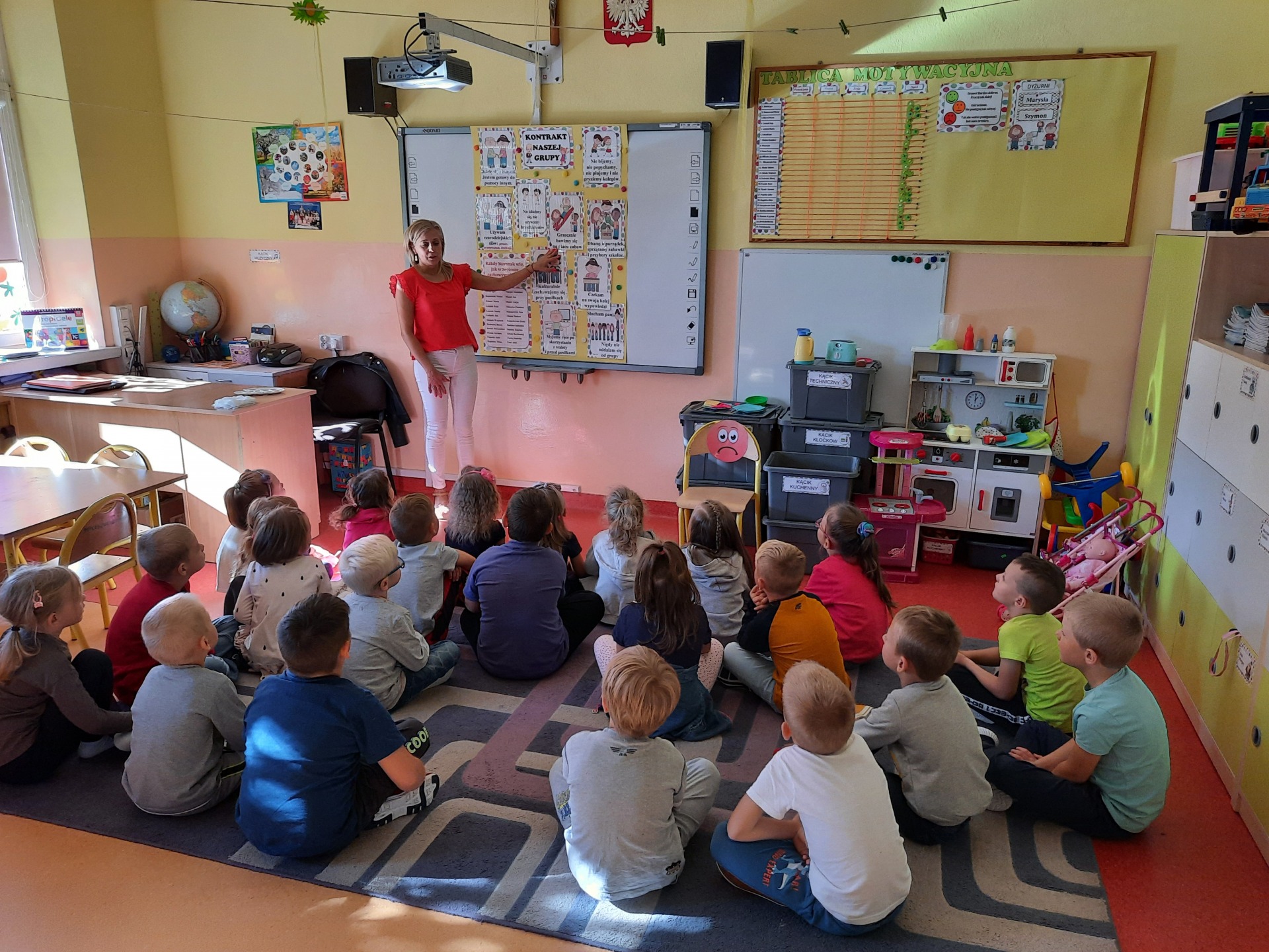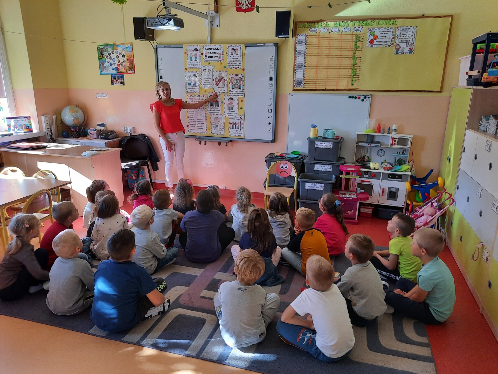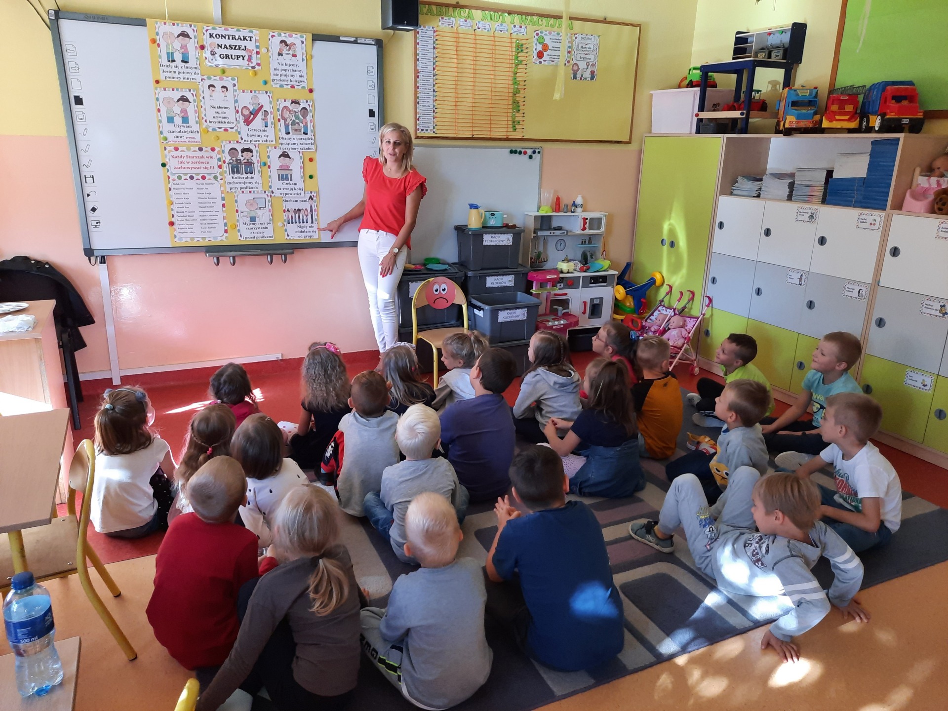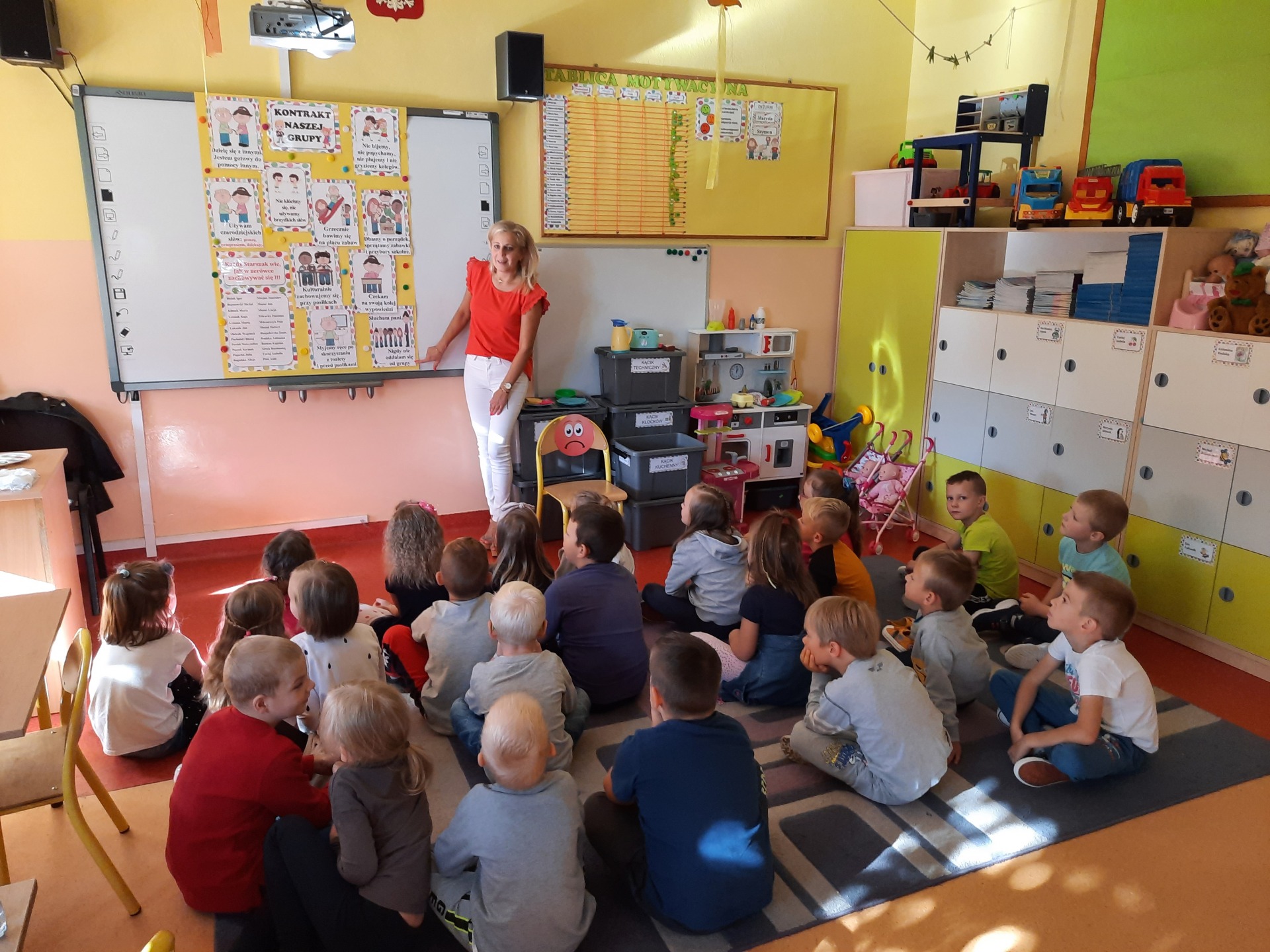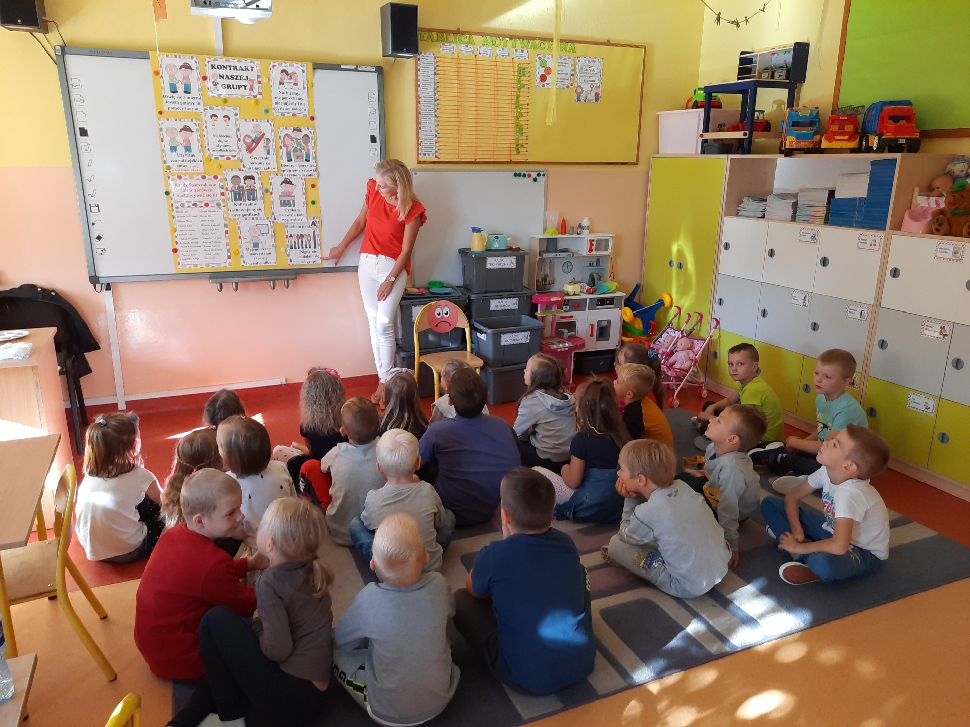 W pierwszych dniach września dzieci z grupy Starszaków same wybrały i zadecydowały jaki chcą mieć znaczki rozpoznawcze, Następnie odbyły się bardzo poważne zajęcia na temat Kodeksu Przedszkolaka. Nasze dzieci, choć mają dopiero pięć i sześć lat, świetnie pojmują i oceniają, jakie zachowania są dobre, a jakie złe. Wszystkie bardzo uroczyście obiecały przestrzegać naszego Kodeksu, bo nie chcą, aby ktoś przez nie był smutny lub płakał. Sytuacje konfliktowe są natychmiast rozwiązywane. Najpierw wspólnie ustaliliśmy zasady obowiązujące w naszej grupie, następnie dzieci podpisały się odciskiem palca pod zasadami zawartymi w kodeksie.