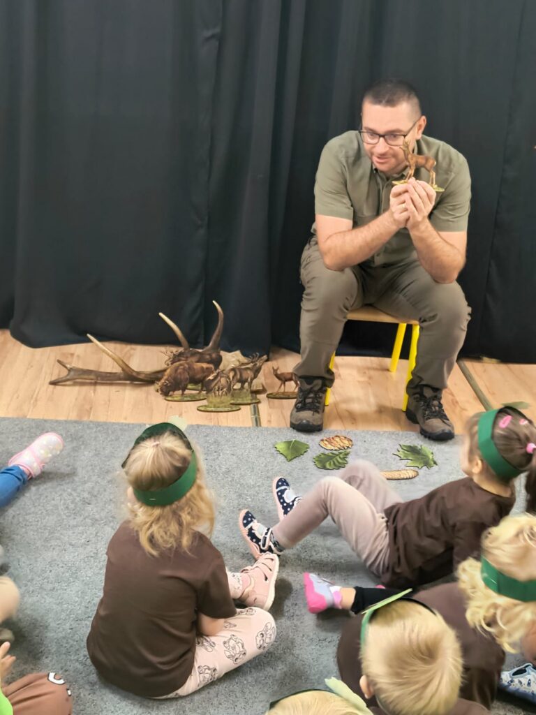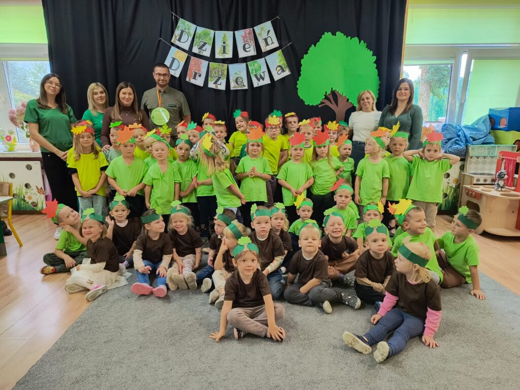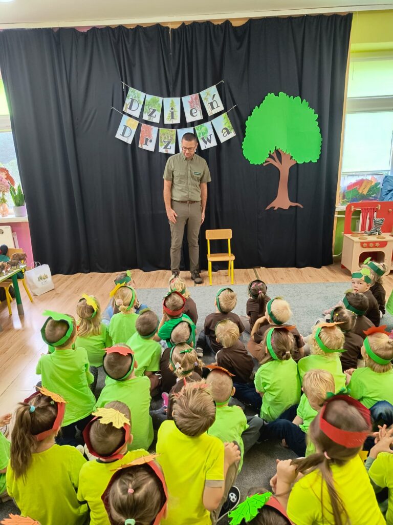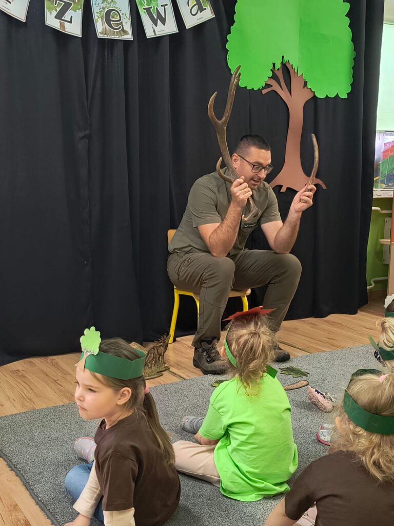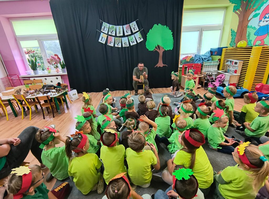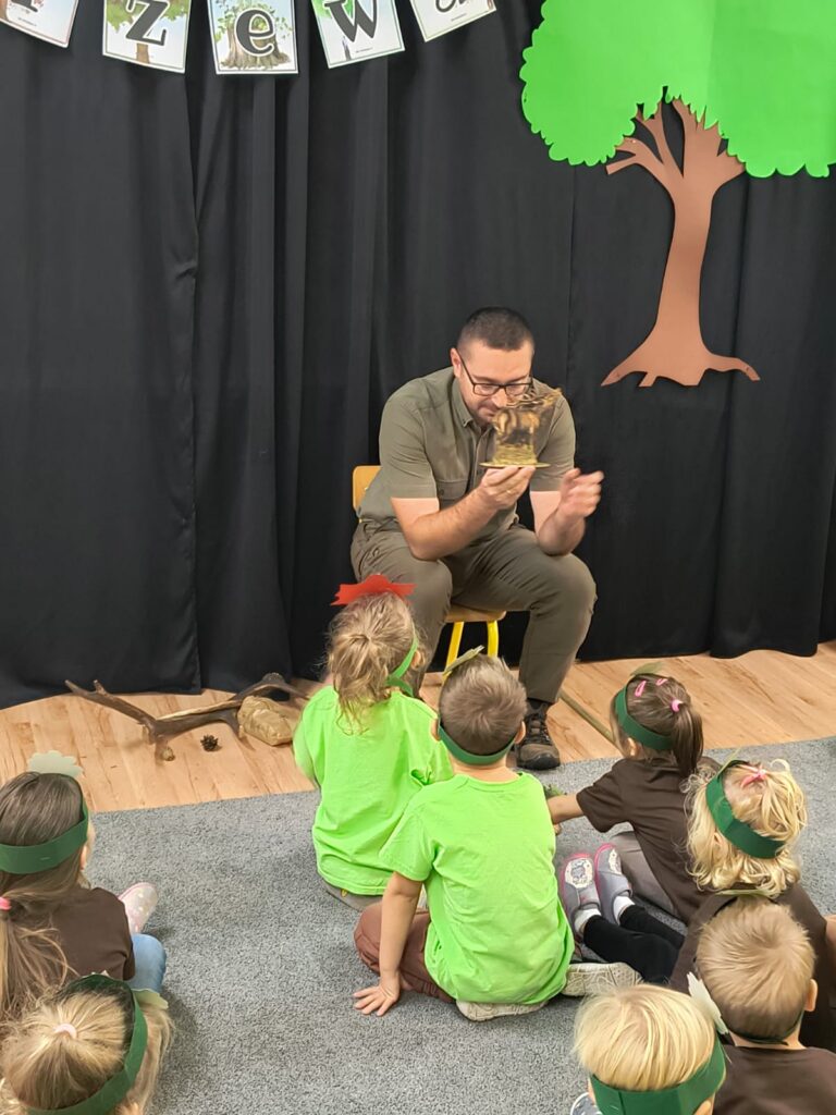 Dnia 7 października w przedszkolu z okazji „Dnia Drzewa” gościliśmy Pana Leśnika. Nasz gość opowiedział przedszkolakom o zwierzętach żyjących w lesie, roślinności, a także o tym, jak sadzi się i pielęgnuje drzewa. Dzieci dowiedziały się również, w jaki sposób leśnicy chronią drzewa przed szkodnikami oraz jak należy zachowywać się podczas pobytu w lesie. Przedszkolaki z dużym zainteresowaniem słuchały ciekawostek i chętnie zadawały pytania.