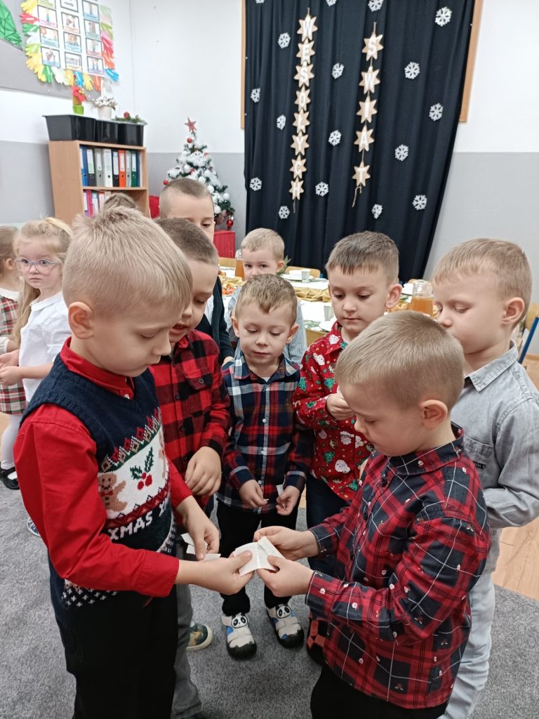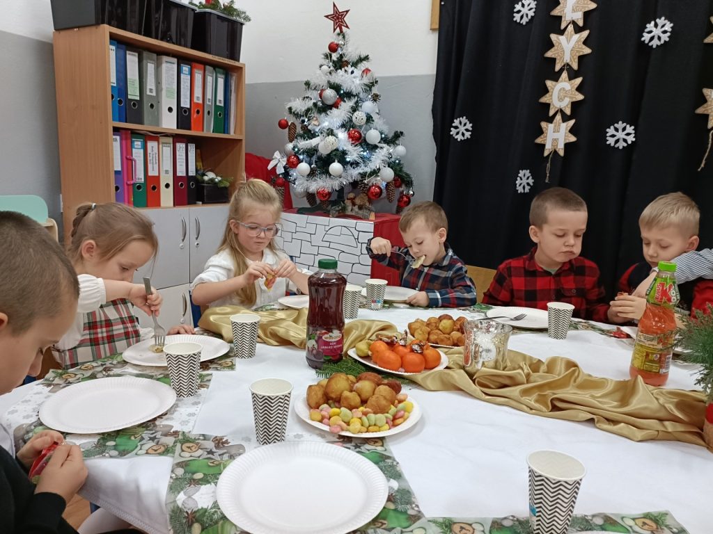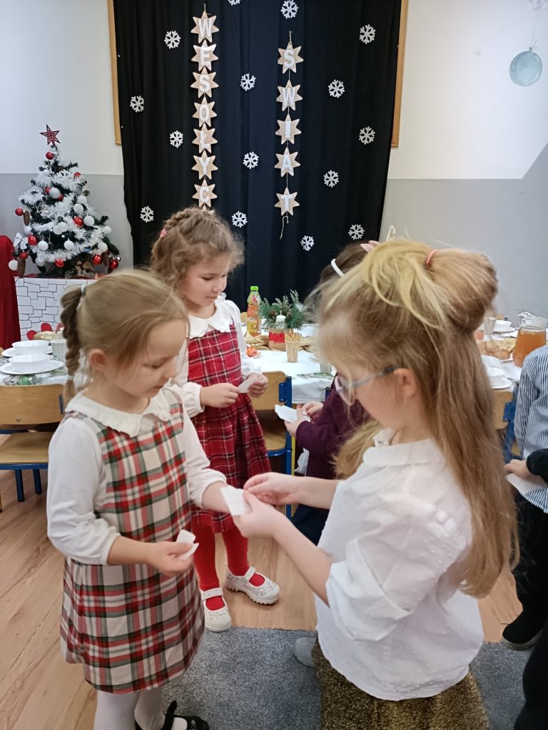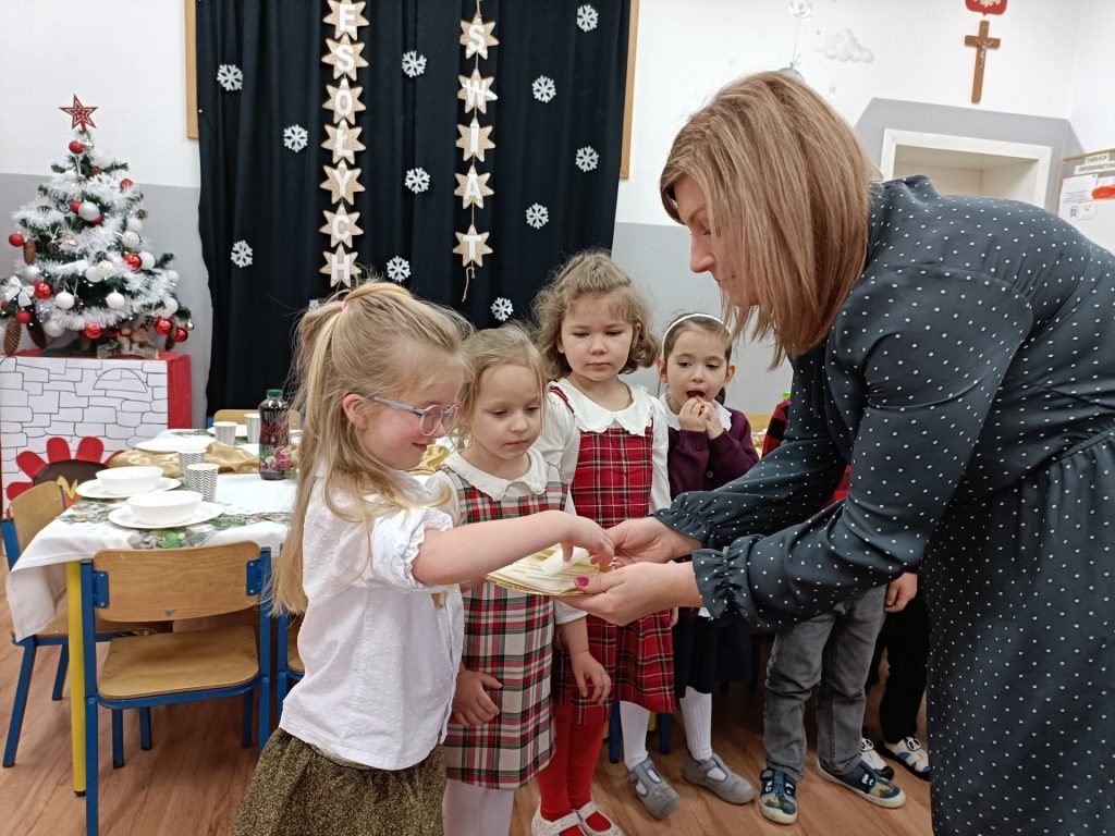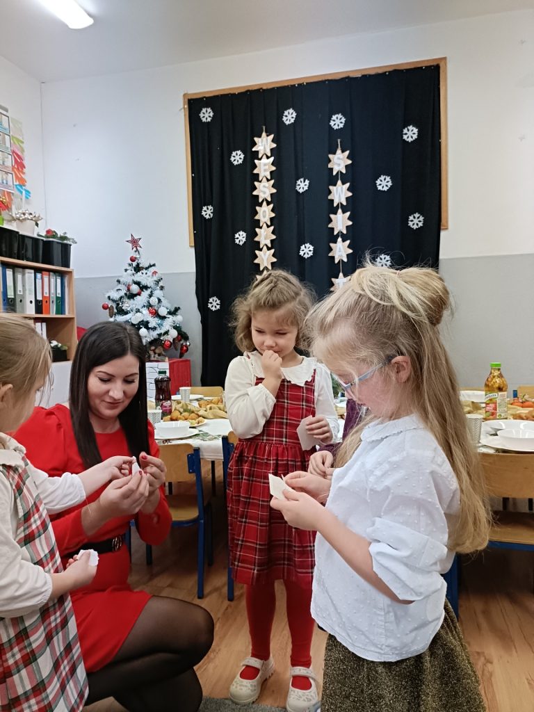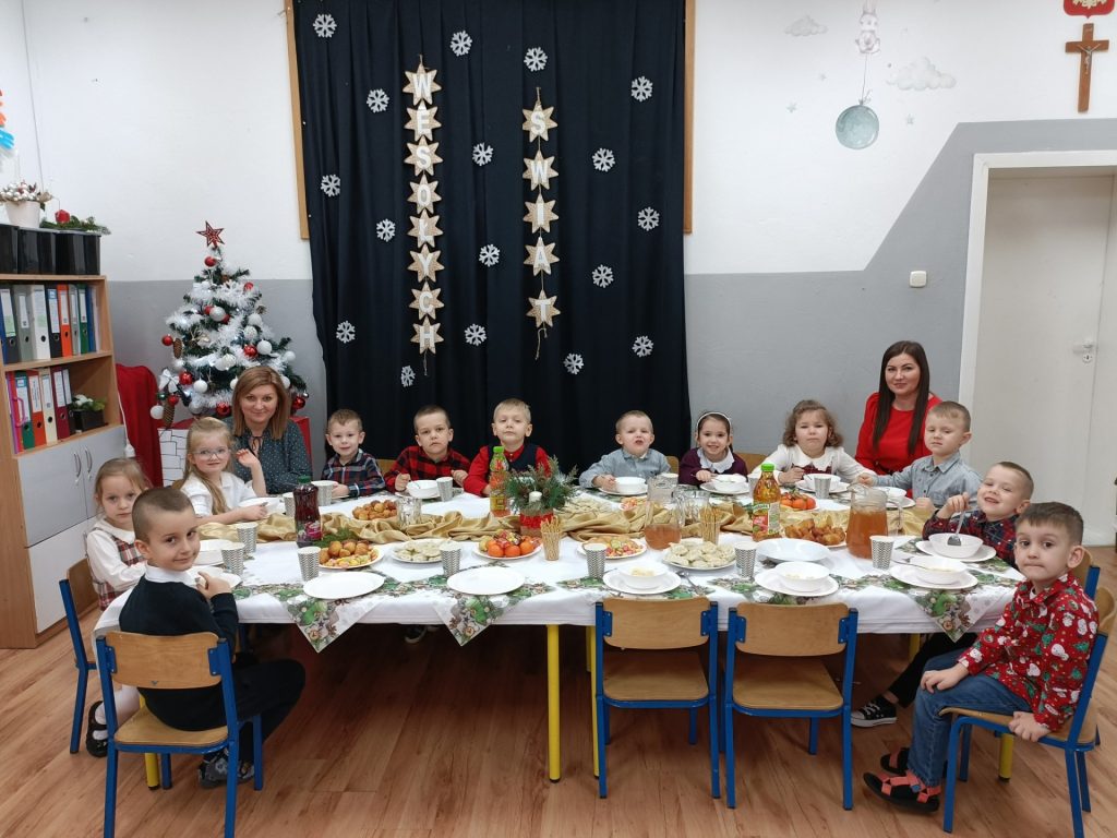 ,,W czwartek 21 grudnia w naszym przedszkolu odbyła się Wigilia. Dzieci wspólnie z Ciociami kolędowały, składały sobie życzenia i jadły wspólny posiłek przy pięknie udekorowanym stole. Takie podniosłe chwile nie tylko utrwalają dzieciom znajomość tradycji i zwyczajów świątecznych lecz również, co najważniejsze wzmacniają bliskie serdeczne relacje. Niech ten magiczny czas pozwoli nam zapomnieć o smutkach codzienności i sprawi, że każdy dzień będzie świętem ![]()