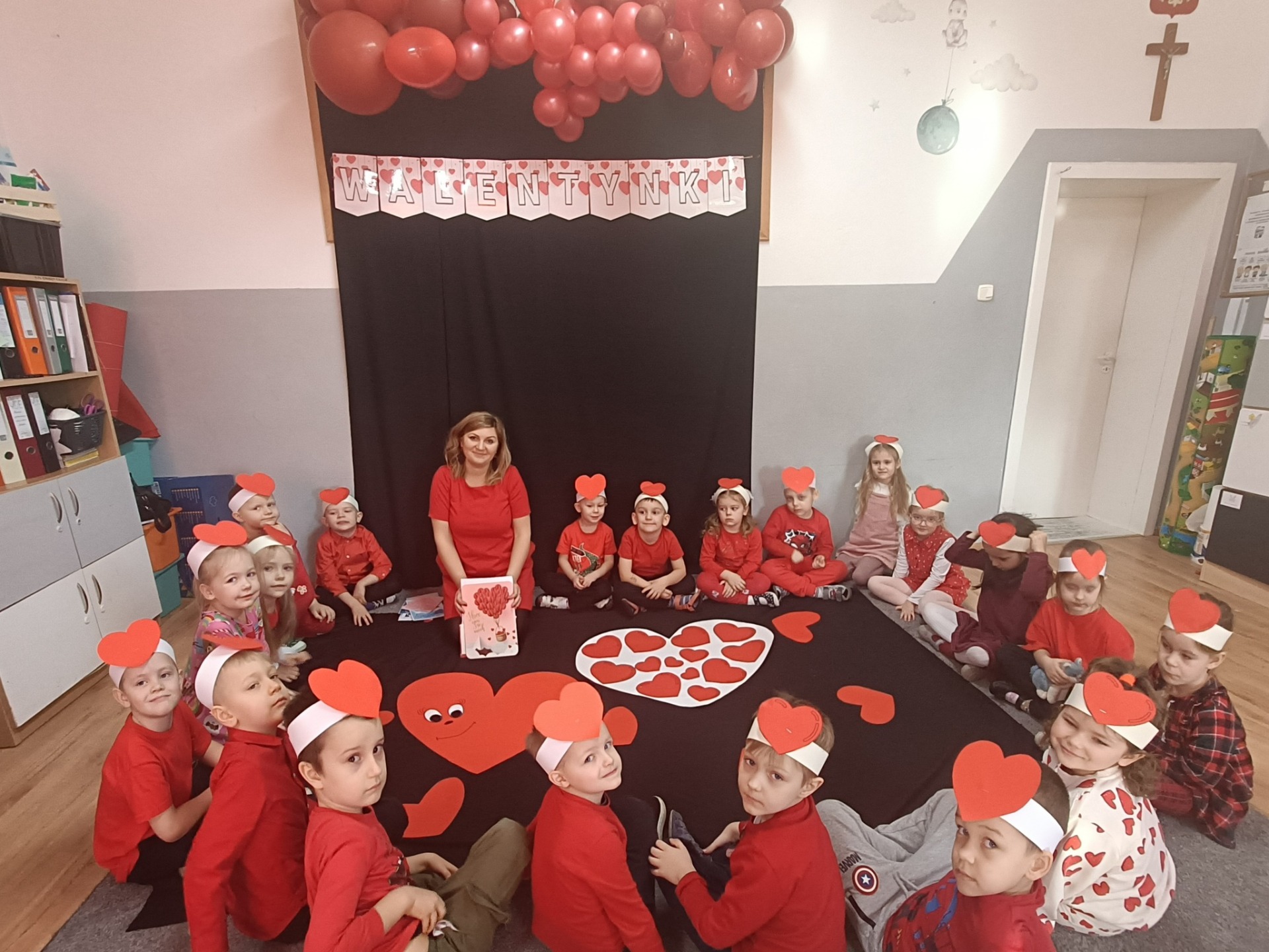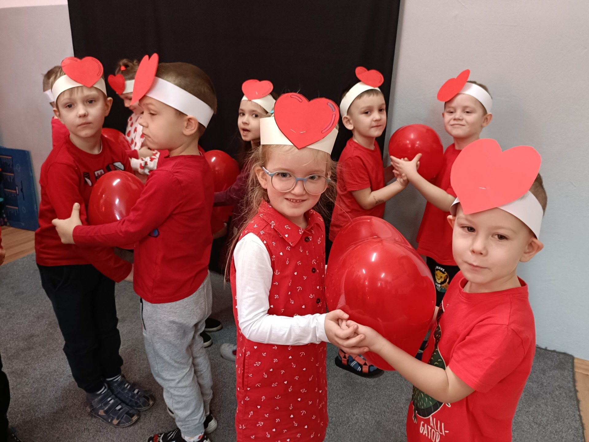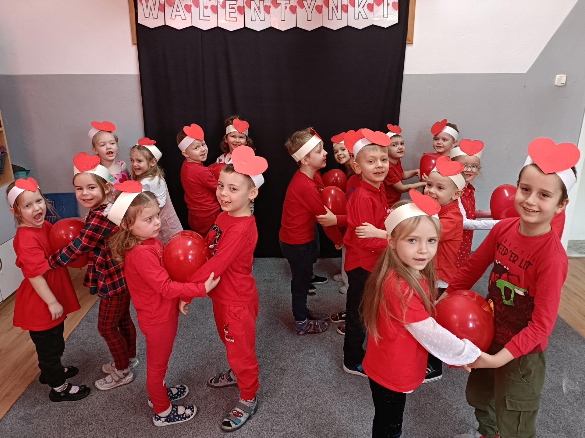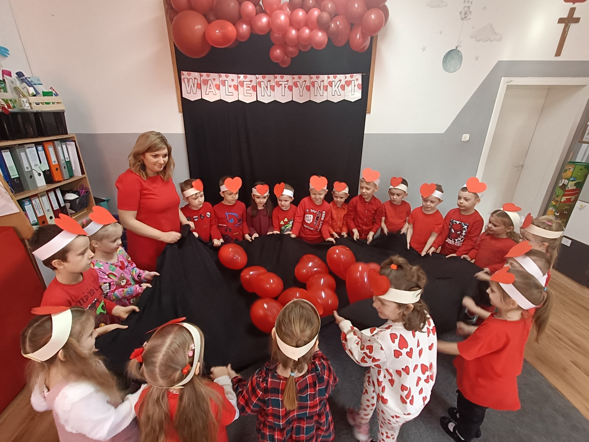 W środę 14 lutego obchodziliśmy w naszym przedszkolu Walentynki. Dzieci ubrały się tego dnia na czerwono, a sala przystrojona była czerwonymi balonikami. Przedszkolaki zapoznały się z tradycją Walentynek, rozmawiały o tym jak można okazywać miłość bliskim osobom nie tylko od święta. Dzieci obdarowywały się wzajemnie kartkami, które wrzucały do skrzynki walentynkowej. Żabki bawiły się z chustą animacyjną, rozwiązywały zagadki, nie zabrakło także słodkiego upominku.