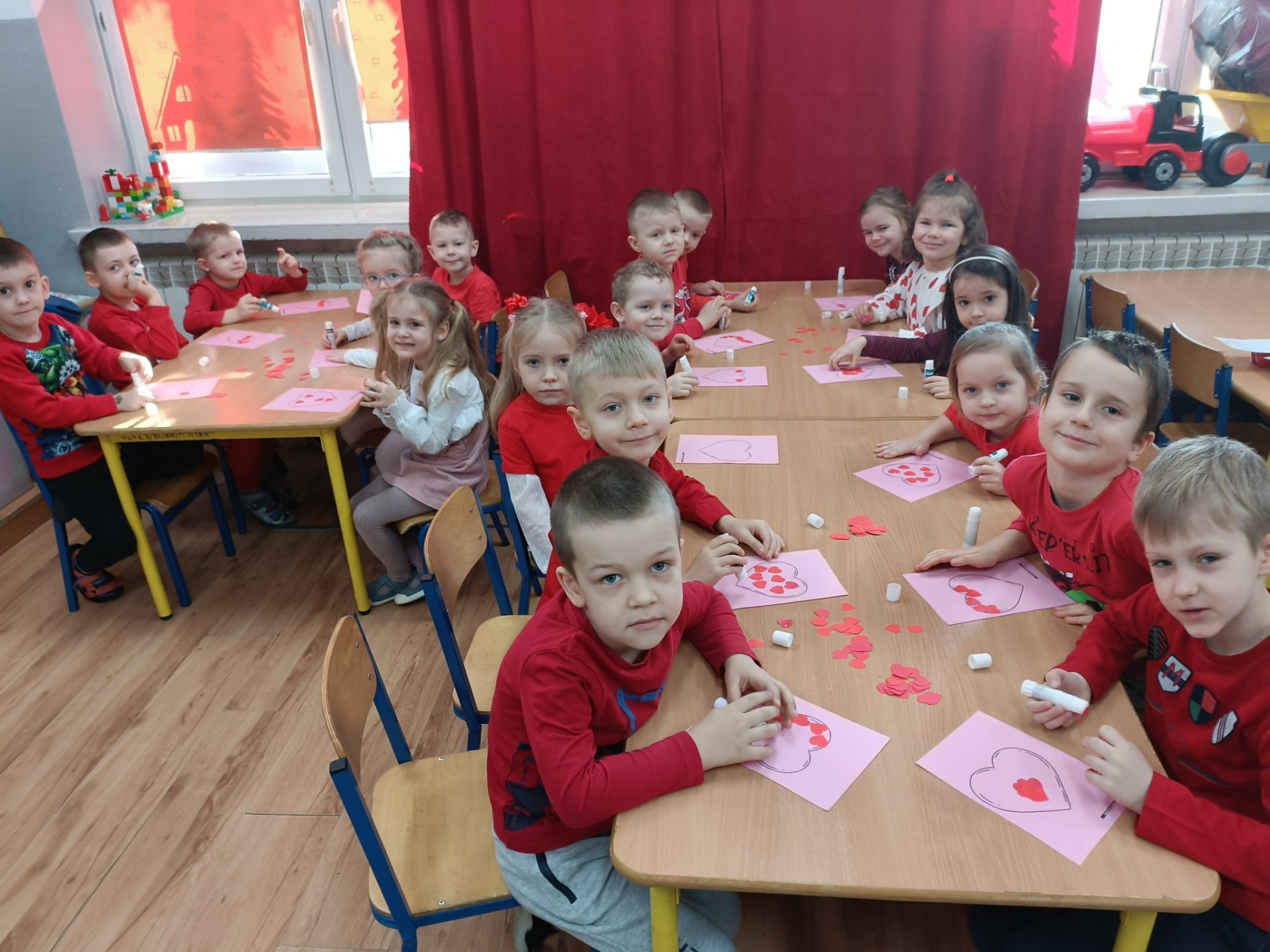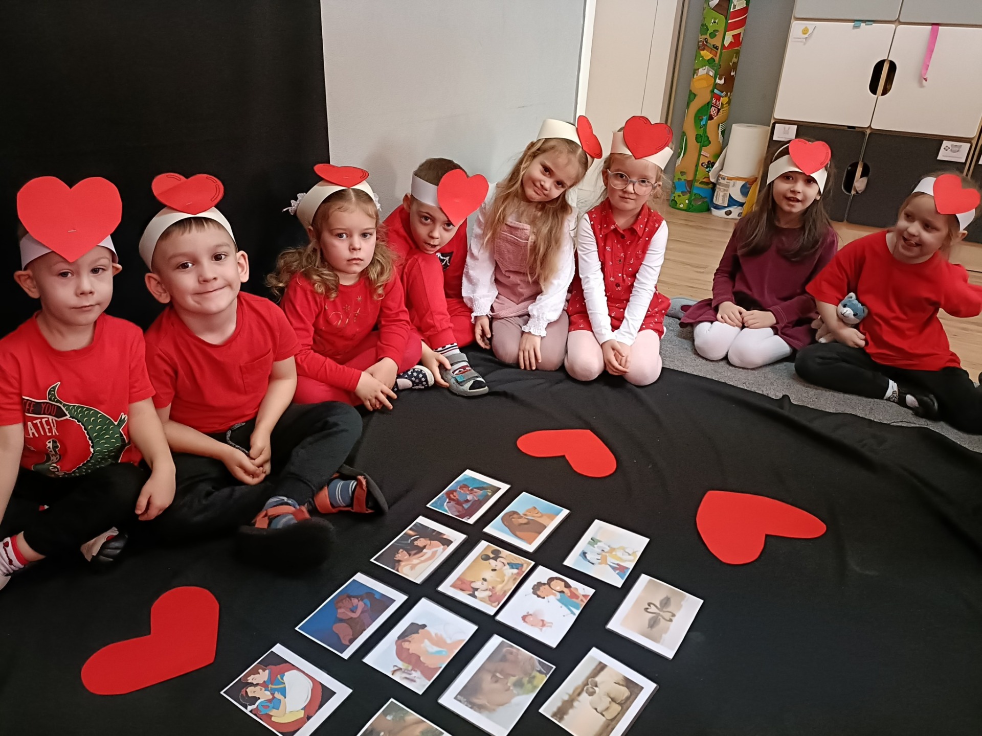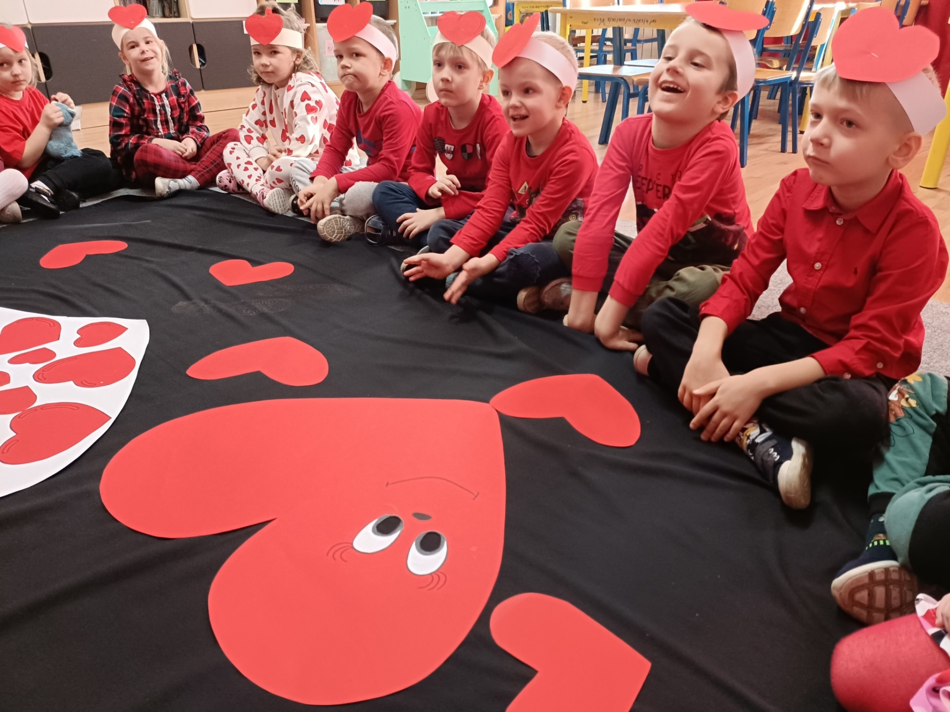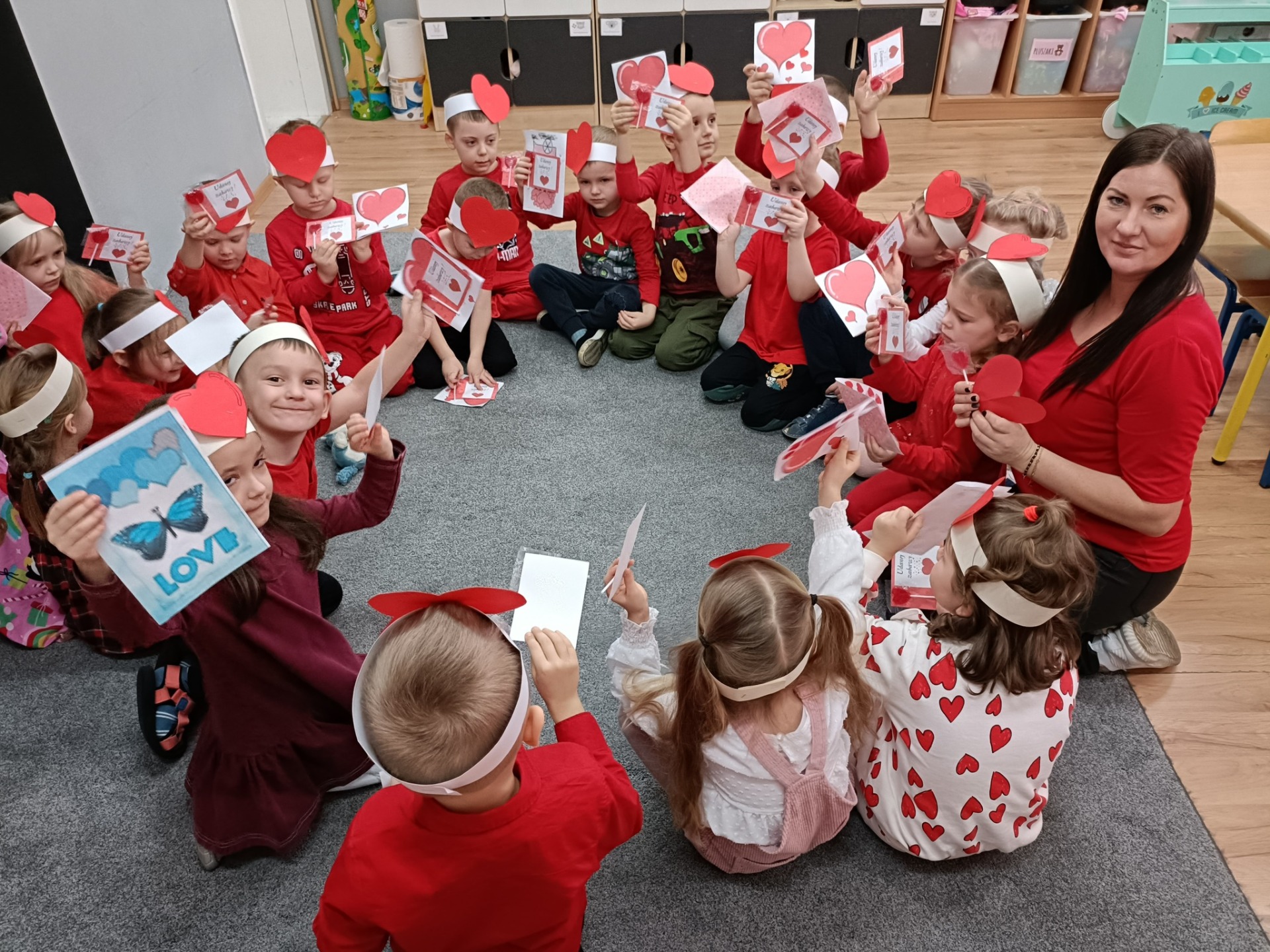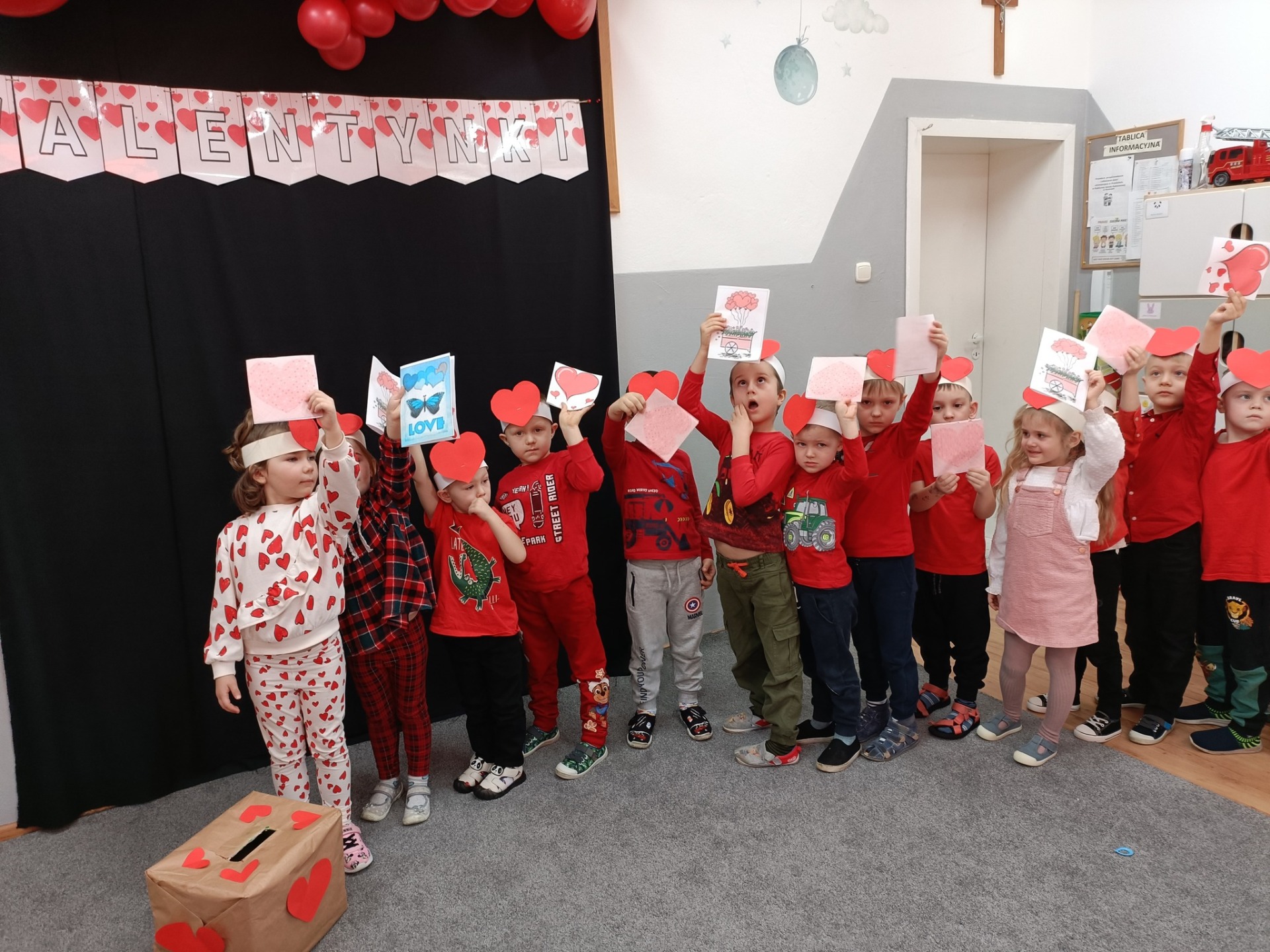 W środę 14 lutego obchodziliśmy w naszym przedszkolu Walentynki. Dzieci ubrały się tego dnia na czerwono, a sala przystrojona była czerwonymi balonikami. Przedszkolaki zapoznały się z tradycją Walentynek, rozmawiały o tym jak można okazywać miłość bliskim osobom nie tylko od święta. Dzieci obdarowywały się wzajemnie kartkami, które wrzucały do skrzynki walentynkowej. Żabki bawiły się z chustą animacyjną, rozwiązywały zagadki, nie zabrakło także słodkiego upominku.