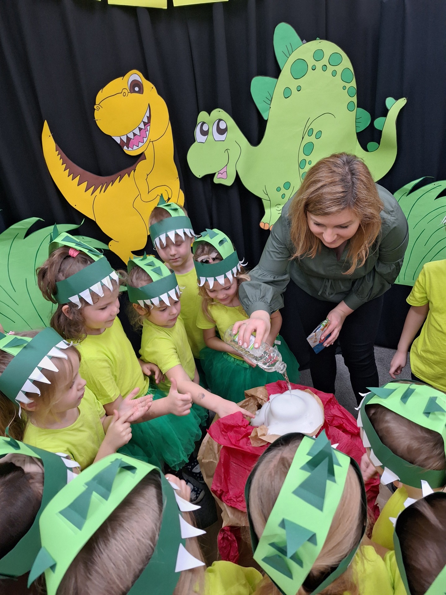 Dziś obchodziliśmy w przedszkolu Dzień Dinozaura. Z tej okazji zorganizowaliśmy zajęcia, które wprowadziły dzieci w prehistoryczny świat i przybliżyły im życie tych wyjątkowych gadów. Żabki dowiedziały się m.in. jak wyglądały, czym się żywiły oraz w jaki sposób prawdopodobnie wyginęły. Podczas zajęć dzieci chętnie porównywały wygląd dinozaurów, określały ich wielkość, z łatwością rozpoznawały nazwy przyniesionych z domu dinozaurów, dzieląc się swoją wiedzą. Największe zainteresowanie wzbudziły w przedszkolakach zajęcia badawcze, dzięki którym dzieci mogły m.in. poznać działanie wulkanu, zamienić się w paleontologów, wydobywać dinozaury z lodu itp.