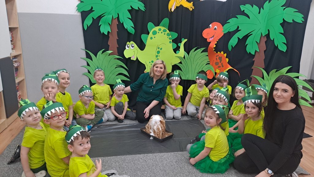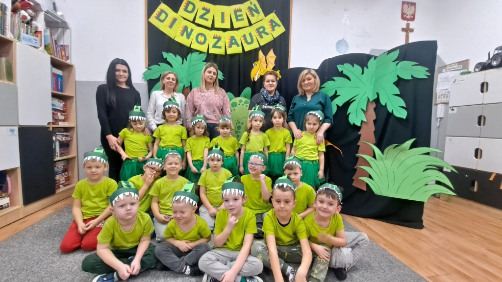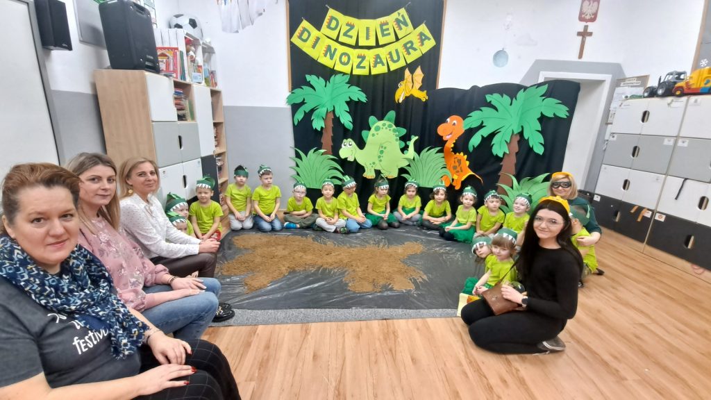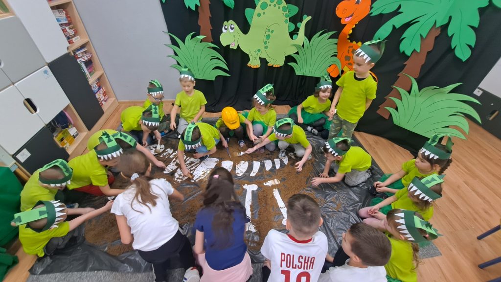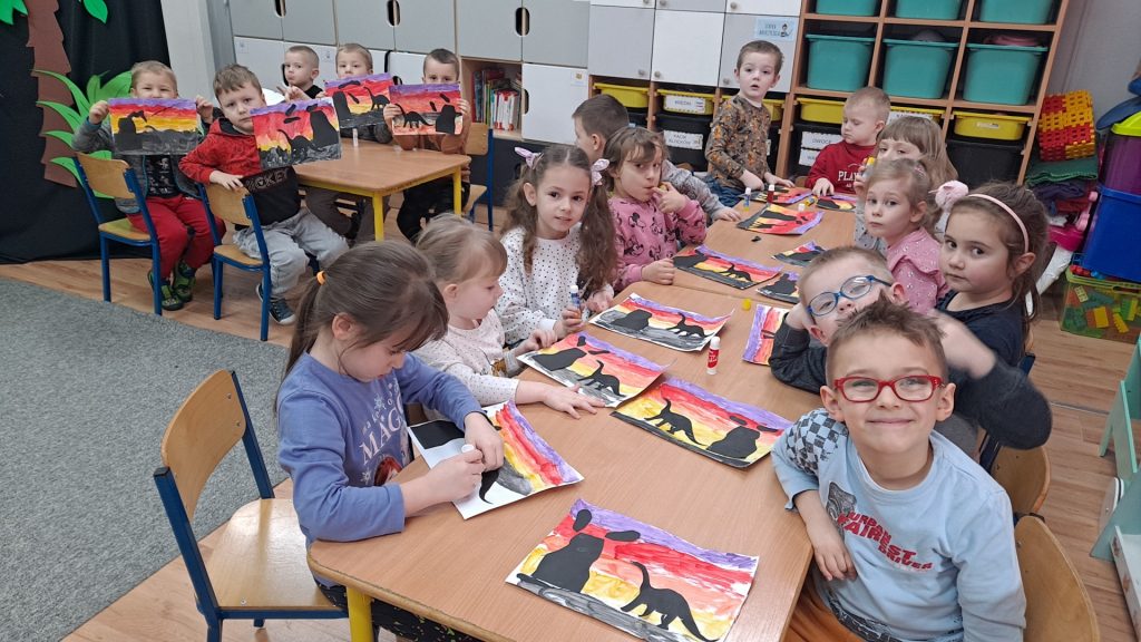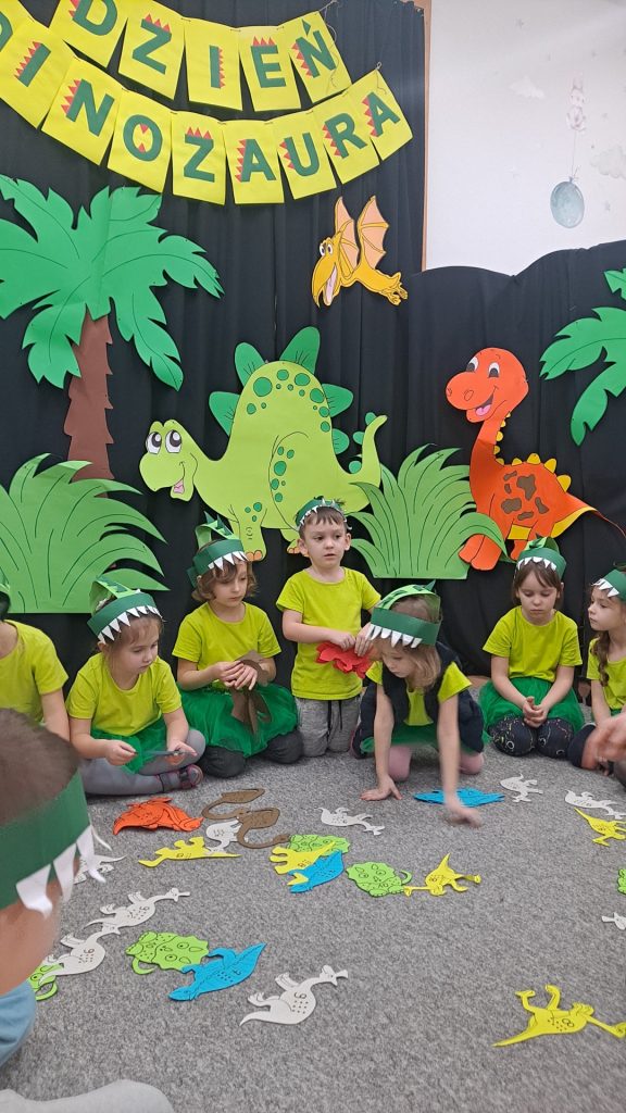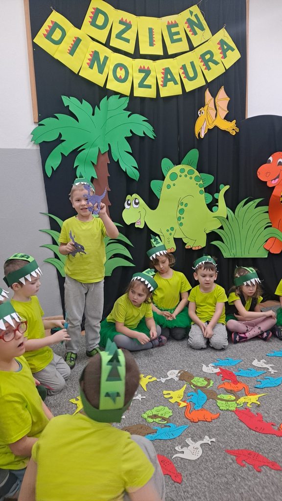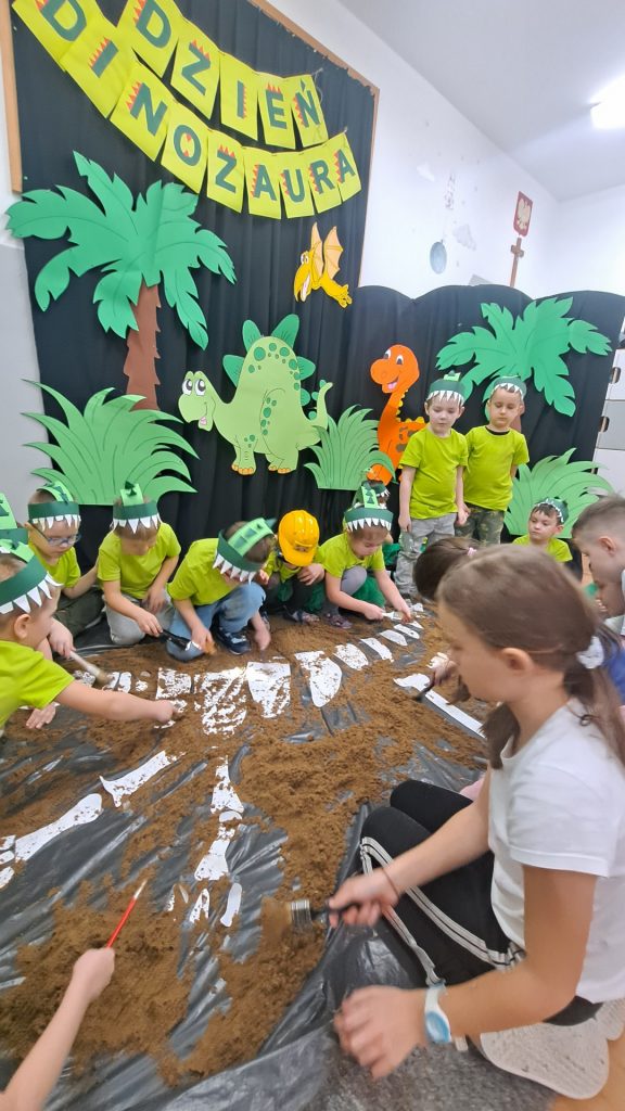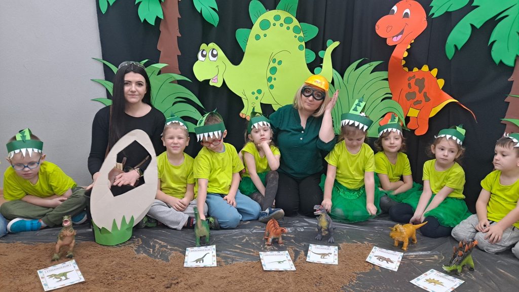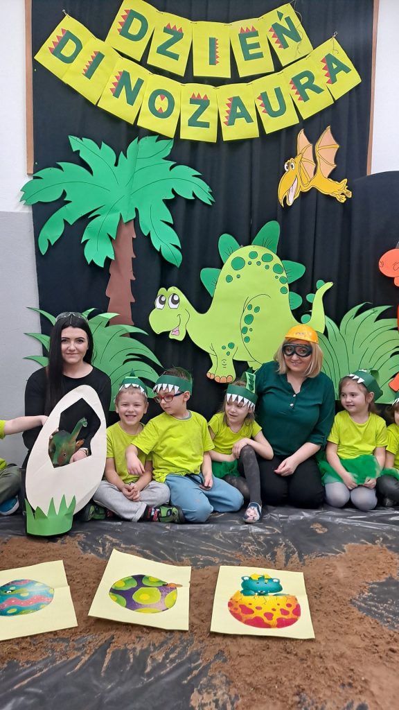 Dziś Żabki obchodziły Światowy Dzień Dinozaura, który stwarza wspaniałą okazję do przybliżenia dzieciom tych prehistorycznych zwierząt. Dzieci założyły na głowę wykonane przez wychowawczynię opaski, dzięki którym wyglądały jak stegozaury i bawiły w odkrywanie szkieletu dinozaura. Pomogli im w tym uczniowie klasy trzeciej, którzy byli naszymi gośćmi. Do wspólnej zabawy zaprosiliśmy również Panie nauczycielki: Panią Ewę Stępniewską, Panią Anię Kupis i Panią Martynkę Piwowarczyk. Przedszkolaki wspólnie z Ciociami klasyfikowały dinozaury, przeliczały je, segregowały oraz uczyły się ich nazw. Żabki zainspirowane wysłuchanym wierszem B. Formy pt. „Kto widział Dinozaura”, a także oglądanymi ilustracjami chętnie wypowiadały się na temat dinozaurów. Ponadto przedszkolaki wykonały pracę plastyczną “Dino o zachodzie słońca”. Dzieci bawiły się w tym dniu znakomicie, wzbogaciły swoją wiedzę na temat dinozaurów oraz nauczyły się współpracy ze starszymi uczniami.