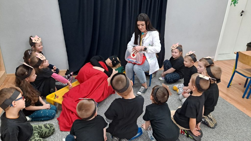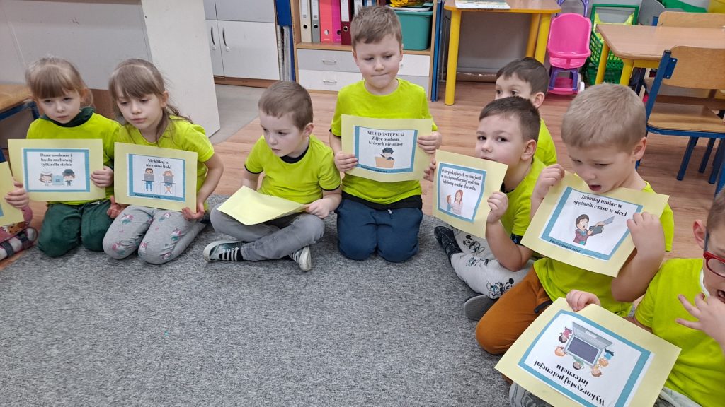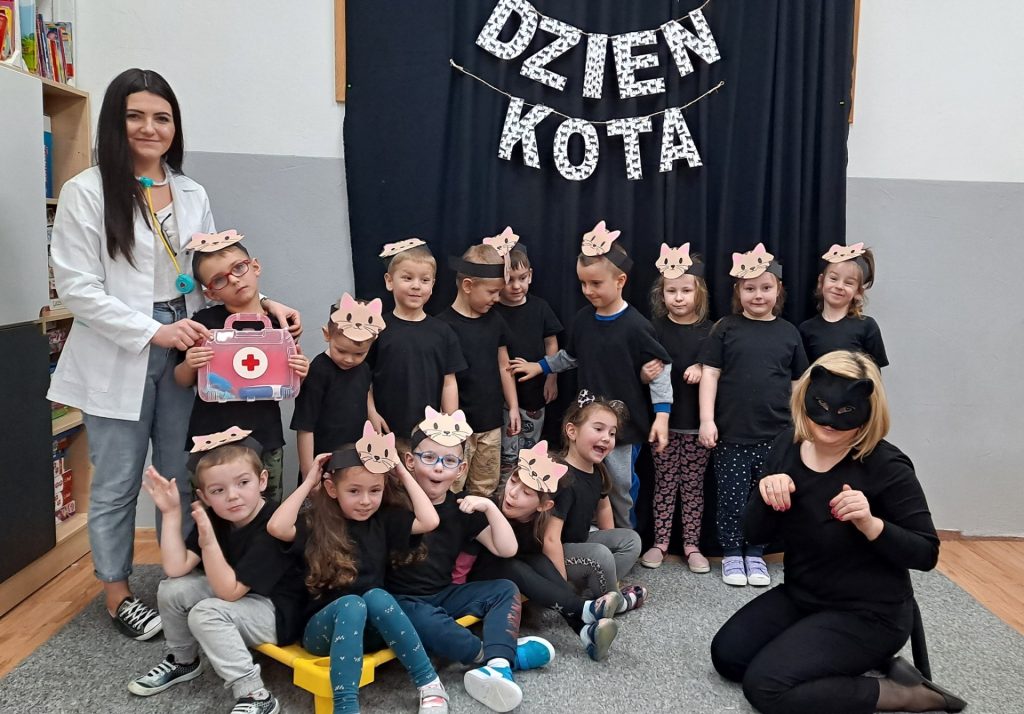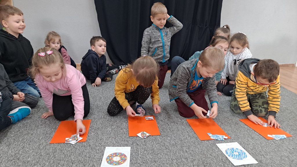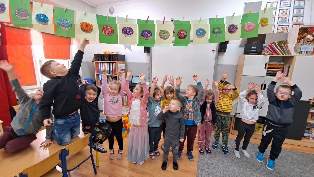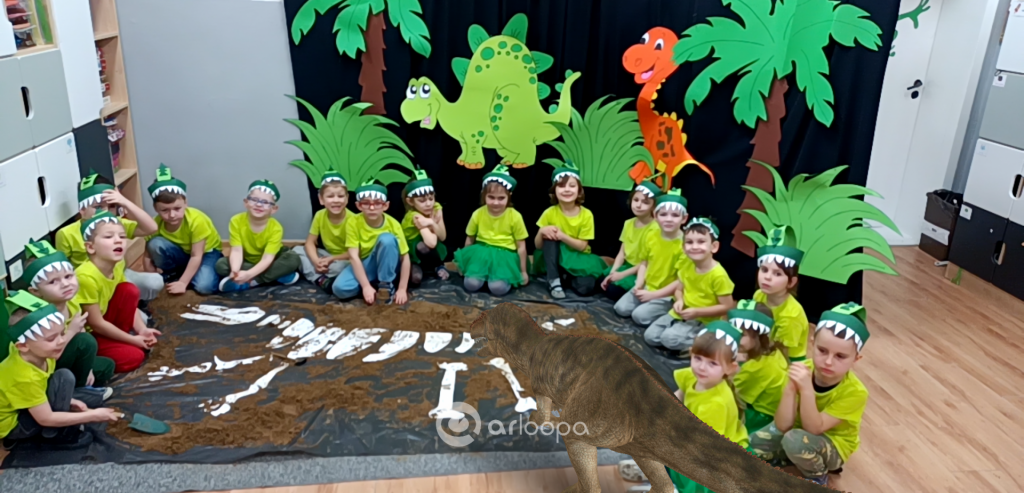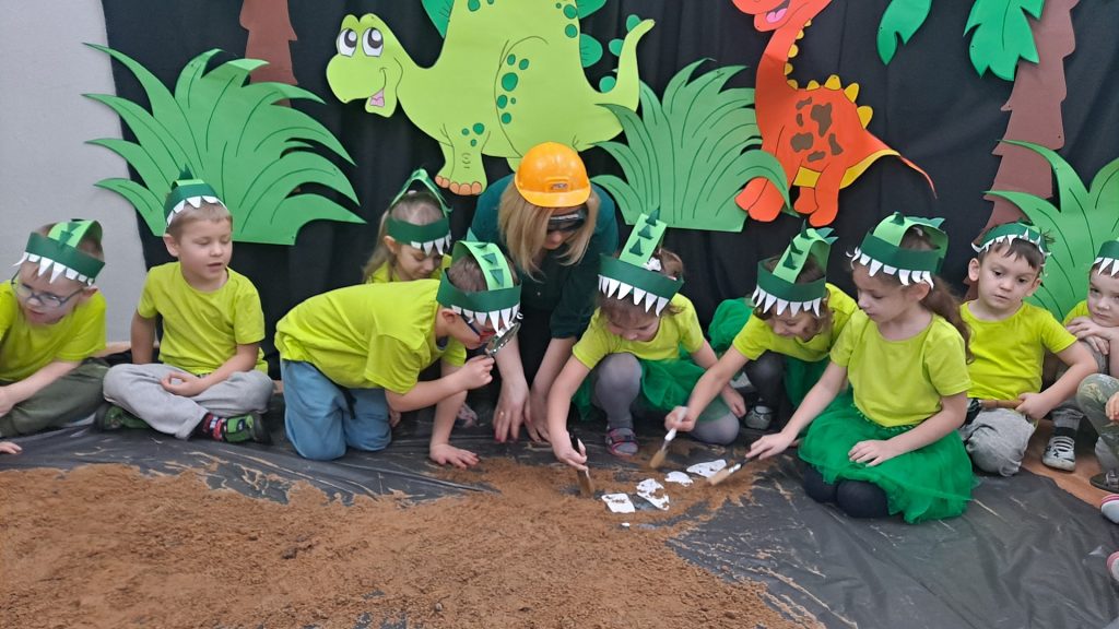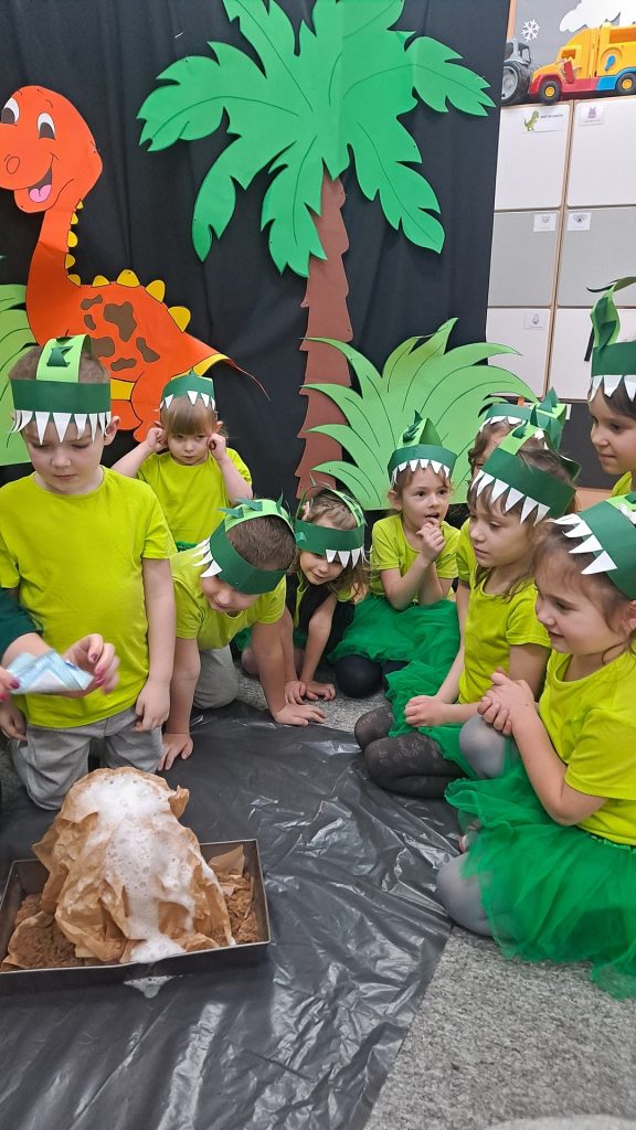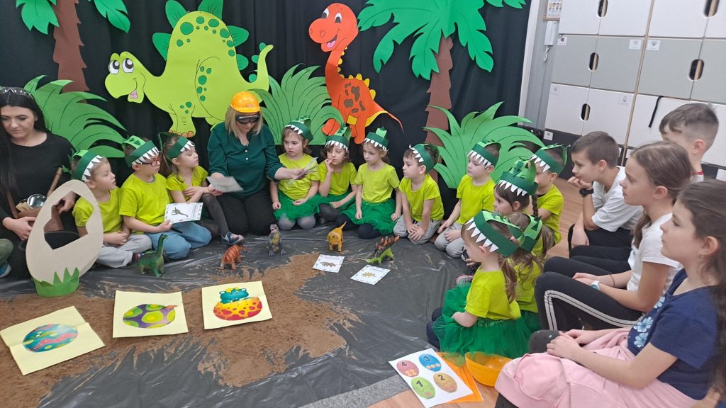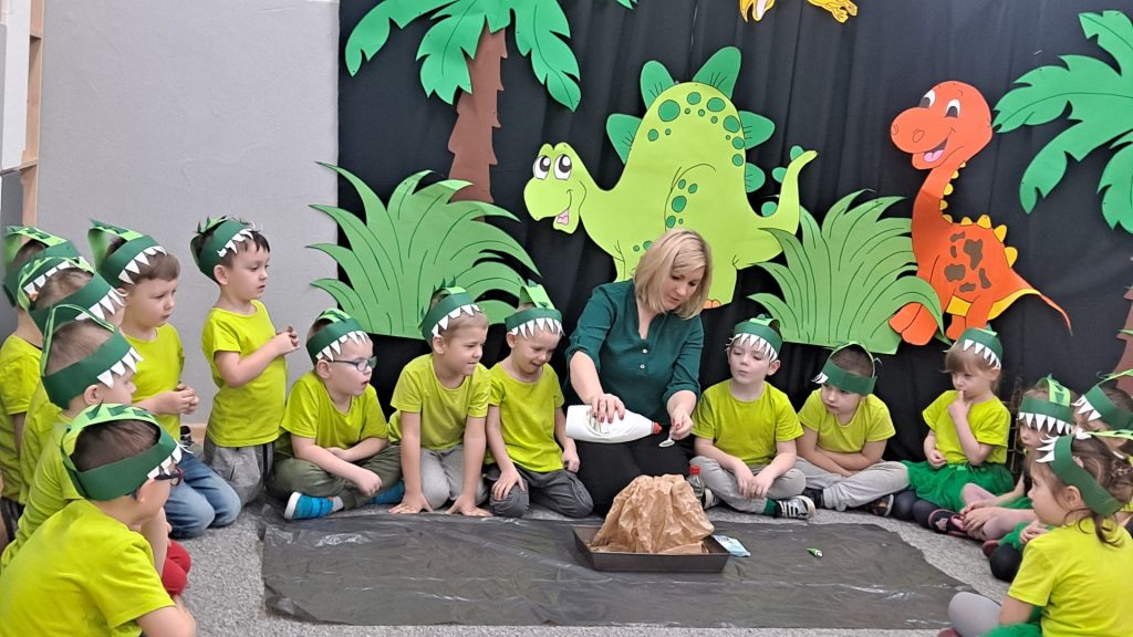 Dziś Żabki obchodziły Światowy Dzień Dinozaura, który stwarza wspaniałą okazję do przybliżenia dzieciom tych prehistorycznych zwierząt. Dzieci założyły na głowę wykonane przez wychowawczynię opaski, dzięki którym wyglądały jak stegozaury i bawiły w odkrywanie szkieletu dinozaura. Pomogli im w tym uczniowie klasy trzeciej, którzy byli naszymi gośćmi. Do wspólnej zabawy zaprosiliśmy również Panie nauczycielki: Panią Ewę Stępniewską, Panią Anię Kupis i Panią Martynkę Piwowarczyk. Przedszkolaki wspólnie z Ciociami klasyfikowały dinozaury, przeliczały je, segregowały oraz uczyły się ich nazw. Żabki zainspirowane wysłuchanym wierszem B. Formy pt. „Kto widział Dinozaura”, a także oglądanymi ilustracjami chętnie wypowiadały się na temat dinozaurów. Ponadto przedszkolaki wykonały pracę plastyczną “Dino o zachodzie słońca”. Dzieci bawiły się w tym dniu znakomicie, wzbogaciły swoją wiedzę na temat dinozaurów oraz nauczyły się współpracy ze starszymi uczniami.