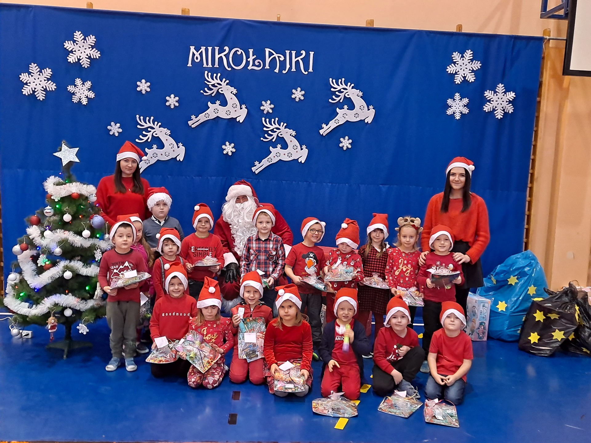 Przedszkolaki zebrały się na hali gimnastycznej, gdzie powitały gościa wierszem i zimową piosenką, a Mikołaj obdarował dzieci wspaniałymi prezentami ![]()
