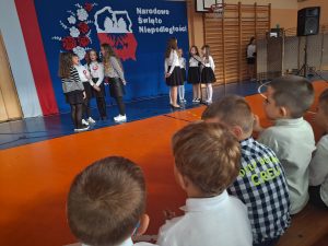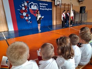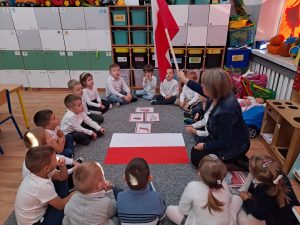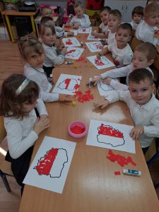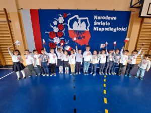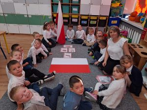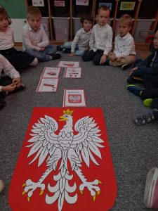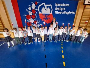Dnia 10 listopada w naszym przedszkolu obchodziliśmy Święto Niepodległości. Z tej okazji wszystkie przedszkolaki przyszły ubrane na galowo i uroczyście świętowały ten ważny dzień. Obchody tego święta rozpoczęliśmy od przypomnienia najważniejszych dla Polaków symboli narodowych. Żabki słuchały wiersza o tematyce patriotycznej i oglądały plansze przedstawiające polskie symbole, a także wykonywały pracę plastyczną. Po przeprowadzonych zajęciach, Żabki ze swoimi ciociami uczestniczyły w przygotowanej przez uczniów szkoły, części artystycznej . Na zakończenie akademii cała społeczność szkolna dumnie, przyjmując właściwą postawę „na baczność”, odśpiewała hymn Polski „Mazurek Dąbrowskiego”.