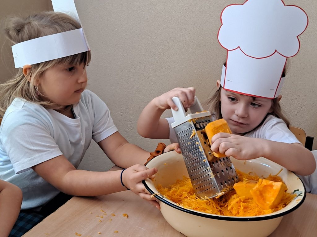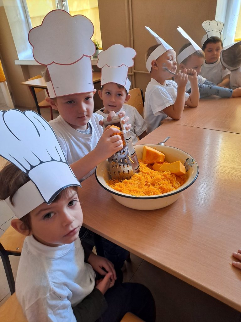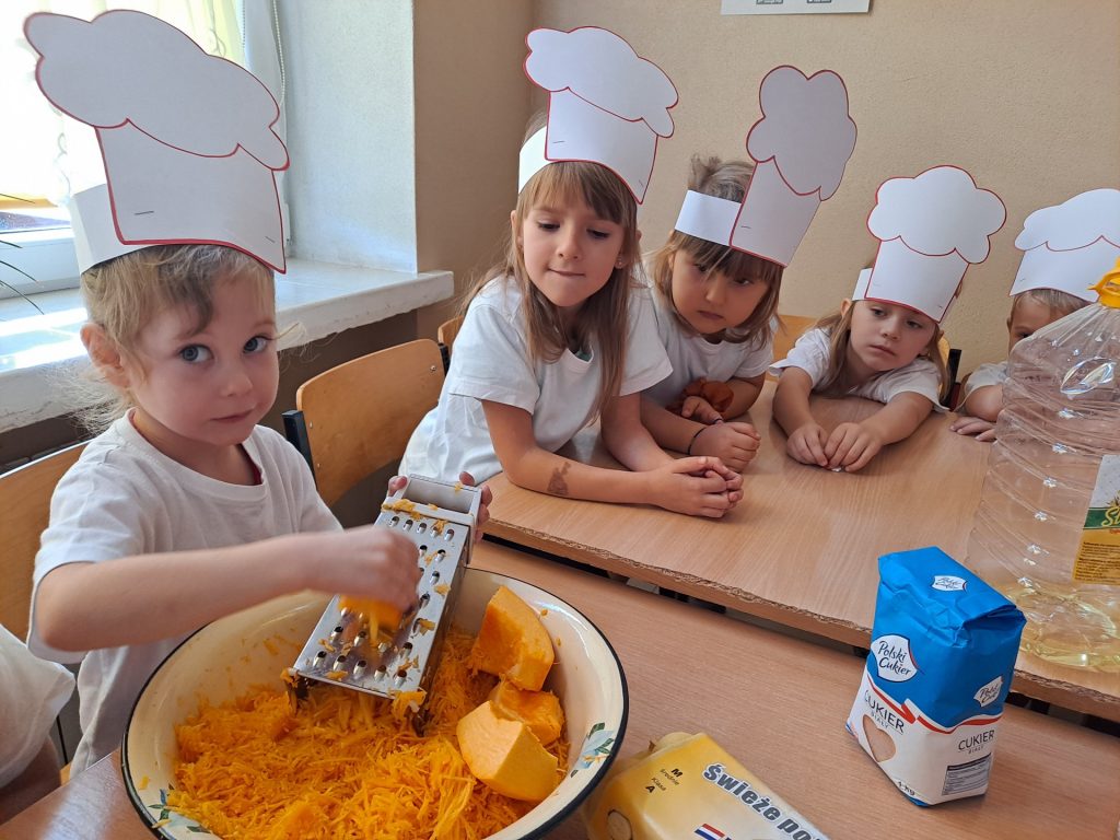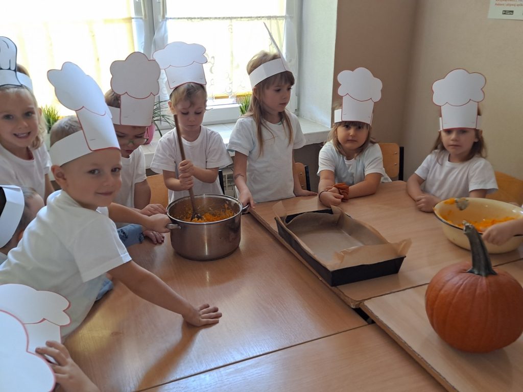 Dzień przed Świętem Dyni, Żabki zamieniły się w kucharzy i brały udział w zajęciach kulinarnych. Celem przeprowadzonych zajęć było nauczenie dzieci czerpania radości ze wspólnego przygotowywania posiłków i przede wszystkim wyrobienie nawyków zdrowego odżywiania. Wspólne przygotowywanie posiłków jest okazją do aktywnego i pożytecznego spędzania czasu. Po zapoznaniu z przepisem kulinarnym, Przedszkolaki razem z ciociami wykonały pyszne i zdrowe ciasto dyniowe 🙂