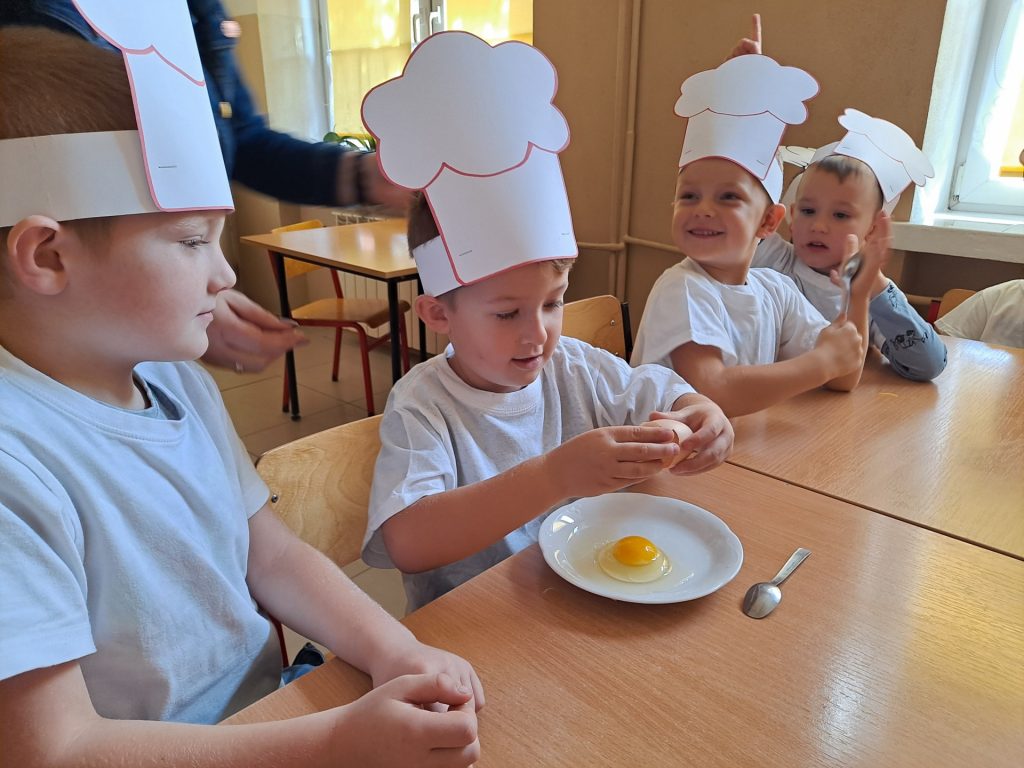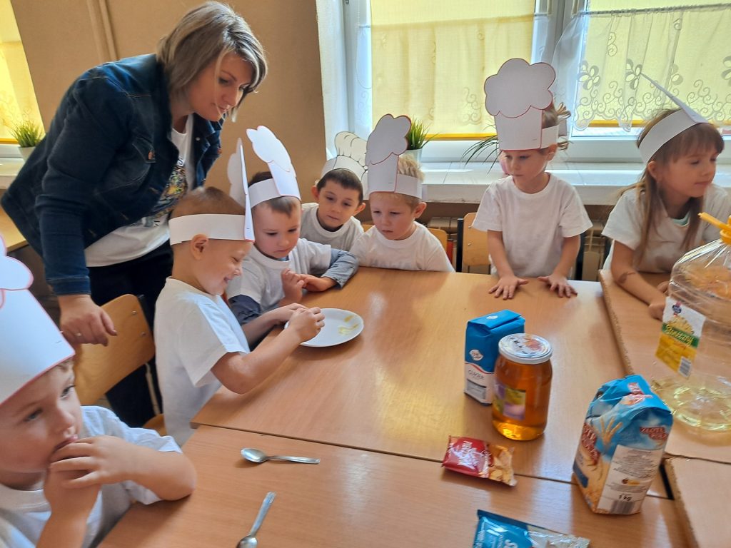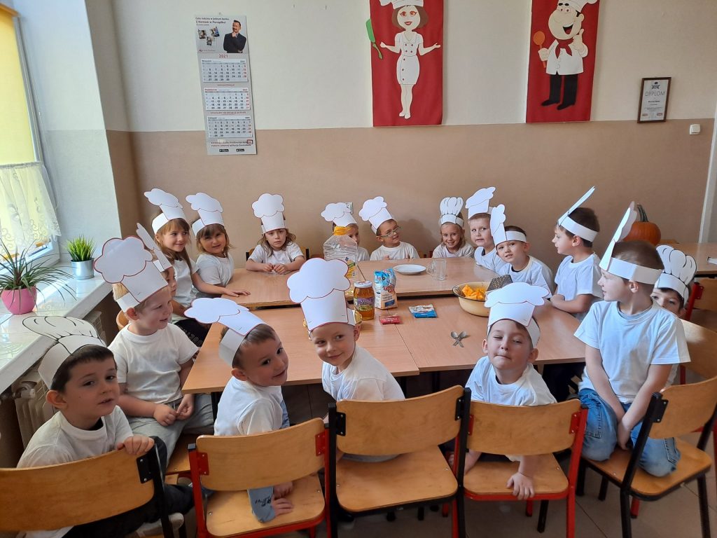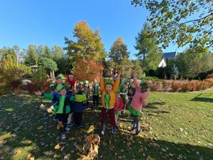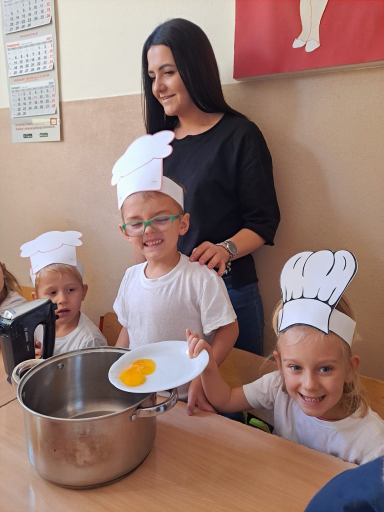 Dzień przed Świętem Dyni, Żabki zamieniły się w kucharzy i brały udział w zajęciach kulinarnych. Celem przeprowadzonych zajęć było nauczenie dzieci czerpania radości ze wspólnego przygotowywania posiłków i przede wszystkim wyrobienie nawyków zdrowego odżywiania. Wspólne przygotowywanie posiłków jest okazją do aktywnego i pożytecznego spędzania czasu. Po zapoznaniu z przepisem kulinarnym, Przedszkolaki razem z ciociami wykonały pyszne i zdrowe ciasto dyniowe 🙂