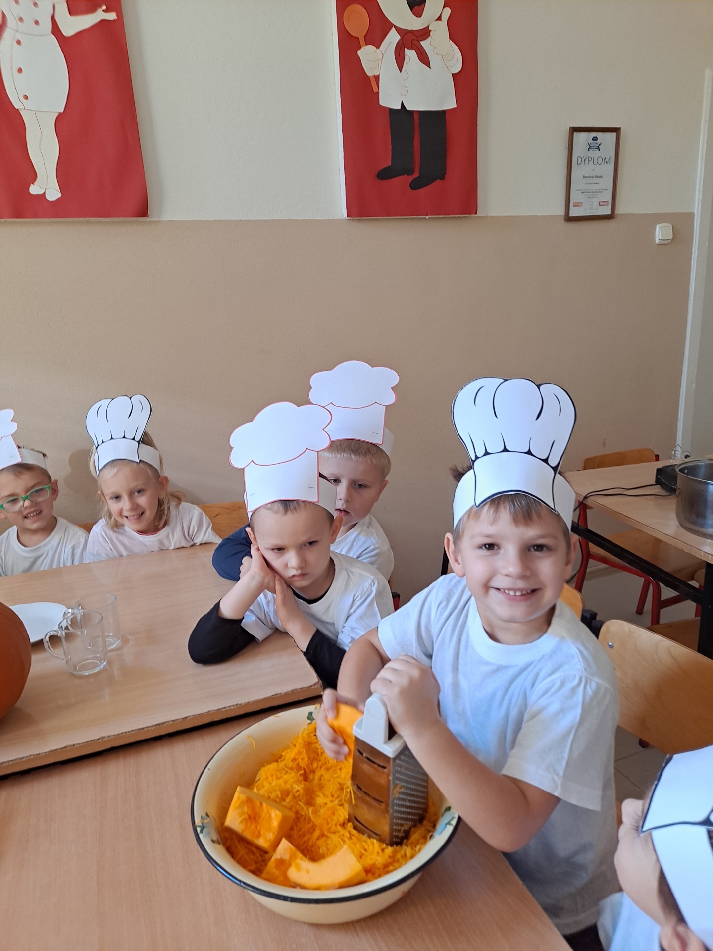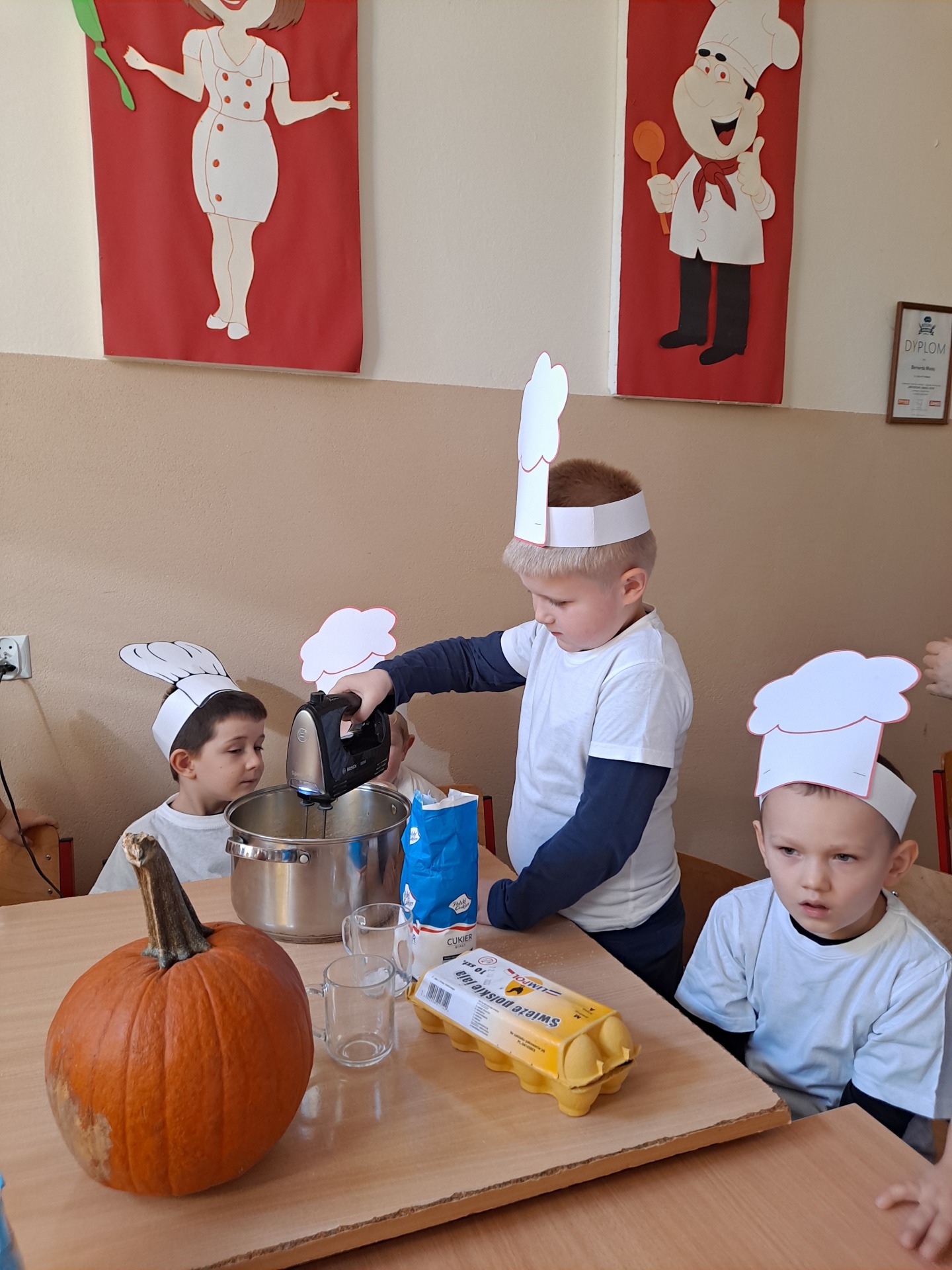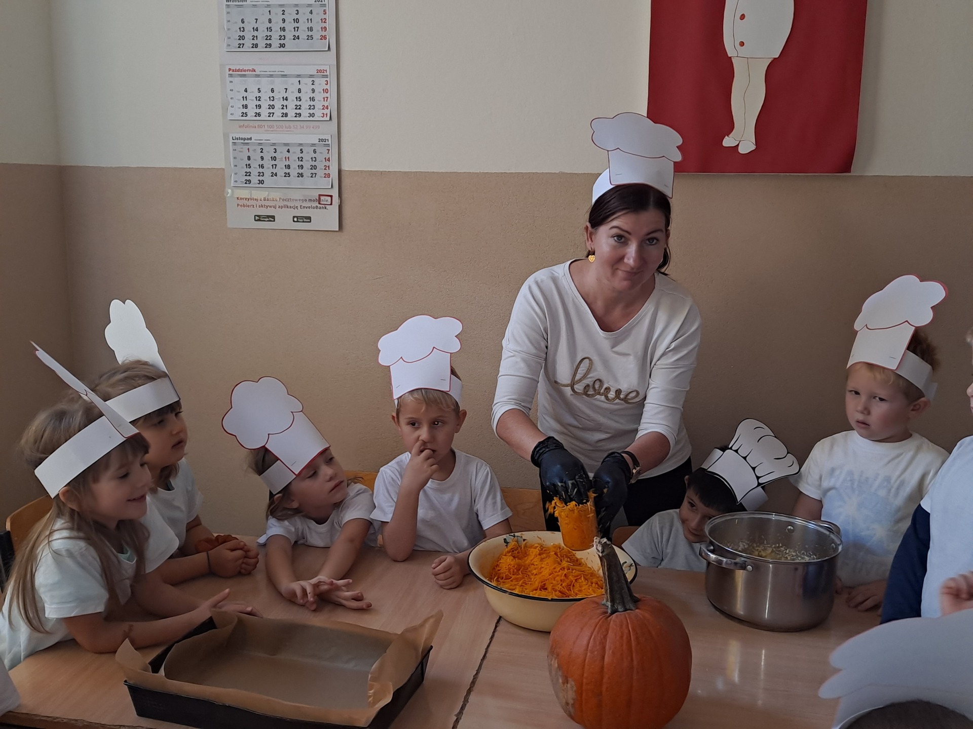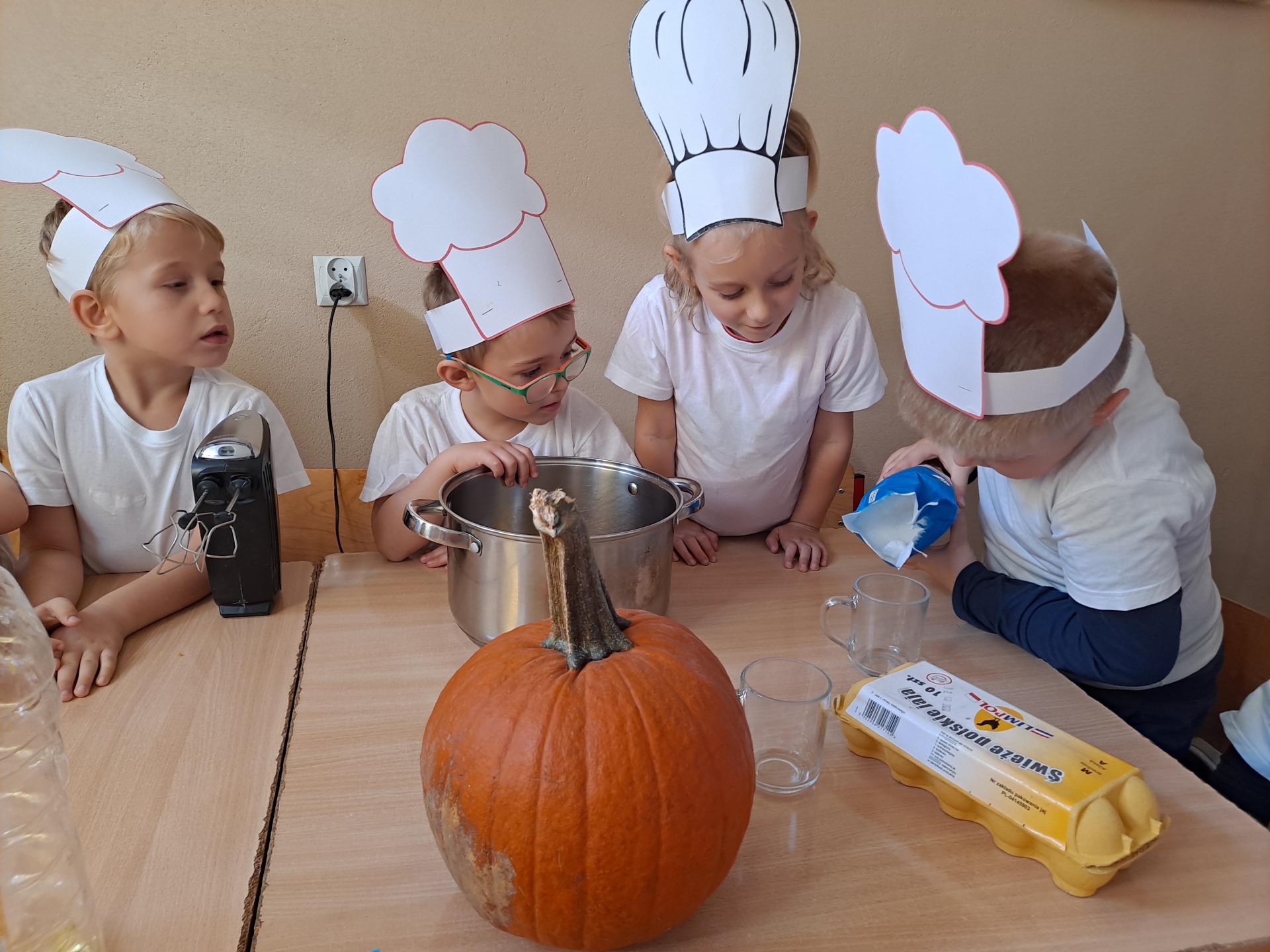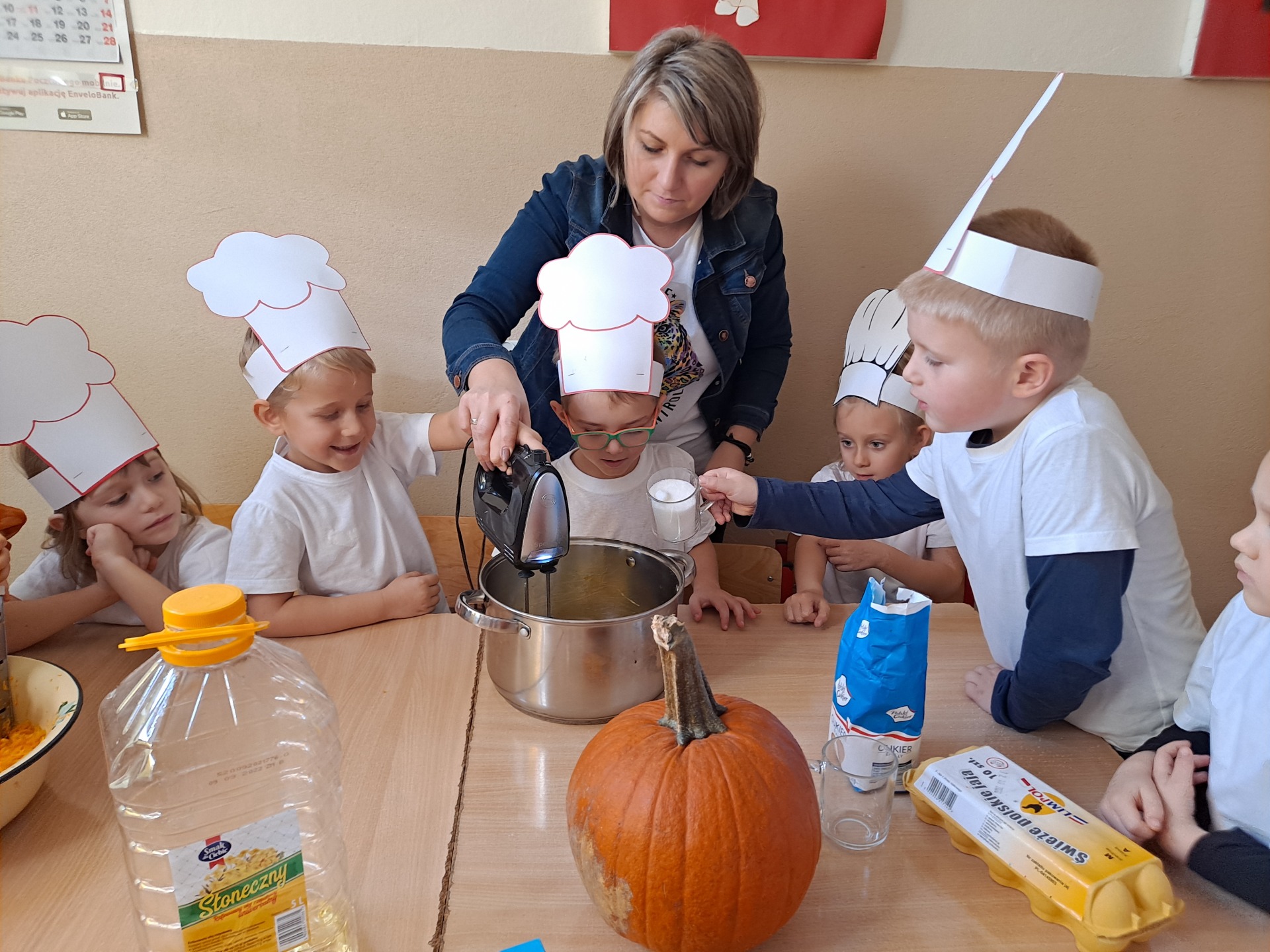 Dzień przed Świętem Dyni, Żabki zamieniły się w kucharzy i brały udział w zajęciach kulinarnych. Celem przeprowadzonych zajęć było nauczenie dzieci czerpania radości ze wspólnego przygotowywania posiłków i przede wszystkim wyrobienie nawyków zdrowego odżywiania. Wspólne przygotowywanie posiłków jest okazją do aktywnego i pożytecznego spędzania czasu. Po zapoznaniu z przepisem kulinarnym, Przedszkolaki razem z ciociami wykonały pyszne i zdrowe ciasto dyniowe 🙂