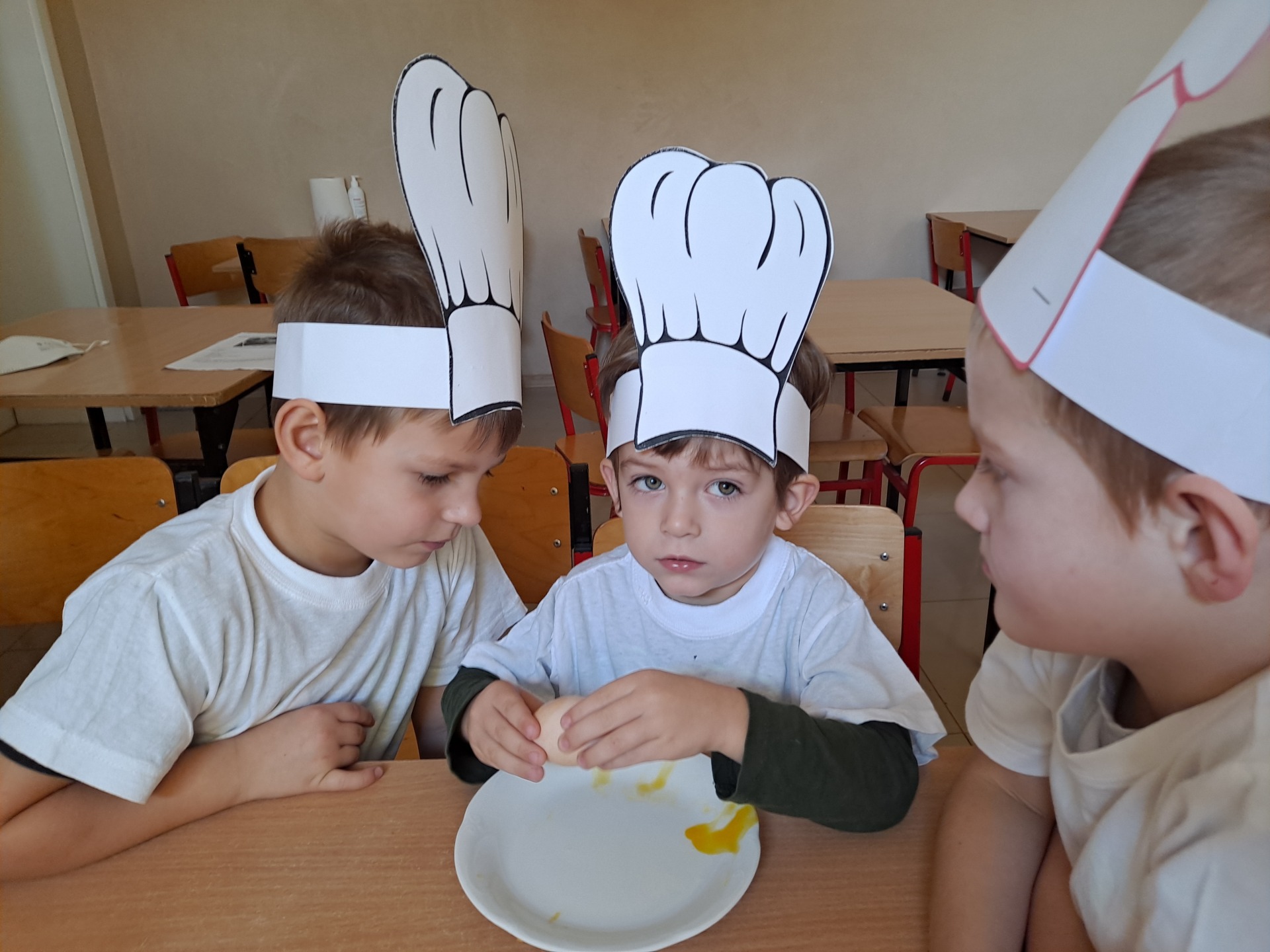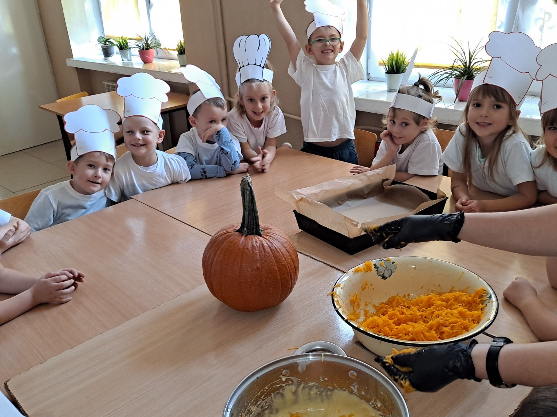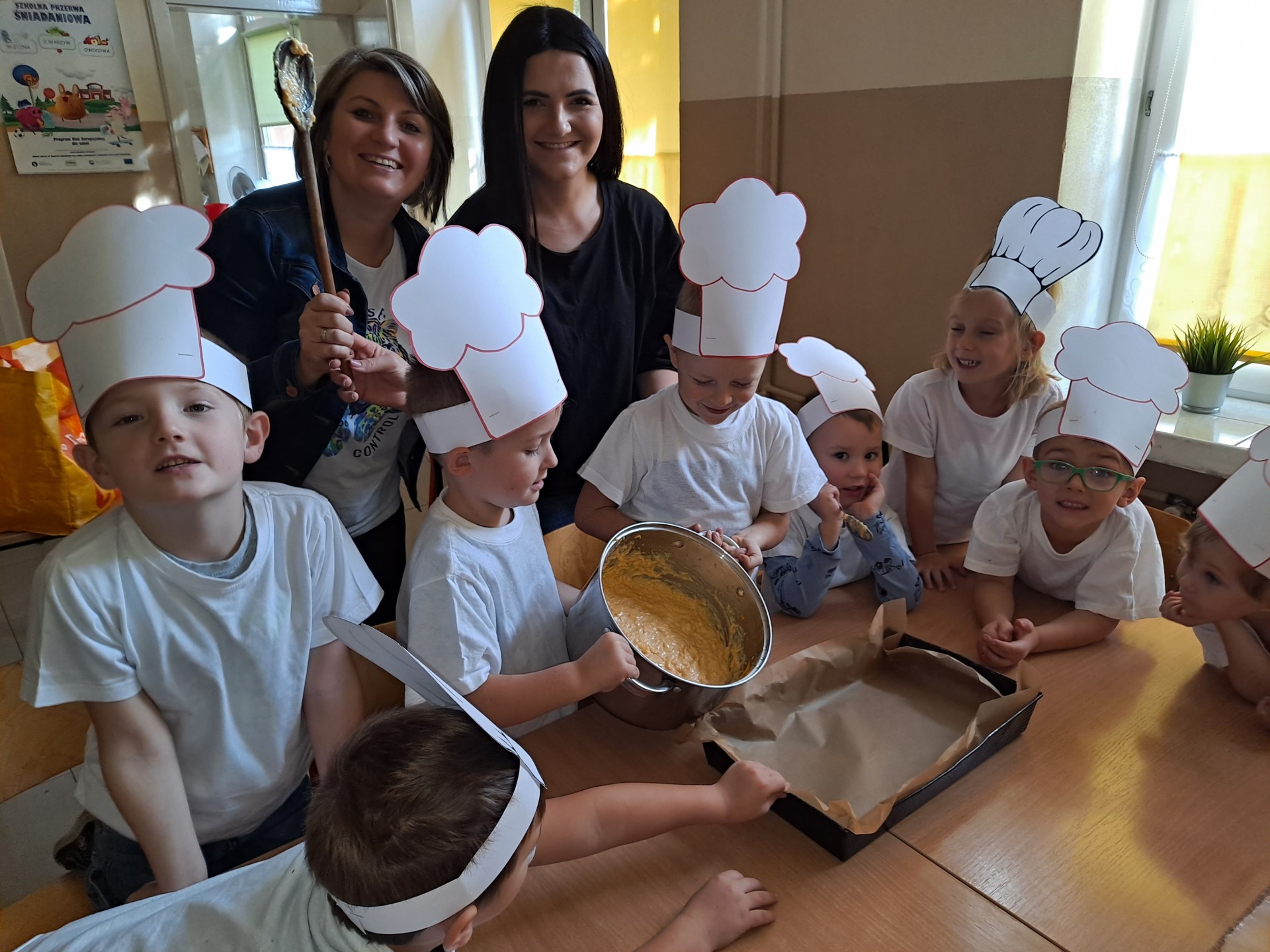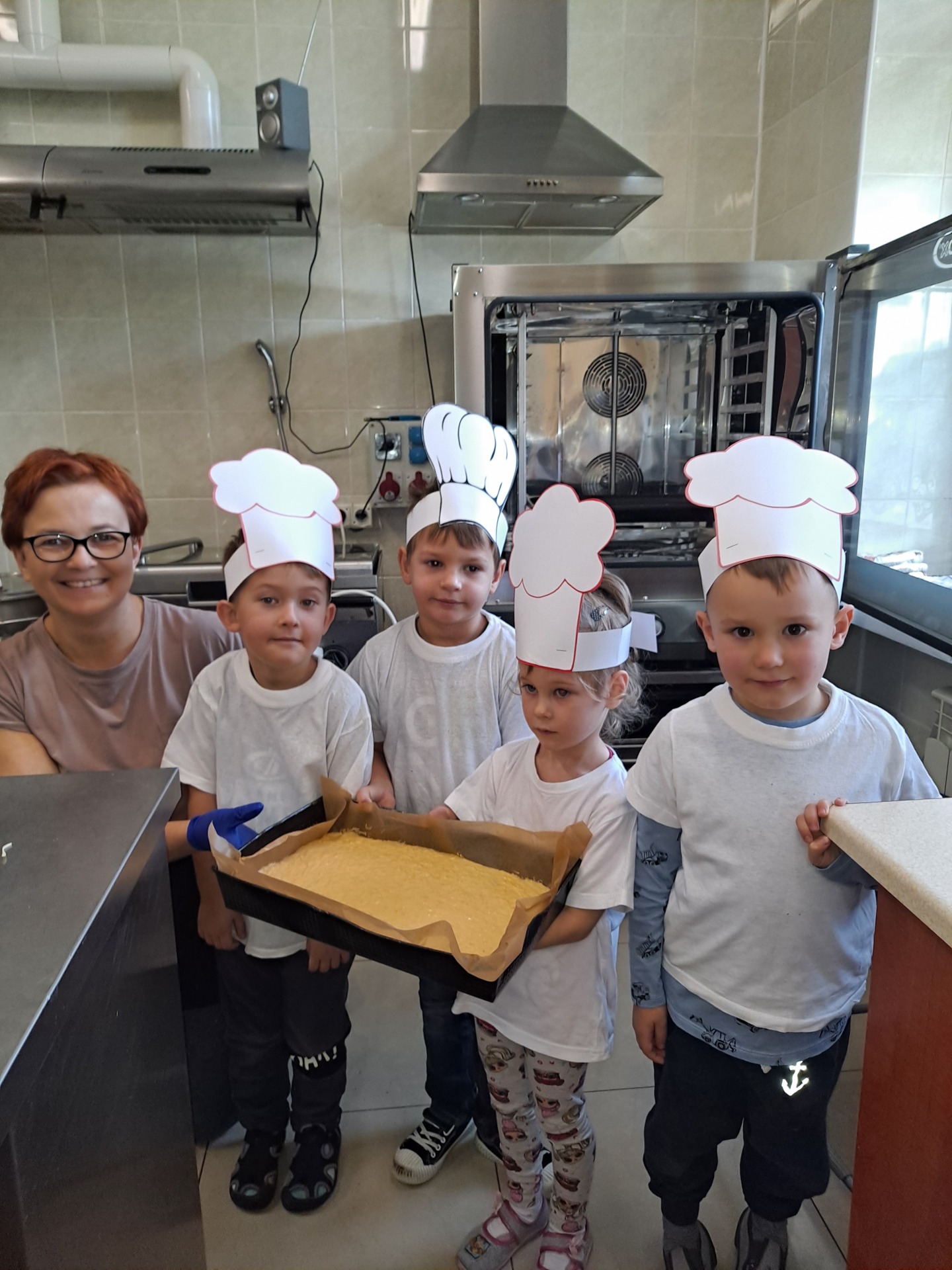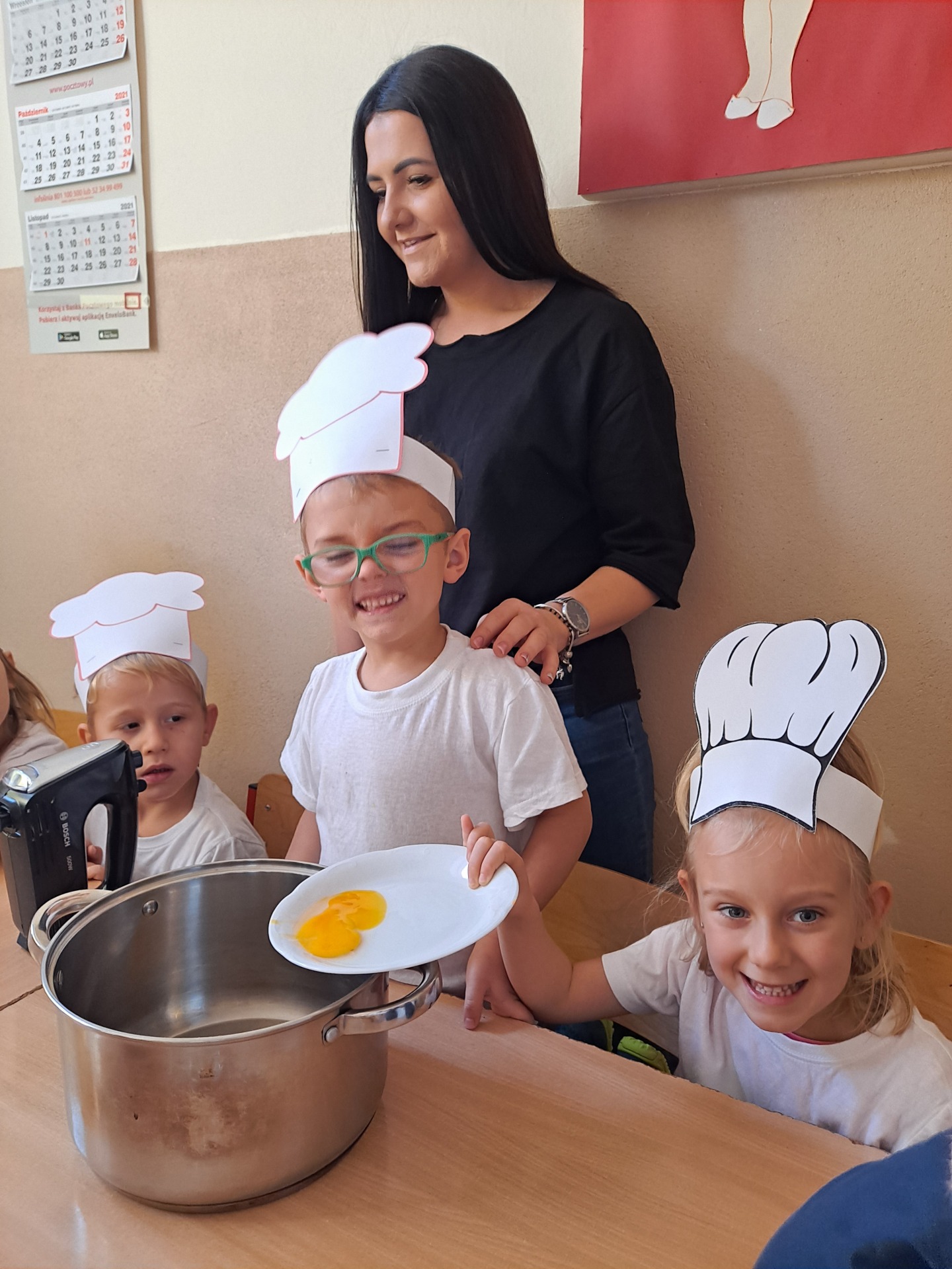 Dzień przed Świętem Dyni, Żabki zamieniły się w kucharzy i brały udział w zajęciach kulinarnych. Celem przeprowadzonych zajęć było nauczenie dzieci czerpania radości ze wspólnego przygotowywania posiłków i przede wszystkim wyrobienie nawyków zdrowego odżywiania. Wspólne przygotowywanie posiłków jest okazją do aktywnego i pożytecznego spędzania czasu. Po zapoznaniu z przepisem kulinarnym, Przedszkolaki razem z ciociami wykonały pyszne i zdrowe ciasto dyniowe 🙂